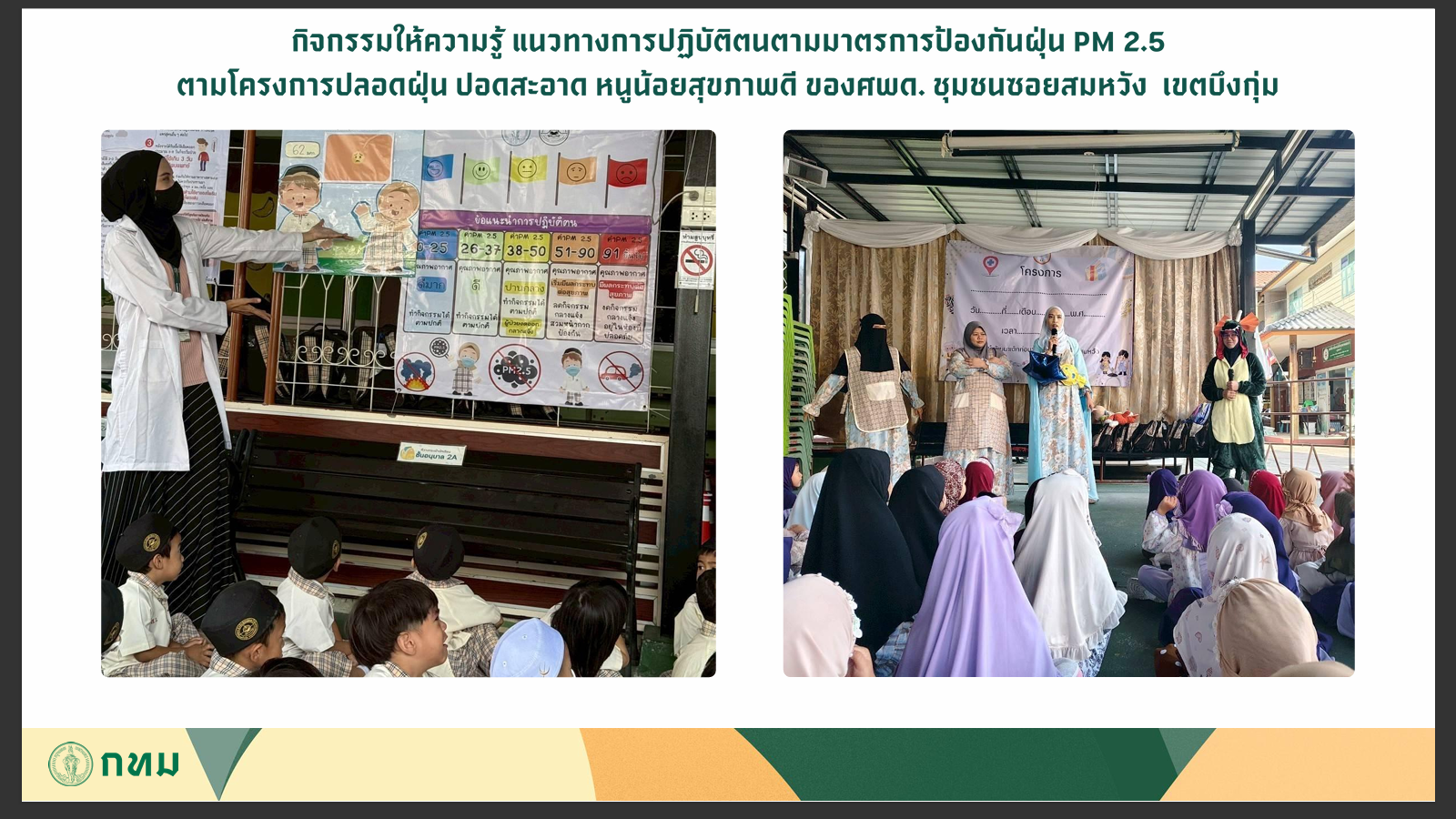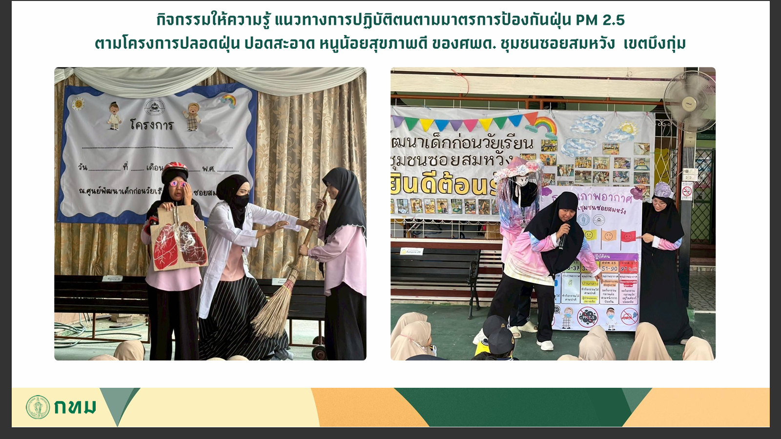 ทั้งนี้ สำนักพัฒนาสังคม ได้ลงพื้นที่ ศพด. ในการสำรวจปัญหา รับทราบความต้องการ และให้ความช่วยเหลือในการเขียนโครงการ เพื่อให้มั่นใจว่าการดำเนินงานเป็นไปตามมาตรฐานที่กำหนด พร้อมทั้งขอความร่วมมือให้มีการรายงานข้อมูลเข้าสู่ระบบอย่างสม่ำเสมอ เพื่อให้การติดตามเป็นไปอย่างถูกต้องและเป็นปัจจุบัน ซึ่งปัจจุบันมี ศพด. ชุมชนซอยสมหวัง เขตบึงกุ่ม ที่ดำเนินโครงการนำร่องแล้วเสร็จ โดยมีการติดตั้งเครื่องฟอกอากาศและจัดกิจกรรมให้ความรู้ แนวทางการปฏิบัติตนตามมาตรการการป้องกันฝุ่น PM 2.5 ตามโครงการปลอดฝุ่น ปอดสะอาด หนูน้อยสุขภาพดี
