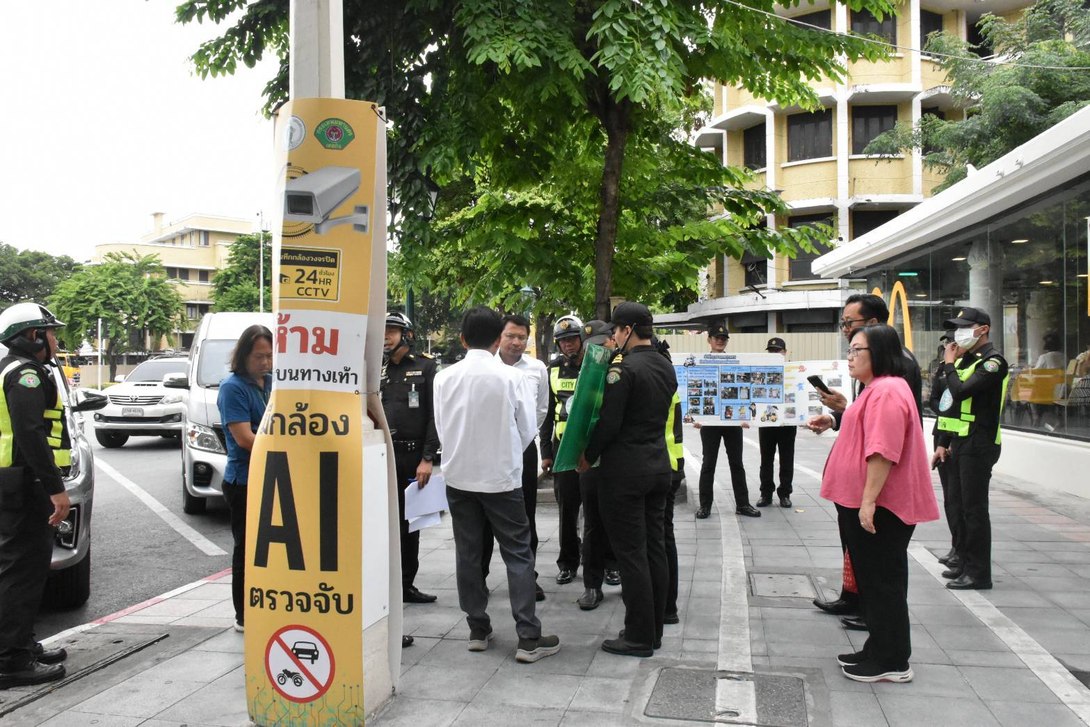 ตรวจจุดติดตั้งกล้อง CCTV จับภาพอัจฉริยะผ่านระบบ BMA AI CAMERA บริเวณหน้าร้านแมคโดนัลด์ ถนนราชดำเนินกลาง ซึ่งเขตฯ มีจุดติดตั้งกล้อง CCTV จำนวน 2 จุด ได้แก่ 1.บริเวณหน้าร้านแมคโดนัลด์ ถนนราชดำเนินกลาง 2.หน้าวิทยาลัยเพาะช่าง มหาวิทยาลัยเทคโนโลยีราชมงคลรัตนโกสินทร์ เพื่อตรวจจับผู้กระทำความผิดขับขี่รถจักรยานยนต์บนทางเท้า กวดขันวินัยจราจรเปรียบเทียบปรับแก่ผู้ฝ่าฝืนนำรถยนต์ขึ้นมาจอดหรือขับขี่รถจักรยานยนต์บนทางเท้า จากนั้นติดตามการจัดระเบียบวินรถจักรยานยนต์สาธารณะ บริเวณหน้าโรงเรียนสตรีวิทยา ผู้ขับขี่ 4 คน เขตฯ มีวินรถจักรยานยนต์สาธารณะในพื้นที่ 117 วิน ผู้ขับขี่ 450 คน เป็นวินรถจักรยานยนต์สาธารณะต้นแบบ 12 วิน ซึ่งเขตฯ จะต้องตรวจความเรียบร้อยตามแบบประเมินวินรถจักรยานยนต์สาธารณะอย่างต่อเนื่อง หากพบว่ามีข้อใดไม่เรียบร้อยให้แจ้งข้อบกพร่องแก่ผู้ขับขี่ เพื่อดำเนินการแก้ไขให้ถูกต้องเรียบร้อย โดยแบบประเมินวินรถจักรยานยนต์สาธารณะ ประกอบด้วย 1.ด้านความสะอาด ได้แก่ สถานที่ตั้งวินและโดยรอบต้องมีความสะอาด ไม่มีการตอกผูกยึดโยง 2.ด้านความเป็นระเบียบเรียบร้อย ได้แก่ จอดรถจักรยานยนต์เป็นระเบียบ ไม่กีดขวางทางเท้าหรือพื้นผิวจราจร ตั้งวางม้านั่งเป็นระเบียบ 3.ด้านกฎหมาย ได้แก่ การแต่งกายถูกต้องตามที่กฎหมายกำหนด เสื้อวิน เบอร์เสื้อถูกต้องตามบัญชี ไม่ขับขี่บนทางเท้า ป้ายทะเบียนถูกต้อง สวมหมวกนิรภัย ป้ายอัตราค่าโดยสารถูกต้อง ไม่เก็บค่าโดยสารเกินราคา ไม่นำเสื้อวินไปเช่าช่วงต่อ 4.ด้านอื่น ๆ ได้แก่ ไม่ดื่มสุรา กริยามารยาทสุภาพ ทั้งนี้ รองผู้ว่าราชการกรุงเทพมหานคร ได้มอบหมายให้เขตฯ จัดระเบียบวินรถจักรยานยนต์สาธารณะให้เป็นระเบียบเรียบร้อย ตรวจตามแบบประเมินวินรถจักรยานยนต์สาธารณะอย่างเคร่งครัด เน้นย้ำผู้ขับขี่รถจักรยานยนต์สาธารณะให้ปฏิบัติตามระเบียบข้อบังคับที่กฎหมายกำหนด อาทิ การแต่งกาย ป้ายทะเบียนรถ อัตราค่าโดยสาร สถานที่ตั้งวิน วินัยจราจร