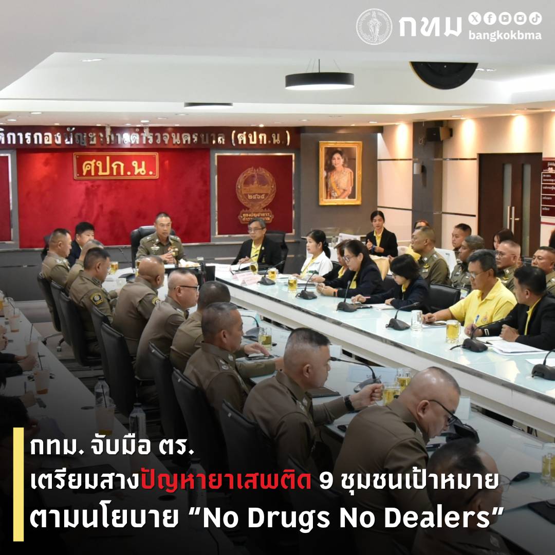 (30 ก.ค. 68) นายแพทย์สุนทร สุนทรชาติ รองปลัดกรุงเทพมหานคร พร้อมด้วย แพทย์หญิงดวงพร ปิณจีเสคิกุล รองผู้อำนวยการสำนักอนามัย และแพทย์หญิงดลจรัส ทิพย์มโนสิงห์ ผู้อำนวยการสำนักงานป้องกันและบำบัดการติดยาเสพติด เข้าร่วมการประชุมเตรียมความพร้อมการดำเนินการแก้ไขปัญหายาเสพติดในชุมชนตามรูปแบบการดำเนินงานแก้ไขปัญหายาเสพติดและการพัฒนาคุณภาพชีวิตของประชาชนพื้นที่ต้นแบบ (ท่าวังผาโมเดล) โดยมี พล.ต.ท.สยาม บุญสม ผู้บัญชาการตำรวจนครบาล (ผบช.น.) เป็นประธานการประชุม ณ ห้องประชุมปารุสกวัน 1 กองบัญชาการตำรวจนครบาล กรุงเทพมหานคร