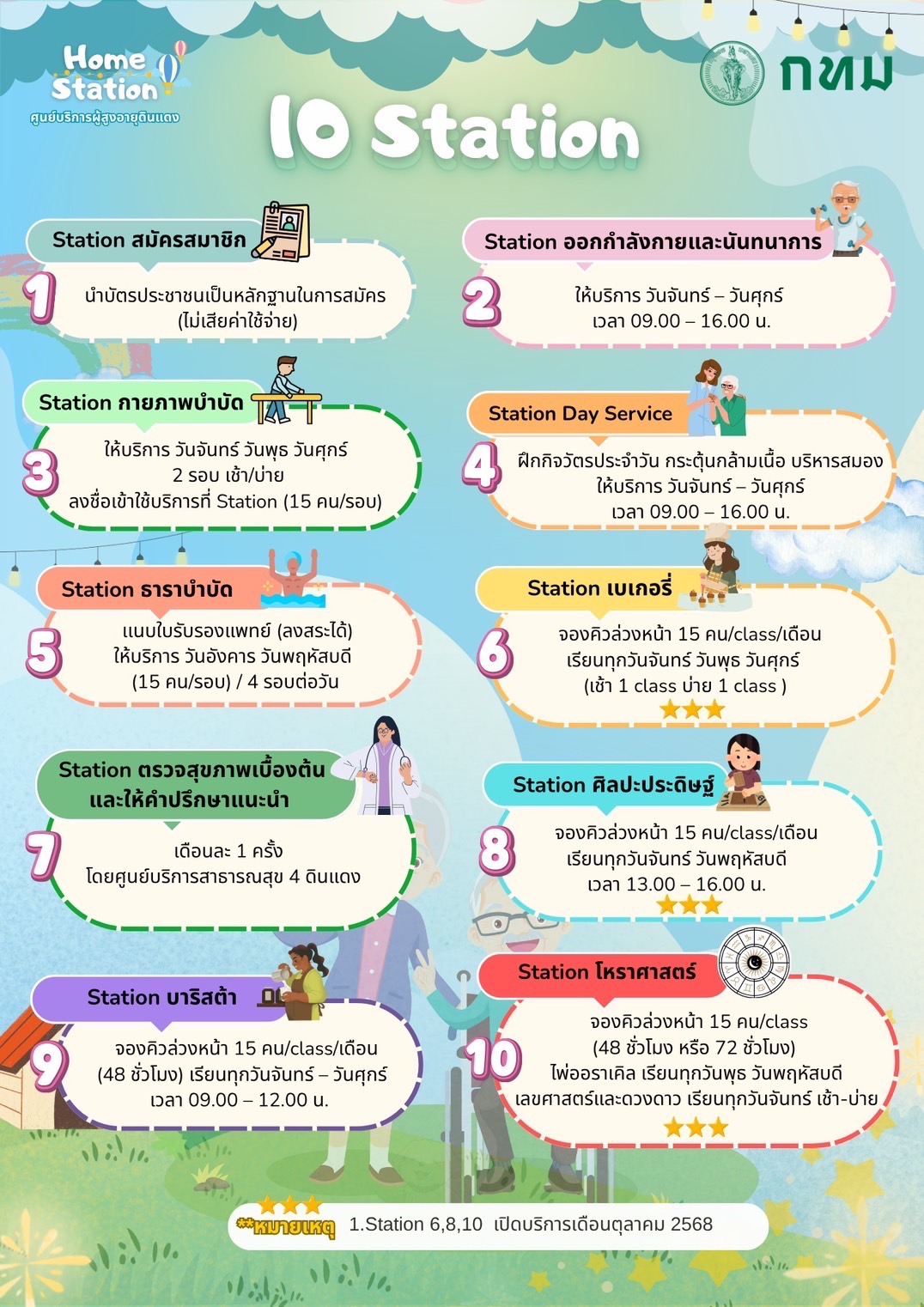 โดยกิจกรรม Home Station เป็นการแนะนำบริการและกิจกรรมต่าง ๆ เพื่อขยายฐานสมาชิกผู้สูงอายุของศูนย์บริการผู้สูงอายุดินแดงให้ครอบคลุมกลุ่มเป้าหมายซึ่งเป็นบิดา มารดา รวมถึงผู้สูงอายุในอุปการะของข้าราชการและลูกจ้างกรุงเทพมหานคร ให้เข้ามาใช้บริการ กิจกรรมประกอบด้วย 10 Station ได้แก่ 1. Station สมัครสมาชิก 2. Station ออกกำลังกายและนันทนาการ 3. Station กายภาพบำบัด 4. Station Day Service 5. Station ธาราบำบัด 6. Station เบเกอรี 7. Station ตรวจสุขภาพเบื้องต้นและให้คำปรึกษาแนะนำ 8. Station ศิลปะประดิษฐ์ 9. Station บาริสตา และ 10. Station โหราศาสตร์ (Station 6, 8 และ 10 เปิดบริการเดือนตุลาคม 2568)