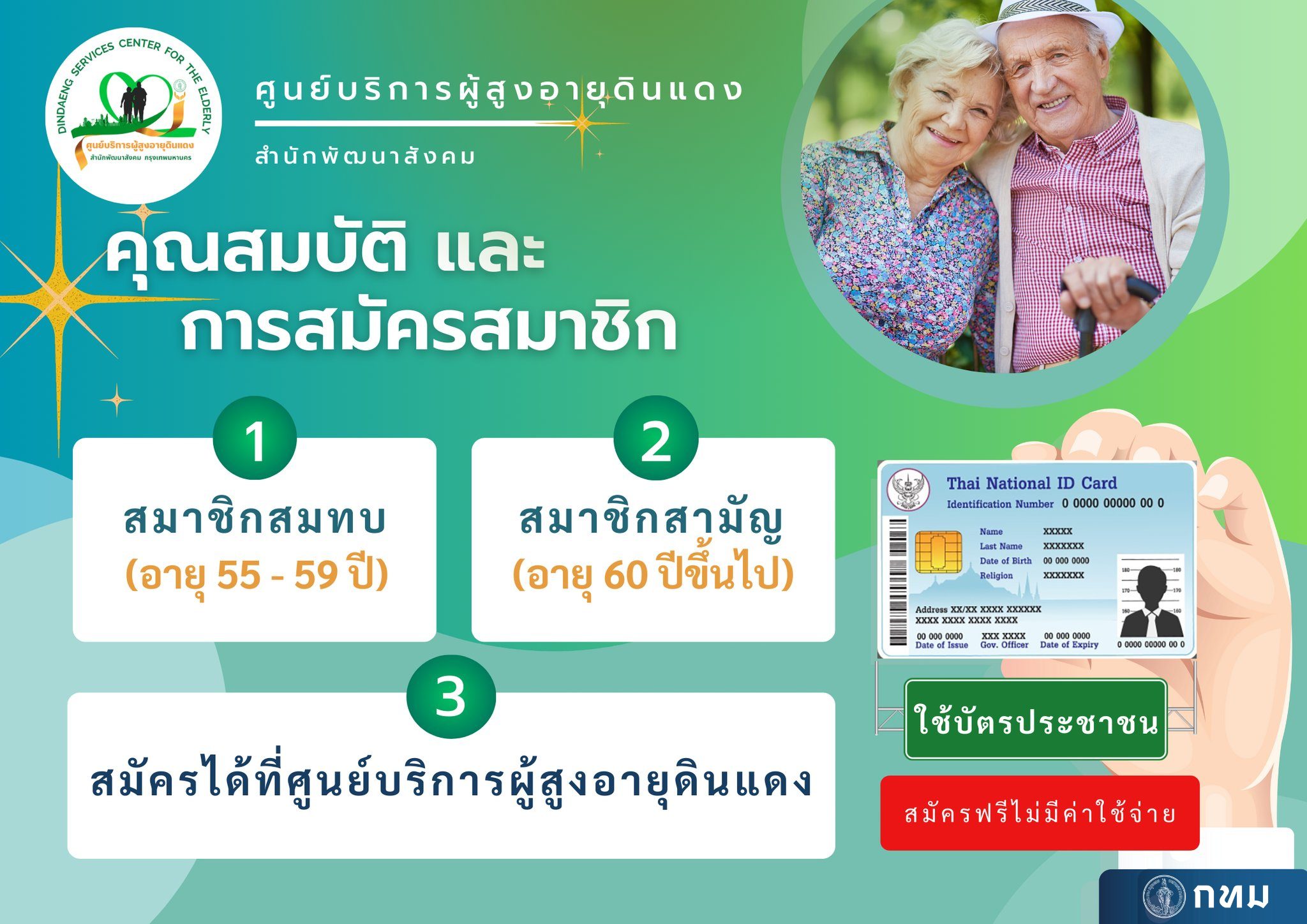 ในส่วนของผู้ที่มาใช้บริการที่ศูนย์ฯ จะแบ่งเป็น 2 ประเภท คือ 1. สมาชิกสมทบ สำหรับผู้สูงอายุเพศชายและหญิงที่มีอายุตั้งแต่ 55 – 59 ปี และ 2. สมาชิกสามัญ สำหรับผู้สูงอายุเพศชายและหญิงที่มีอายุตั้งแต่ 60 ปีขึ้นไป โดยการสมัครสมาชิกสามารถทำได้ที่ศูนย์บริการผู้สูงอายุดินแดง เพียงใช้บัตรประชาชนในการสมัครและไม่มีค่าใช้จ่ายใด ๆ