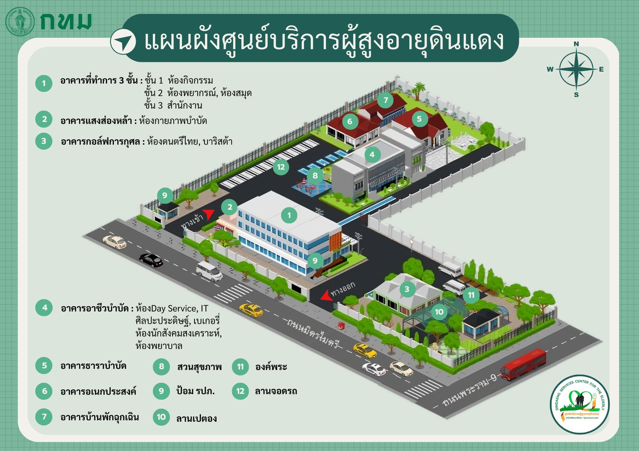 สำหรับศูนย์บริการผู้สูงอายุดินแดง เป็นศูนย์การจัดสวัสดิการทางสังคมสำหรับผู้สูงอายุอย่างครบวงจร ซึ่งดำเนินการโดยสำนักพัฒนาสังคม กรุงเทพมหานคร จัดตั้งขึ้นเพื่อส่งเสริมและพัฒนาศักยภาพให้ผู้สูงอายุมีสุขภาพกายและสุขภาพจิตที่ดี สามารถอยู่ร่วมกับครอบครัวและสังคมได้อย่างมีความสุข มีคุณค่า มีศักดิ์ศรี และยังเป็นแหล่งเรียนรู้ในการส่งเสริมและพัฒนาทักษะ เพื่อพัฒนาคุณภาพชีวิตของผู้สูงอายุให้เป็น “คลังปัญญา” แก่กรุงเทพฯ และเยาวชนต่อไป