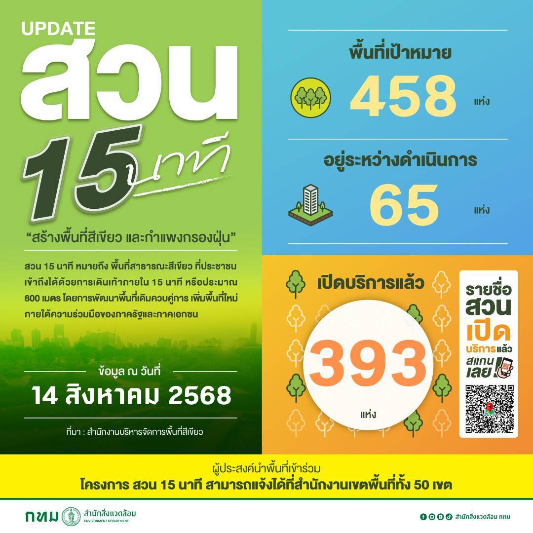 (15 ส.ค. 68) นายเอกวรัญญู อัมระปาล โฆษกของกรุงเทพมหานคร เปิดเผยว่า จากนโยบายสวน 15 นาทีทั่วกรุง ที่ผู้ว่าราชการกรุงเทพมหานคร กำหนดเป้าหมายในการพัฒนาไว้ โดยจะเพิ่มสวน 15 นาที จำนวน 500 แห่ง ภายในปี 2569 โดยเน้นประโยชน์ในการใช้งานจริง ประชาชนสามารถเข้าถึงได้ เป็นส่วนหนึ่งของชีวิตประจำวันของผู้คน ซึ่งจะเป็นการเพิ่มและกระจายโอกาสในการเข้าถึงพื้นที่สีเขียวของคนทุกกลุ่ม โดยปัจจุบัน ข้อมูล ณ วันที่ 14 ส.ค. 68 สวน 15 นาที ได้เปิดให้บริการแล้ว จำนวน 393 แห่ง กระจายอยู่ในทุกพื้นที่ของกรุงเทพมหานคร และมีอีก 65 แห่ง ที่อยู่ระหว่างการดำเนินการ ซึ่งจะทยอยเปิดให้บริการเพื่อเติมเต็มชีวิตเมือง ซึ่งสวน 15 นาทีแต่ละแห่ง จะได้รับการออกแบบให้สอดคล้องกับวิถีชีวิตชุมชน เช่น ลานพักผ่อน เครื่องออกกำลังกาย สนามเด็กเล่น หรือพื้นที่จัดกิจกรรม