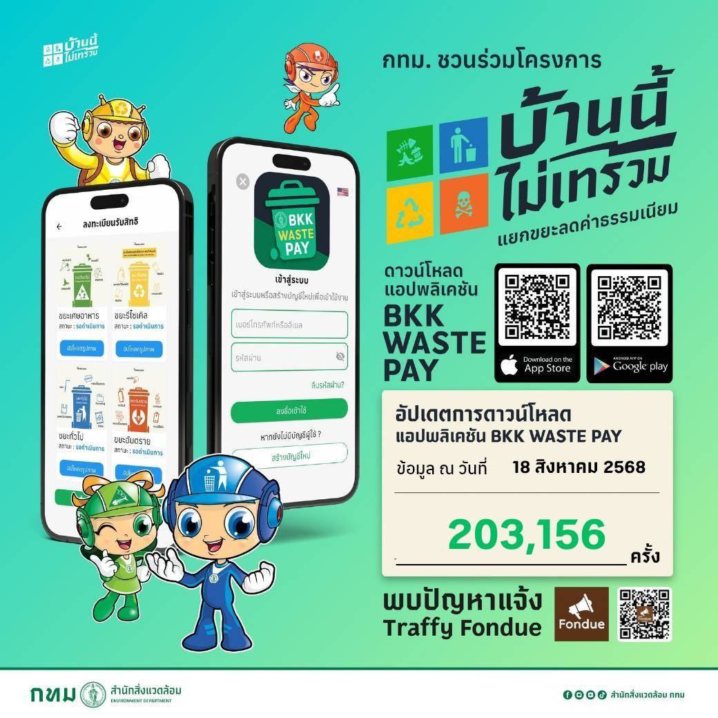 (18 ส.ค. 68) นายพรพรหม วิกิตเศรษฐ์ ที่ปรึกษาของผู้ว่าราชการกรุงเทพมหานคร และผู้บริหารด้านความยั่งยืนของกรุงเทพมหานคร เปิดเผยว่า ตามที่กรุงเทพมหานครเชิญชวนคนกรุงเทพฯ ร่วมโครงการบ้านนี้ไม่เทรวม : แยกขยะลดค่าธรรมเนียม ผ่านแอปพลิเคชัน BKK WASTE PAY เพื่อรับสิทธิ์ลดค่าธรรมเนียมขยะจาก 60 บาท เหลือเพียง 20 บาทต่อเดือน ตามข้อบัญญัติกรุงเทพมหานคร เรื่อง ค่าธรรมเนียมการให้บริการในการจัดการสิ่งปฏิกูลหรือมูลฝอยตามกฎหมายว่าด้วยการสาธารณสุข พ.ศ. 2568 ที่จะมีผลบังคับใช้ในเดือนตุลาคม 2568 ปัจจุบันมีประชาชนสมัครเข้าร่วมโคงการฯ แล้ว จำนวน 203,156 ครัวเรือน (ข้อมูล ณ วันที่ 18 ส.ค. 68) โดยยังสามารถเข้าร่วมโครงการฯ ได้อย่างต่อเนื่อง เพื่อร่วมกันสร้างโมเดลเมืองต้นแบบไม่เทรวม