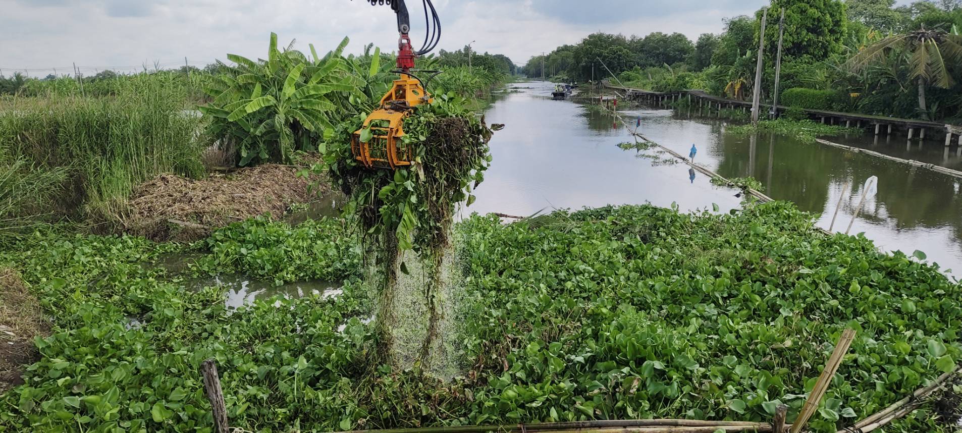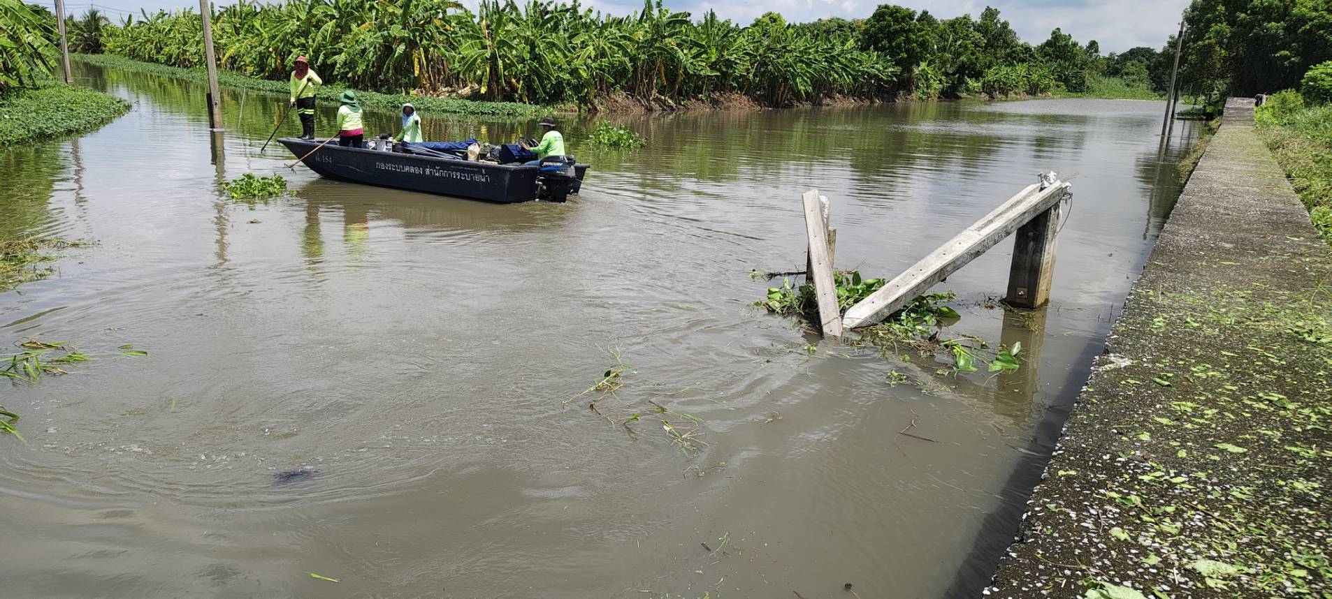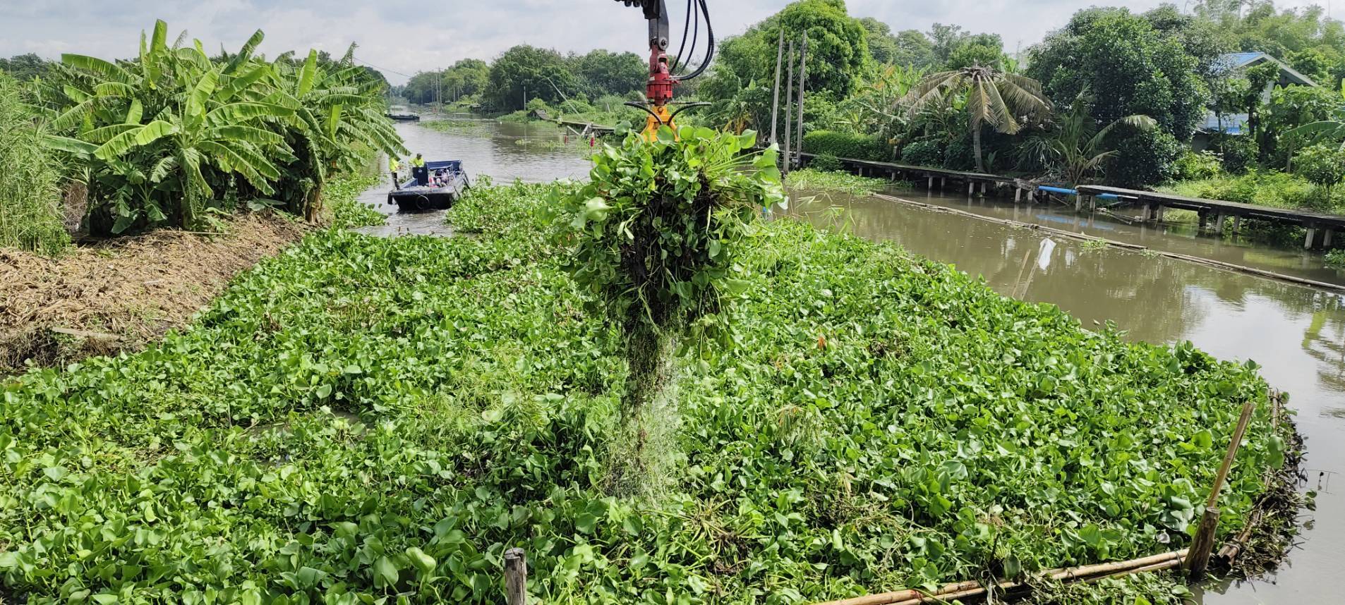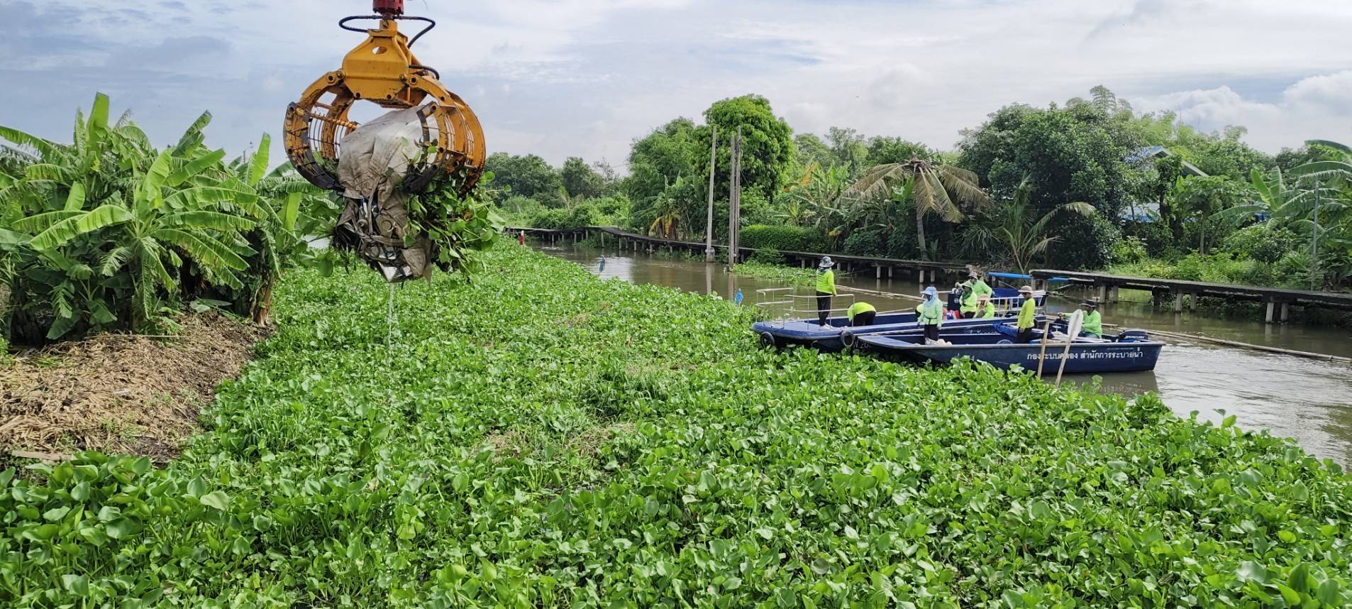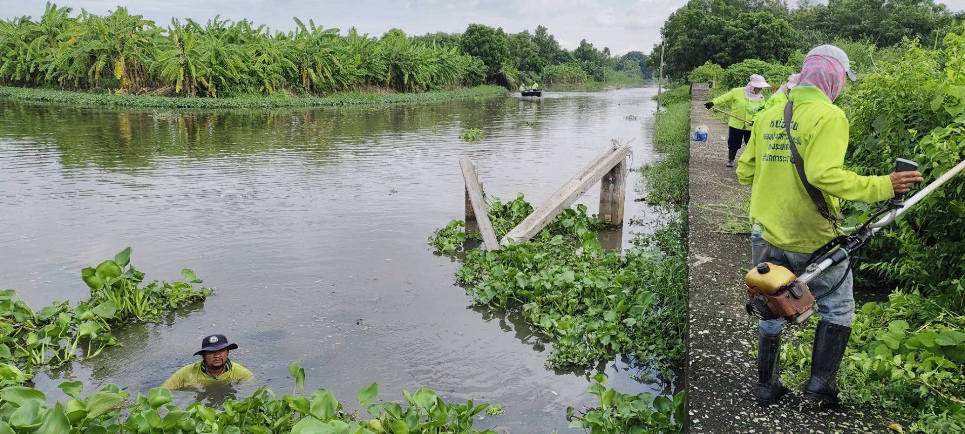 ทะเบียน 54-3217เรืออลูมิเนียมเรือ3ลำเจ้าหน้าที่22คนสนับสนุนจัดเก็บขยะวัชพืชคลองทับยาวบริเวณ สะพานทางรถไฟสายตะวันออกเขตลาดกระบัง