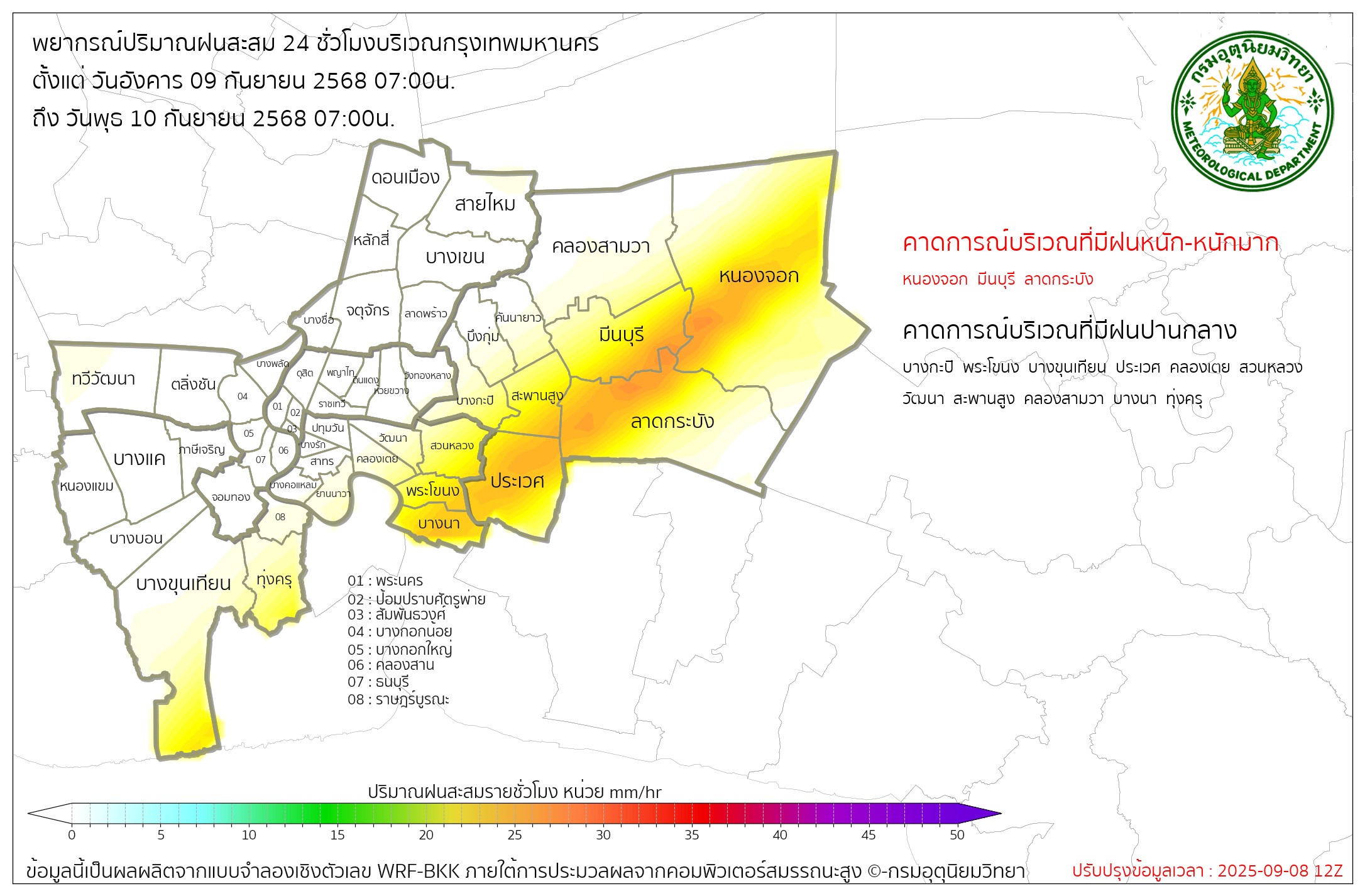 สำหรับพยากรณ์อากาศวันนี้ มีแนวฝนพาดผ่านกรุงเทพฯ คาดการณ์บริเวณที่มีฝนตกหนัก – หนักมาก เขตหนองจอก มีนบุรี ลาดกระบัง และบริเวณที่มีฝนปานกลาง เขตบางกะปิ พระโขนง บางขุนเทียน ประเวศ คลองเตย สวนหลวง วัฒนา สะพานสูง คลองสามวา บางนา ทุ่งครุ