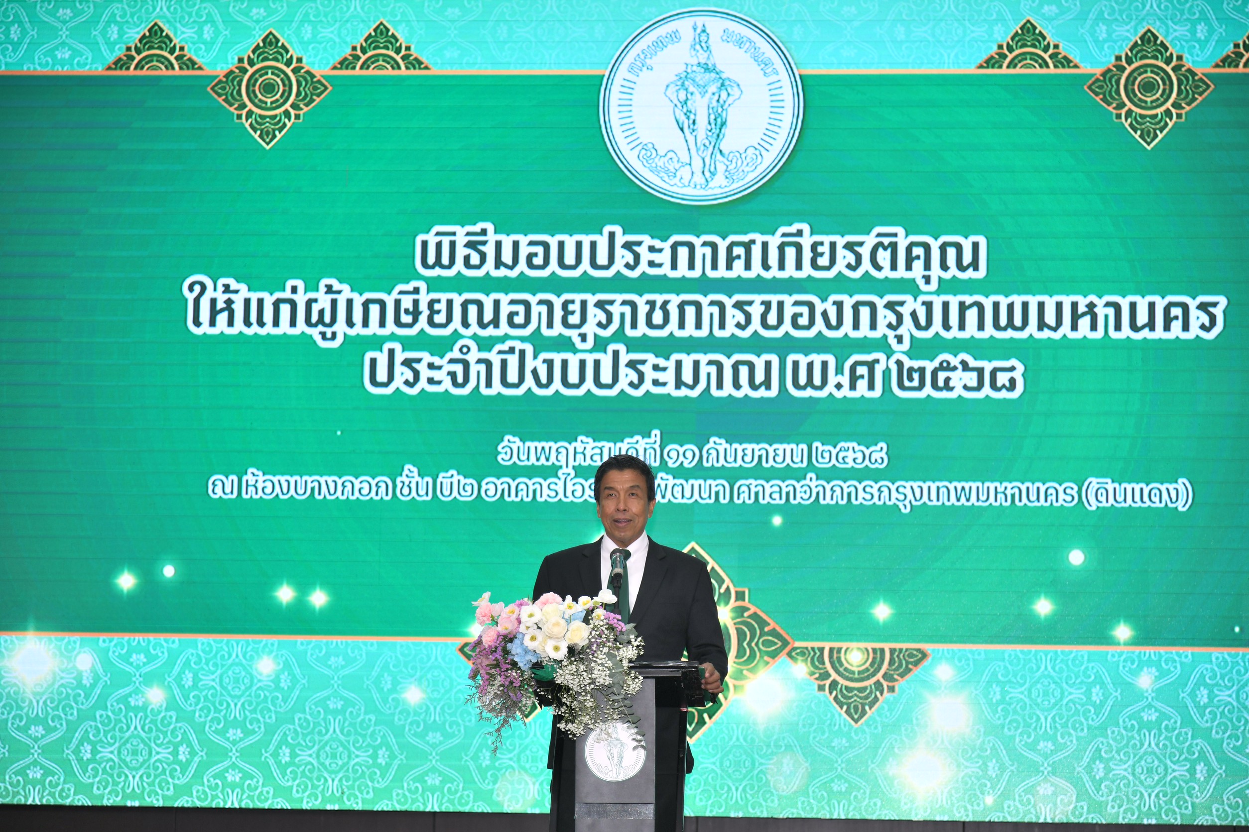 (11 ก.ย. 68) นายชัชชาติ สิทธิพันธุ์ ผู้ว่าราชการกรุงเทพมหานคร เป็นประธานในพิธีมอบประกาศเกียรติคุณให้แก่ผู้ที่เกษียณอายุราชการประจำปีงบประมาณ พ.ศ. 2568 ณ ห้องบางกอก ชั้น B2 อาคารไอราวัตพัฒนา ศาลาว่าการกรุงเทพมหานคร ดินแดง