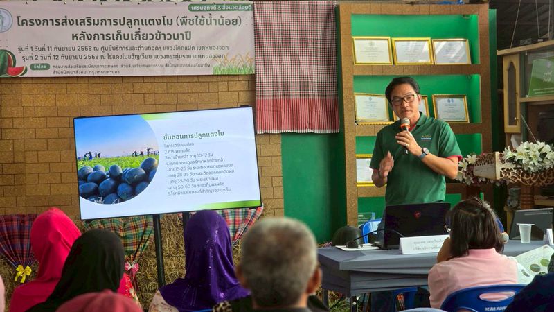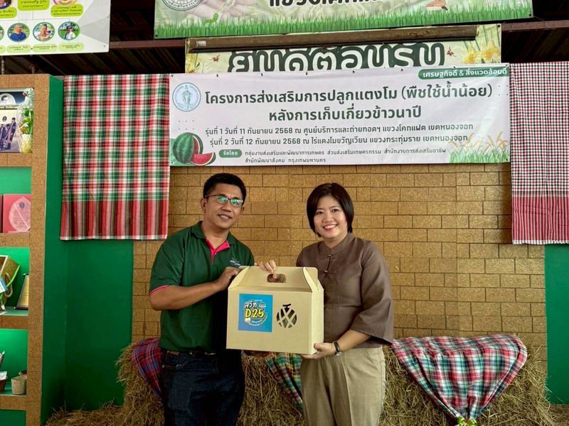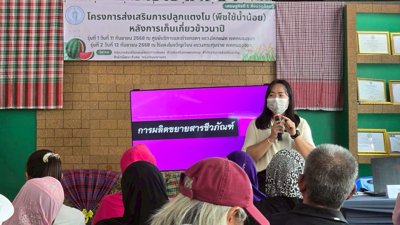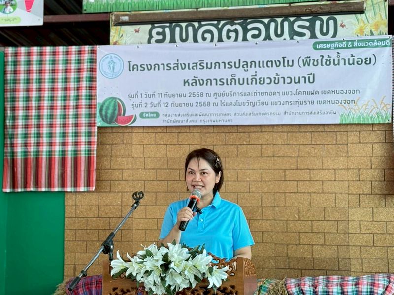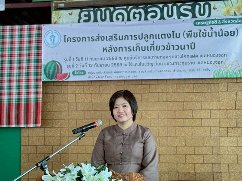 (11 ก.ย. 68) นางสาวดุษฎี สรวงขันธ์ รองผู้อำนวยการสำนักพัฒนาสังคม เป็นประธานเปิดโครงการส่งเสริมการปลูกแตงโม (พืชใช้น้ำน้อย) หลังการเก็บเกี่ยวข้าวนาปี รุ่นที่ 1 โดยนางสาวยุวนุช นงพรมมา ผู้อำนวยการเขตหนองจอก นางสาวรุ่งนภา ตรีแก้ว ผู้อำนวยการสำนักงานการส่งเสริมอาชีพ ผู้บริหารสำนักพัฒนาสังคม สำนักงานเขต เจ้าหน้าที่สำนักงานเกษตรพื้นที่ 1 ผู้เกี่ยวข้อง และเกษตรในพื้นที่ จำนวน 50 คน ร่วมพิธี ณ ศูนย์บริการและถ่ายทอดทางการเกษตร แขวงโคกแฝด เขตหนองจอก