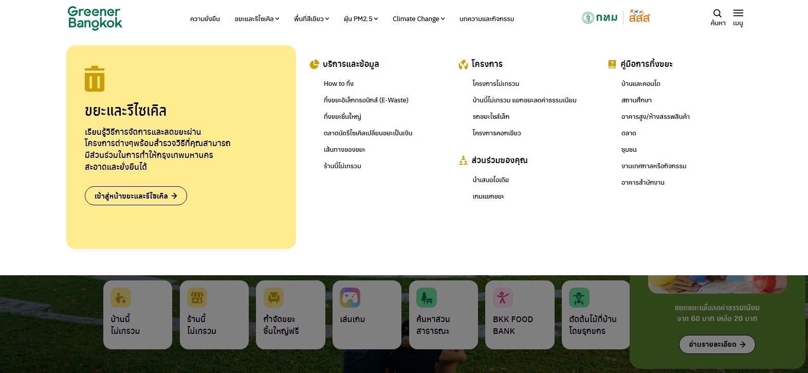 สำหรับเว็บไซต์ greenerbangkok.com เป็นโครงการในความร่วมมือระหว่าง กทม. สสส. และคณะสิ่งแวดล้อม มหาวิทยาลัยเกษตรศาสตร์ โดยมีภาคีร่วมให้ข้อมูลและร่วมพัฒนา คือ chula zero waste, ก้องกรีนกรีน, ลุงซาเล้ง, application green2get, we park, Kmutt, big tree project, environman, วันดีดี และ once in life โดยข้อมูลในเว็บไซต์ จะประกอบด้วยข้อมูลด้านสิ่งแวดล้อม อาทิ การบริหารจัดการขยะและการรีไซเคิล How to ทิ้งขยะแต่ละประเภทให้ถูกวิธี วิธีทิ้งขยะชิ้นใหญ่ คู่มือการทิ้งขยะสำหรับบ้านและคอนโดฯ สถานศึกษา ห้าง ตลาด ข้อมูลเรื่องฝุ่น PM 2.5 คู่มือการดูแลตัวเองจากฝุ่น PM 2.5 คลินิกมลพิษทางอากาศ ซึ่งเป็นบริการตรวจสุขภาพ และให้คำปรึกษาเกี่ยวกับปัญหาสุขภาพที่เกี่ยวข้องกับมลพิษทางอากาศ โดยเฉพาะข้อมูลเรื่อง Climate Change การเพิ่มพื้นที่สีเขียว ข้อมูลด้านความยั่งยืน อีกทั้งยังมีการแนะนำข้อมูลสวนสาธารณะ หรือพื้นที่สีเขียวใน กทม. รวมถึงกิจกรรมที่ทำได้ในพื้นที่ อาทิ นั่งเรือปั่นเป็ด เล่นกีฬาบาสเกตบอล ปั่นจักรยานฟิตเนส สระว่ายน้ำ หรือแบดมินตัน เป็นต้น