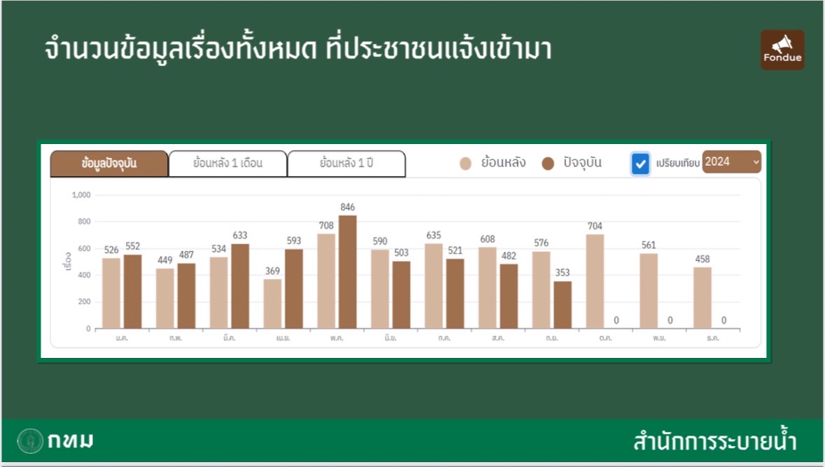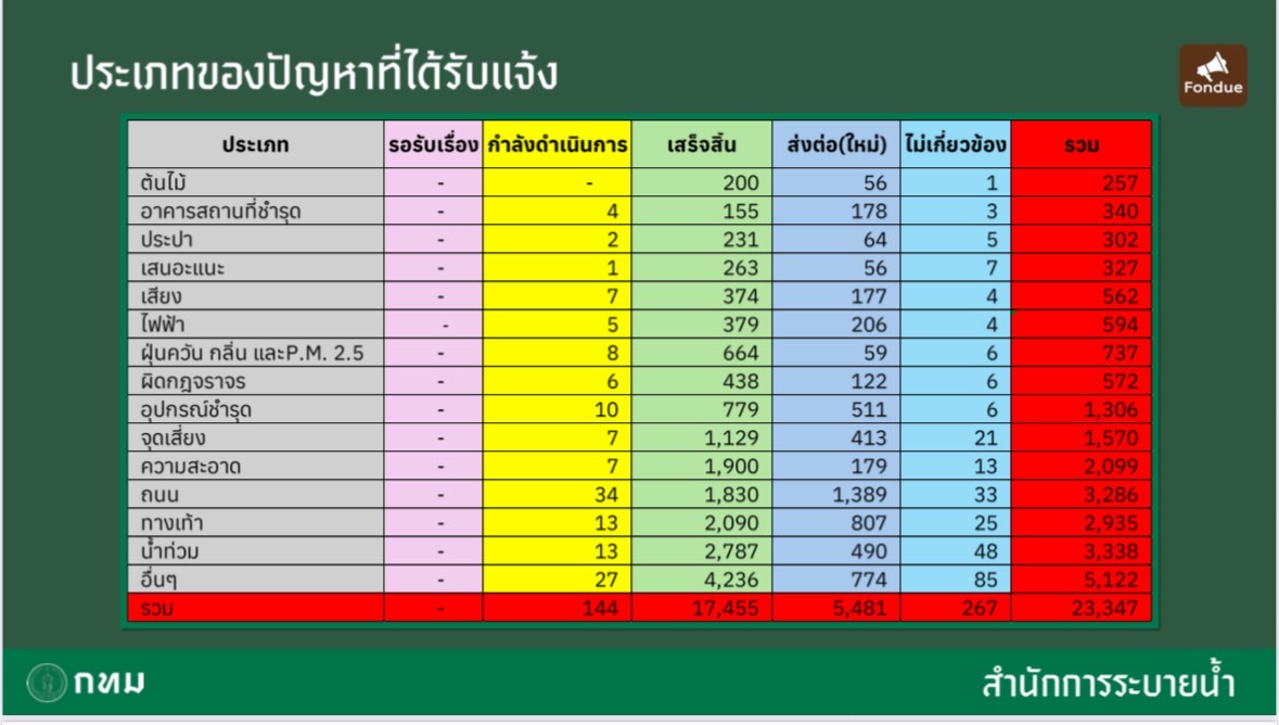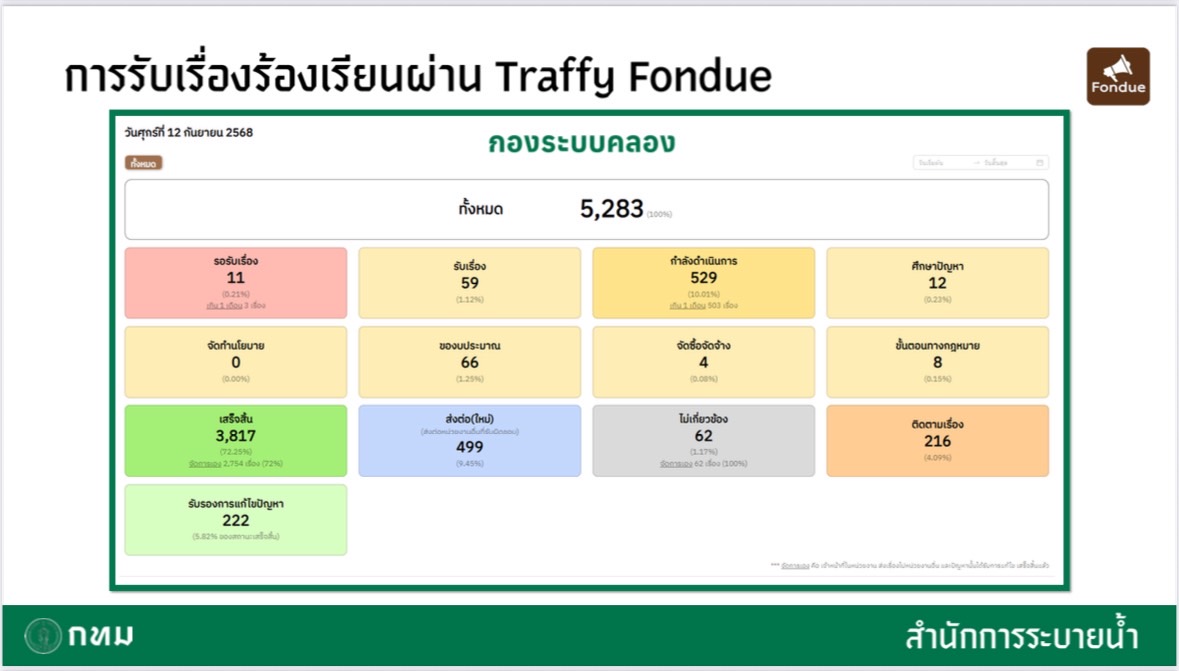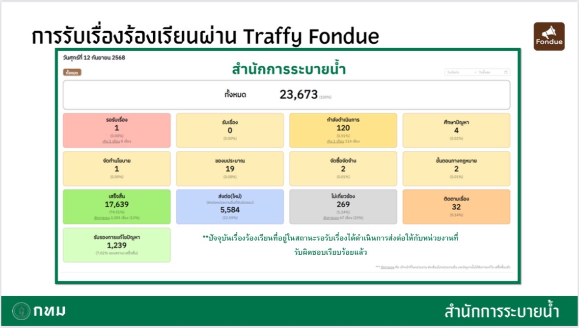 (13 ก.ย. 68) นายเอกวรัญญู อัมระปาล โฆษกของกรุงเทพมหานคร กล่าวถึงความสำคัญของ Traffy Fondue ว่า “ข้อมูลการร้องเรียนผ่าน Traffy Fondue ไม่ใช่แค่การแก้ปัญหาแบบเคสต่อเคสให้จบไป แต่เป็นการสร้างฐานข้อมูลเมืองขนาดใหญ่ที่เกิดจากการมีส่วนร่วมของประชาชน เช่น ปัญหาน้ำท่วม เราได้รับข้อมูลจุดอ่อน จุดเสี่ยงในพื้นที่ต่าง ๆ ของกรุงเทพมหานคร รวมถึงจุดฟันหลอตามแนวแม่น้ำเจ้าพระยา”