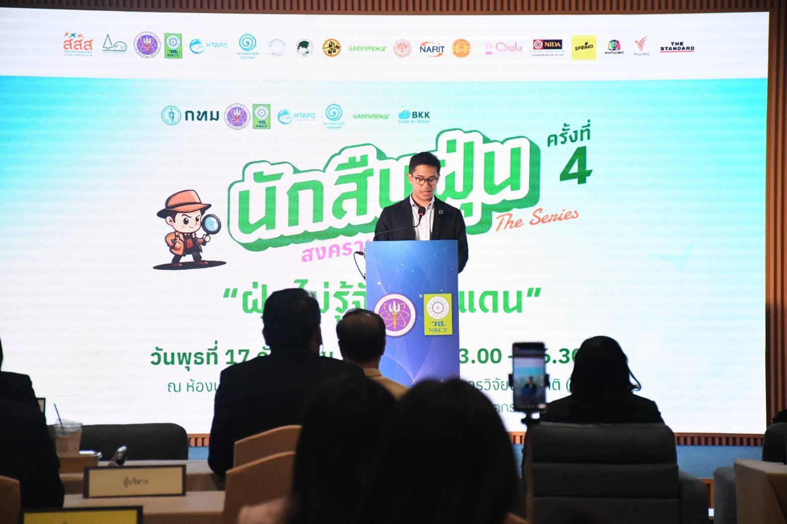 (17 ก.ย. 68) เวลา 13.00 น. นายพรพรหม วิกิตเศรษฐ์ ที่ปรึกษาของผู้ว่าราชการกรุงเทพมหานคร และผู้บริหารด้านความยั่งยืนของกรุงเทพมหานคร พร้อมด้วย ดร.วิภารัตน์ ดีอ่อง ผู้อำนวยการสำนักงานการวิจัยแห่งชาติ เปิดกิจกรรม “นักสืบฝุ่น The Series สงครามฝุ่นเมือง” ครั้งที่ 4 ค้นหาคำตอบ “ฝุ่นไม่รู้จักเขตแดน” โดยมี นายทศพล สุภารี รองผู้อำนวยการสำนักสิ่งแวดล้อม ร่วมกิจกรรม ณ ห้องประชุมจอมพลสฤษดิ์ ธนะรัชต์ ชั้น 2 อาคาร วช. 1 สำนักงานการวิจัยแห่งชาติ เขตบางเขน