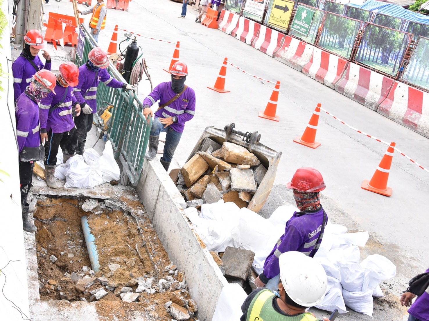 ส่วนเรื่องที่ฝนตกในช่วงนี้ยังไม่กระทบกับการทำงาน ยังสามารถเติมคอนกรีตและทรายลงในโพรงใต้ถนนได้ ทั้งนี้ ผู้ว่าฯ ชัชชาติ ย้ำว่า อย่างไรก็ตามความปลอดภัยเป็นสิ่งสำคัญที่สุด แม้การซ่อมอาจเสร็จเร็วหรือช้ากว่ากำหนดเล็กน้อยก็ไม่กระทบต่อการให้บริการของโรงพยาบาลและประชาชนในพื้นที่