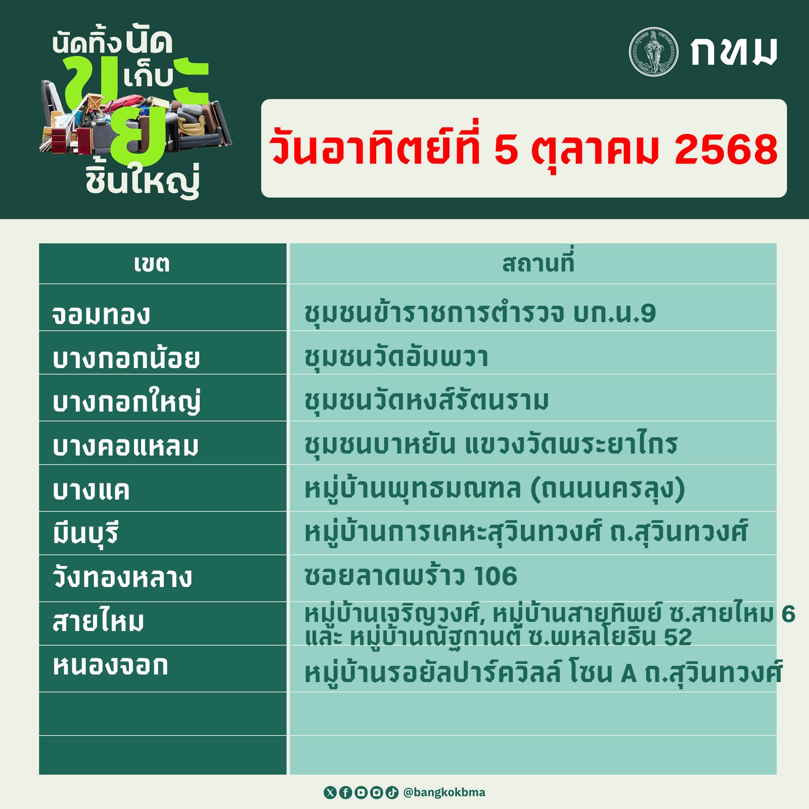 กทม.นัดทิ้ง นัดเก็บ ขยะชิ้นใหญ่ ประจำวันที่ 27-28 กันยายน 2568