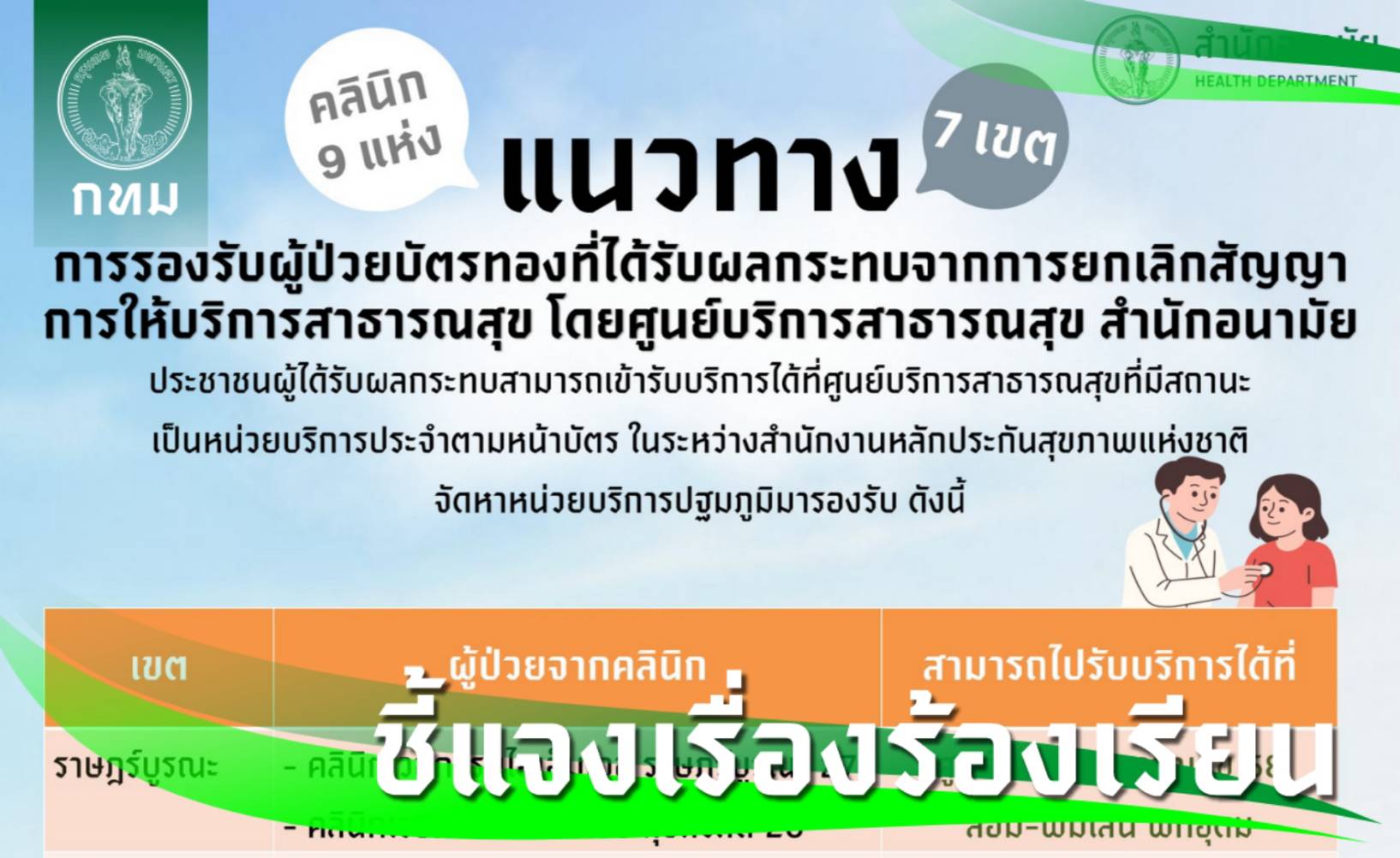 นางดวงพร ปิณจีเสคิกุล ผู้อำนวยการสำนักอนามัย (สนอ.) กทม. กล่าวถึงการเตรียมความพร้อมของศูนย์บริการสาธารณสุข กทม. ในการรองรับผู้ป่วยที่อยู่ในสิทธิบัตรทองในพื้นที่กรุงเทพฯ ที่ได้รับผลกระทบจากคลินิกชุมชนอบอุ่นและหน่วยบริการปฐมภูมิ โรงพยาบาลเอกชนขอถอนตัวจากระบบประกันสุขภาแห่งชาติว่า กรณีดังกล่าว สำนักงานหลักประกันสุขภาพแห่งชาติ (สปสช.) เขต 13 ประสานงานเพื่อรองรับผู้ป่วยสิทธิบัตรทอง หลังมีคลินิกชุมชนอบอุ่น 24 แห่ง และหน่วยบริการปฐมภูมิของโรงพยาบาลเอกชน 25 แห่ง ประกาศถอนตัวออกจากระบบบัตรทองตั้งแต่วันที่ 1 ต.ค. 68 ซึ่งส่งผลกระทบต่อประชาชนจำนวนมาก ศูนย์บริการสาธารณสุข กทม. ยังคงเป็นหน่วยบริการประจำให้กับประชาชน 51,874 คน ที่ได้รับผลกระทบ พร้อมให้การดูแลรักษาในระหว่างที่ สปสช. อยู่ระหว่างจัดหาหน่วยบริการปฐมภูมิมารองรับ โดยได้จัดทำสื่อประชาสัมพันธ์ในรูปแบบอินโฟกราฟิกเผยแพร่ผ่านเว็บไซต์และเพจเฟซบุ๊กของ สนอ. รวมถึงช่องทางของศูนย์บริการสาธารณสุขทุกแห่ง เพื่อสร้างการรับรู้แก่ประชาชนอย่างทั่วถึง