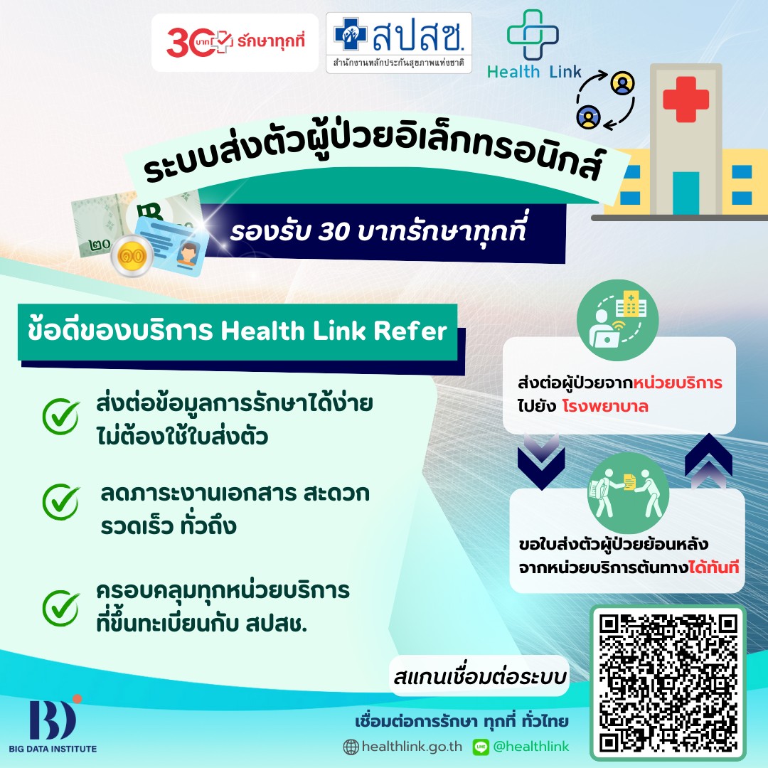 ทั้งนี้ กทม. ได้ดำเนินโครงการจัดทำระบบดิจิทัลและเทคโนโลยี เพื่อเชื่อมโยงข้อมูลสุขภาพทั่วประเทศ (Health Information Exchange: Health Link) ร่วมกับสถาบันข้อมูลขนาดใหญ่ (องค์การมหาชน) เพื่อเชื่อมโยงข้อมูลสุขภาพผ่านระบบดิจิทัลในพื้นที่กรุงเทพฯ ให้ประชาชนสามารถเข้าถึงระบบบริการทางการแพทย์และสาธารณสุขได้อย่างไร้รอยต่อ ด้วยความร่วมมือระหว่างโรงพยาบาล (รพ.) สังกัด กทม. รพ.สังกัดกระทรวงสาธารณสุข ศูนย์บริการสาธารณสุข กทม. 69 แห่ง คลินิกชุมชนอบอุ่น และหน่วยนวัตกรรมในพื้นที่ หน่วยบริการทุกระดับสามารถเชื่อมโยงข้อมูลสุขภาพของผู้ป่วย อาทิ ข้อมูลการรักษา การแพ้ยา และการทำหัตถการ เพื่อเพิ่มประสิทธิภาพการรักษาพยาบาล การติดตามอาการ ลดความซ้ำซ้อนการจ่ายยา และสนับสนุนการส่งต่อระหว่างหน่วยบริการต่าง ๆ ช่วยเพิ่มความสะดวกการเข้าถึงบริการได้อย่างรวดเร็ว และมีคุณภาพ โดยปัจจุบันศูนย์บริการสาธารณสุขทั้ง 69 แห่งของ กทม. สามารถเข้าใช้งานผ่านระบบ Health Link ได้