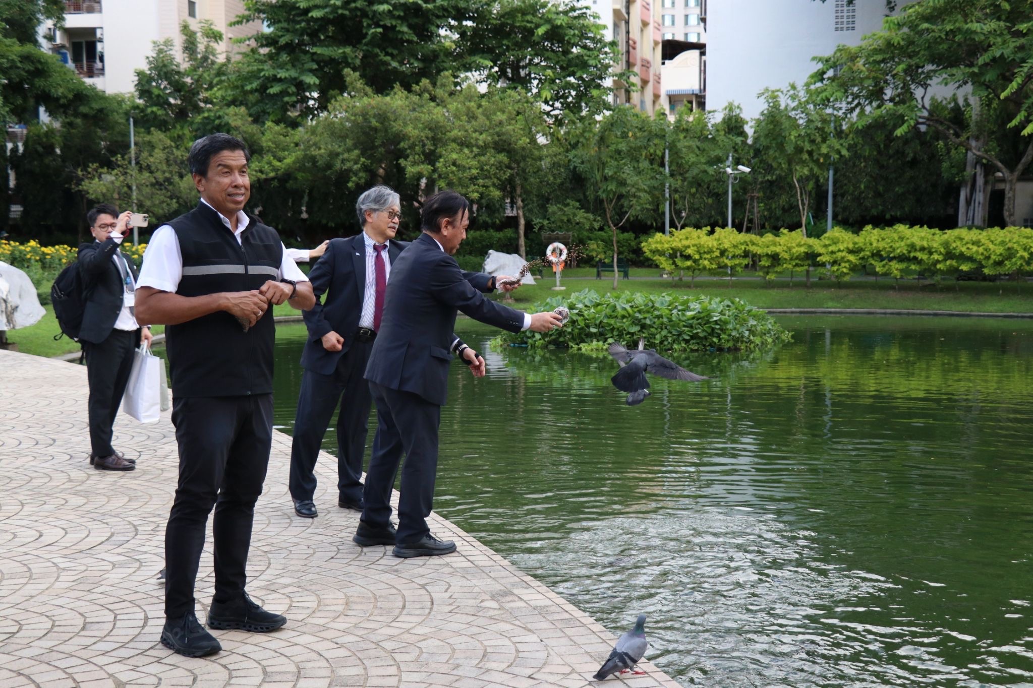ทั้งนี้ ผู้ว่าราชการกรุงเทพมหานครได้นำคณะเยี่ยมชมสวนสันติภาพในบรรยากาศเป็นกันเอง และถ่ายภาพร่วมกันบริเวณสระน้ำซึ่งประดับด้วยประติมากรรมแห่งสันติภาพ ซึ่งอยู่คู่กับสวนตั้งแต่เปิดให้บริการ และเป็นสัญลักษณ์เพื่อรำลึกถึงการสิ้นสุดสงครามโลกครั้งที่สอง