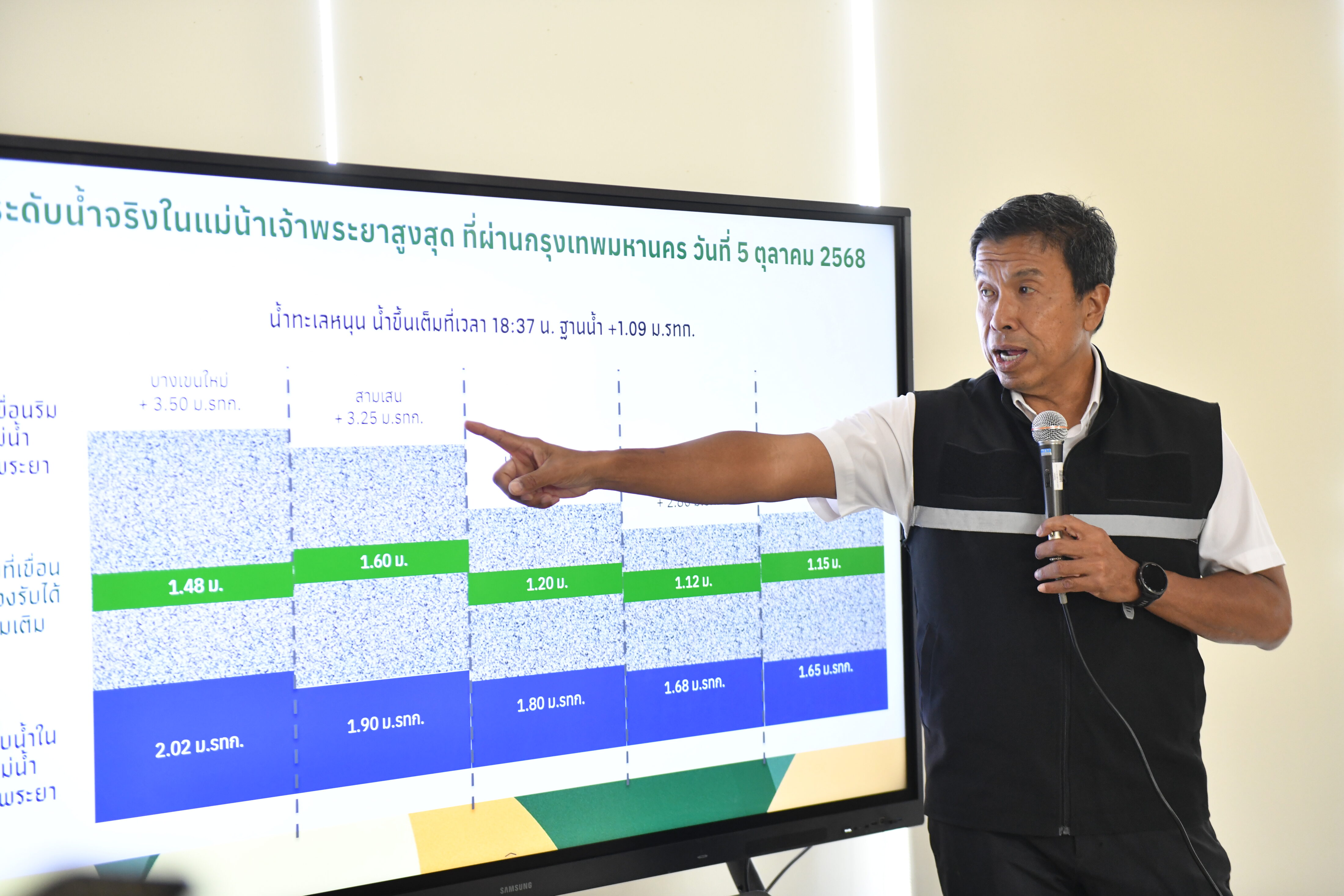 ทั้งนี้ สำนักการระบายน้ำ กรุงเทพมหานคร แจ้งสภาวะระดับน้ำในแม่น้ำเจ้าพระยาบริเวณกองบัญชาการกองทัพเรือ (กรุงเทพมหานคร) และพื้นที่ใกล้เคียงในช่วงวันที่ 9-12 ตุลาคม 2568 เป็นช่วงที่ระดับน้ำทะเลหนุนสูง ฐานน้ำทะเล ระดับ +1.18 ถึง +1.20 เมตร จากระดับน้ำทะเลปานกลาง ม.(รทก.) จะส่งผลให้ระดับน้ำในแม่น้ำเจ้าพระยาเพิ่มสูงขึ้น โดยเฉพาะพื้นที่กรุงเทพมหานครบริเวณพื้นที่ลุ่มต่ำตามแนวริมแม่น้ำเจ้าพระยา และแนวเขื่อนชั่วคราว หรือแนวฟันหลอ ที่ยังไม่มีแนวป้องกันน้ำท่วมถาวร ทั้งนี้ระดับน้ำดังกล่าว ยังไม่ส่งผลกระทบต่อแนวป้องกันน้ำท่วมของกรุงเทพมหานคร