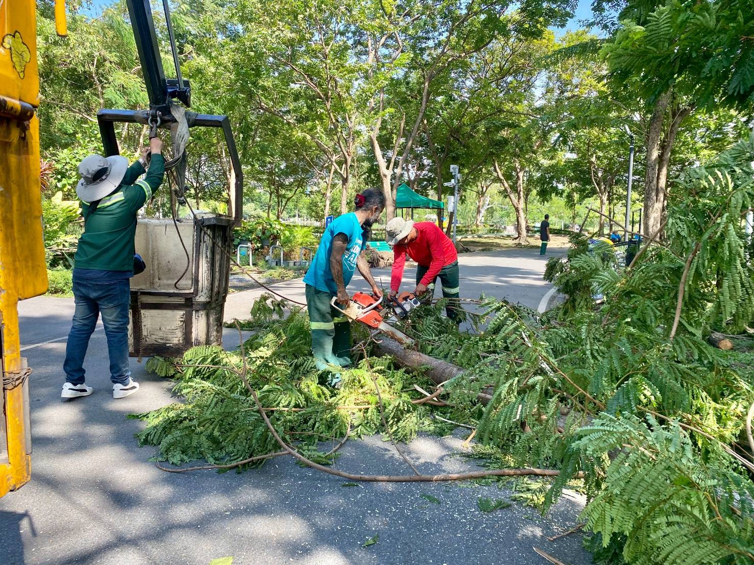 นางสาววรนุช สวยค้าข้าว รองผู้อำนวยการสำนักสิ่งแวดล้อม (สสล.) กทม. รักษาราชการแทน ผอ.สสล. กล่าวว่า สสล. ได้ประสานแจ้งหน่วยงานในสังกัดที่รับผิดชอบดูแลพื้นที่สีเขียวในกรุงเทพฯ สวนสาธารณะขนาดใหญ่และต้นไม้บนถนนสายสำคัญ พร้อมทั้งประสานสำนักงานเขต 50 เขต ซึ่งรับผิดชอบต้นไม้บนถนนสายหลัก สายรอง ทางเท้า และสวนหย่อม สวน 15 นาที รวมถึงสวนสาธารณะในพื้นที่ โดยให้เจ้าหน้าที่สำรวจและแก้ไขปัญหาต้นไม้ล้มในพื้นที่ทั้งในสวนสาธารณะที่รับผิดชอบ พื้นที่ที่เกี่ยวข้องเป็นการด่วน ตรวจสอบความสมบูรณ์แข็งแรงของต้นไม้บนถนน ทางเท้า และที่สาธารณะควบคู่กัน หากพบต้นไม้ที่เสี่ยงหักโค่น หรือพายุลมกระโชกแรง ให้ตัดแต่งกิ่งแห้ง กิ่งผุ พร้อมตรวจสอบลำต้น หาร่องรอยการเข้าทำลายของแมลง และตัดแต่งต้นไม้ตามหลักวิชาการและงานรุกขกรรม เพื่อความปลอดภัย ส่วนการแก้ไขปัญหาต้นไม้ที่ได้รับความเสียหายจากพายุในถนนสายหลัก รวมถึงในสวนสาธารณะของ กทม. สสล. ได้เร่งดำเนินการแก้ไขให้เข้าสู่สภาวะปกติโดยเร็วที่สุด เพื่อคืนพื้นที่ให้ประชาชน รวมถึงได้สนับสนุนกำลังเจ้าหน้าที่ พร้อมอุปกรณ์ และเครื่องมือร่วมแก้ไขเหตุต้นไม้ล้มในพื้นที่เขตทั้ง 50 เขต เพื่อเปิดการจราจรให้ประชาชนสัญจรผ่าน หรือบรรเทาความเดือดร้อนให้ประชาชนได้เร็วที่สุด