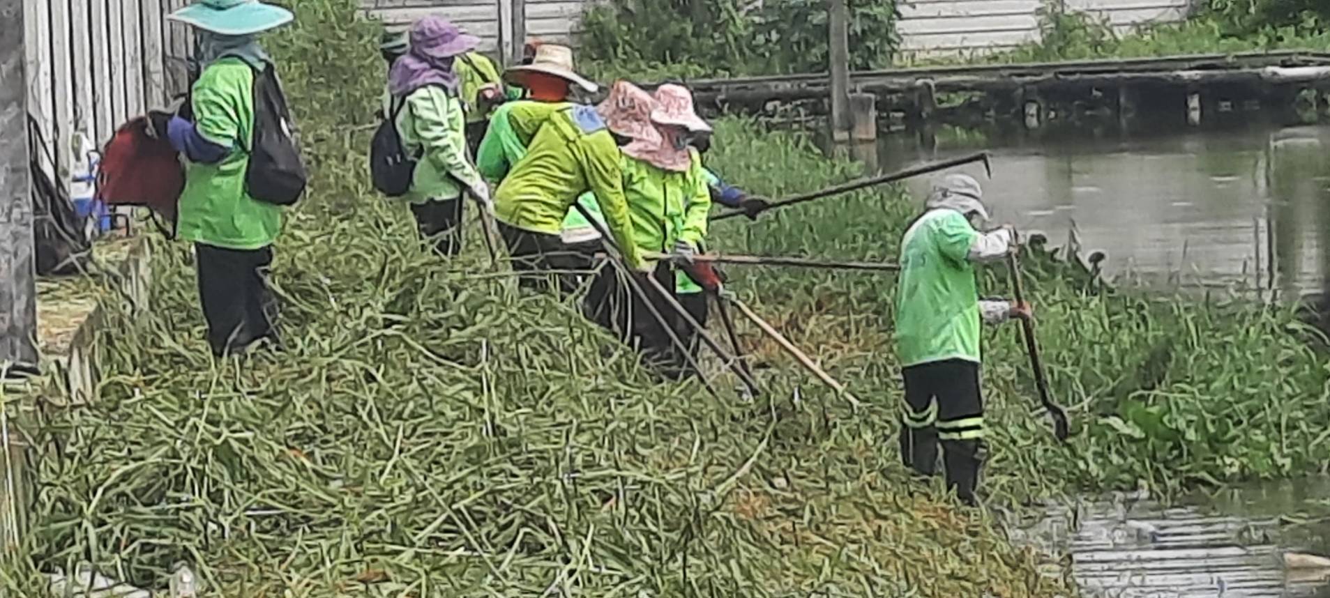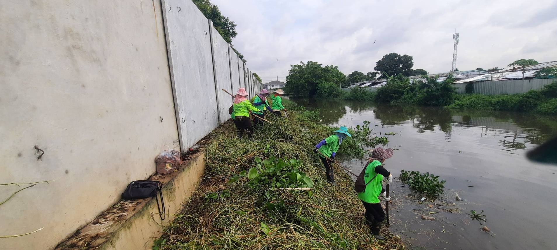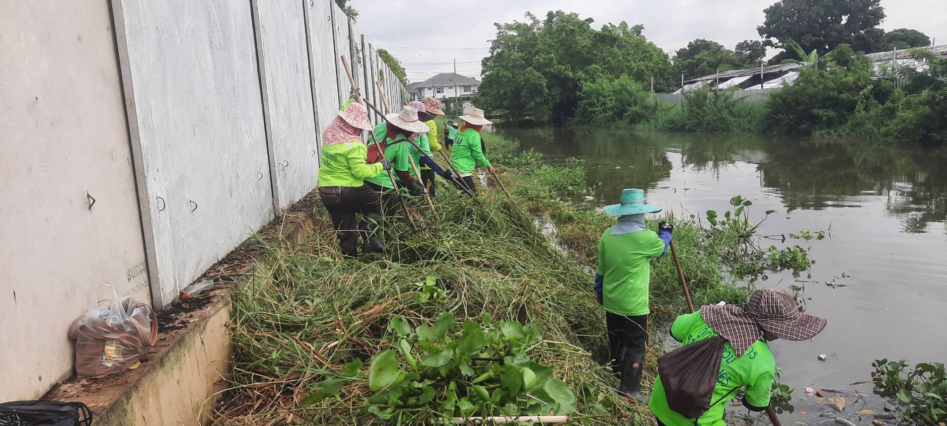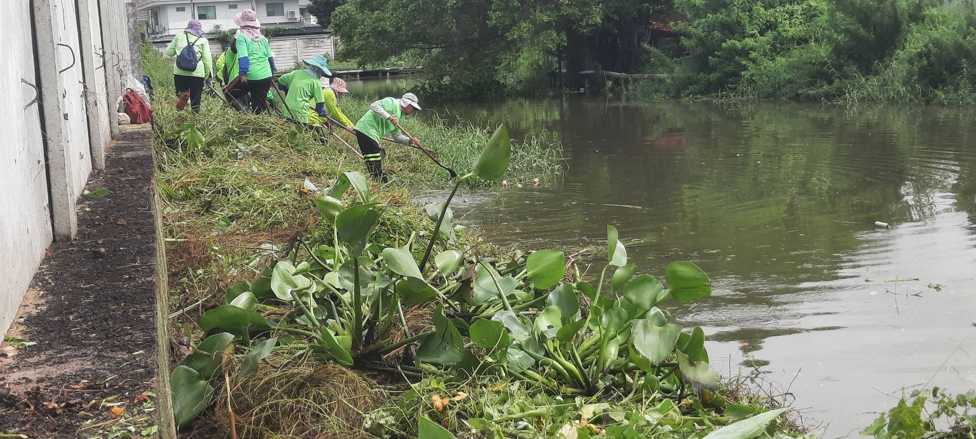 เจ้าหน้าที่ เก็บวัชพืชและขยะคลองแม่จัน ช่วงถนนศรีนครินทร์-ร่มเกล้า ตัดใหม่ เขตสะพานสูง