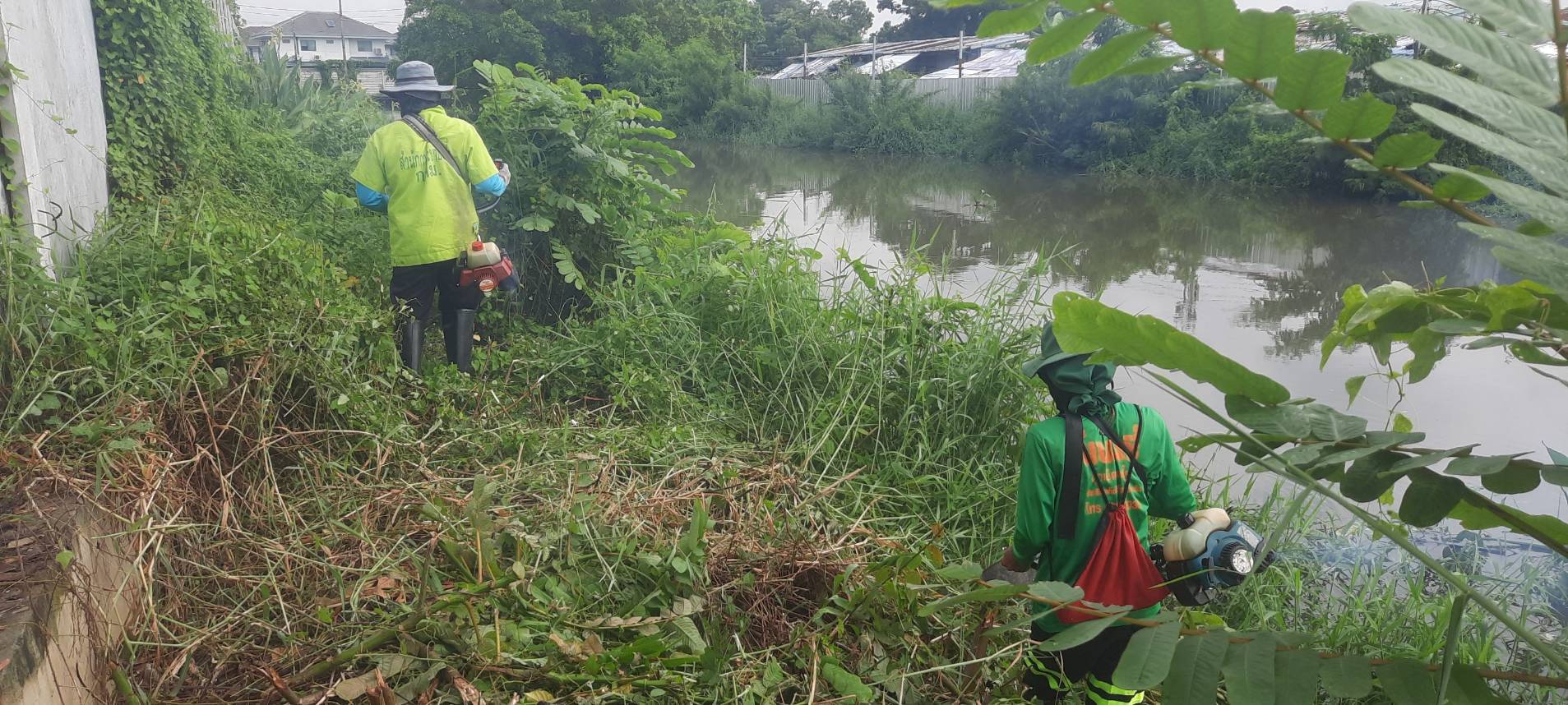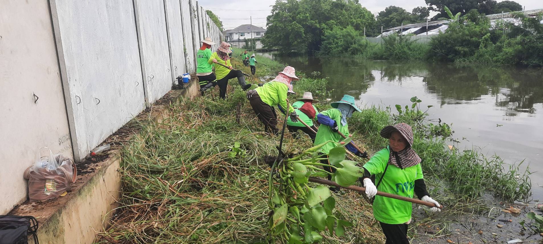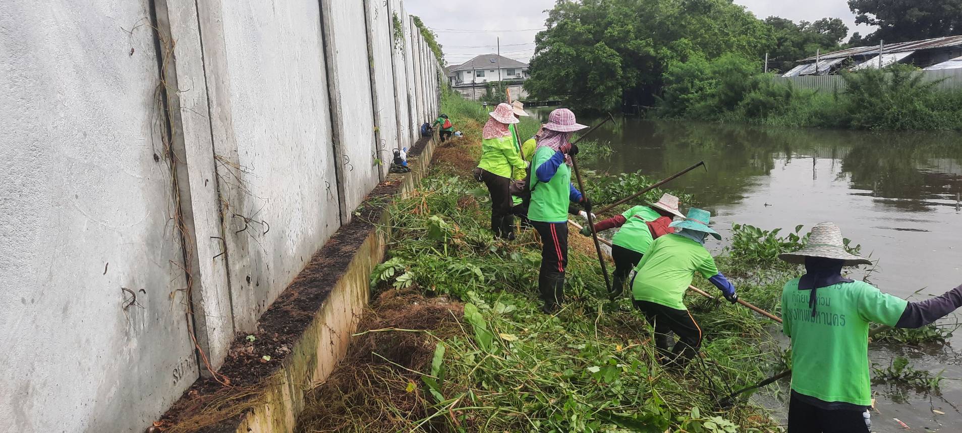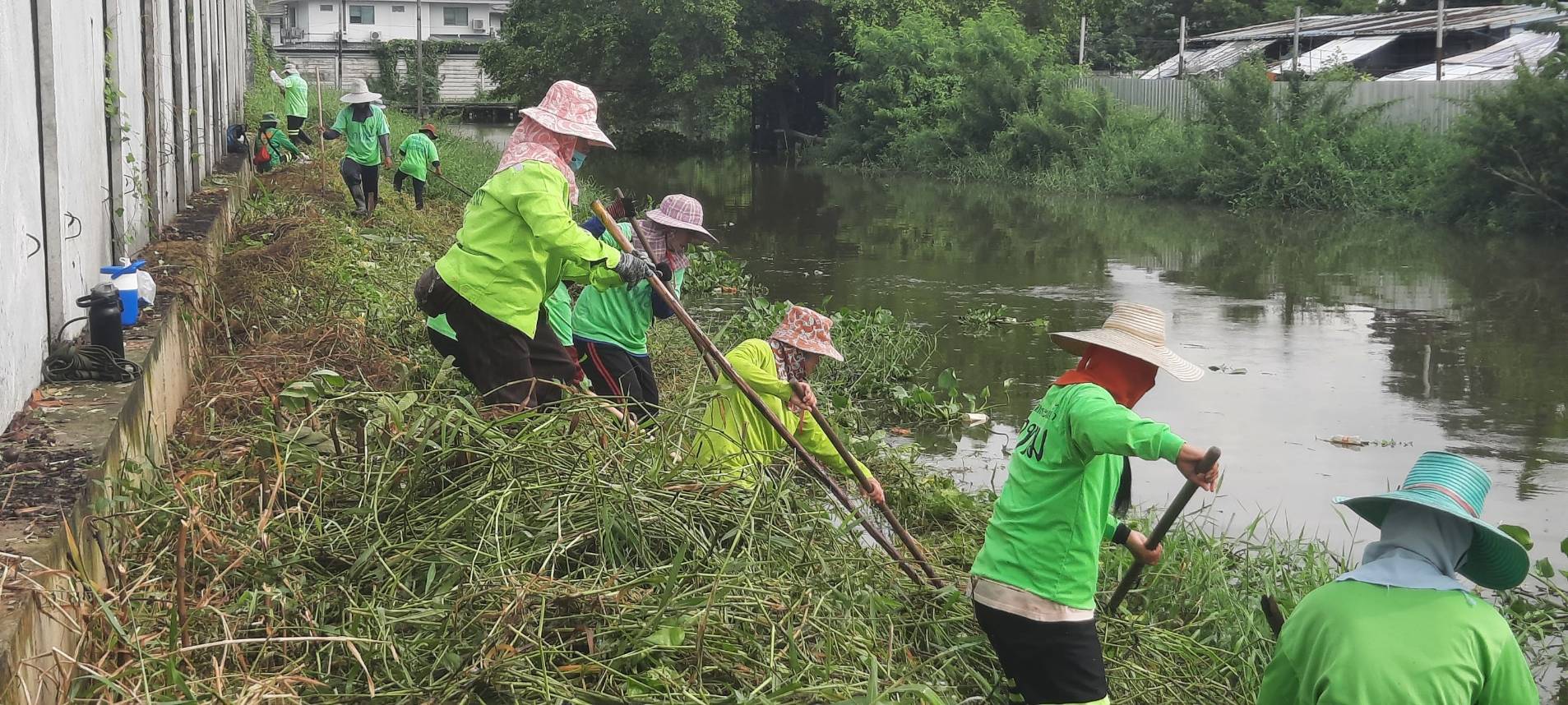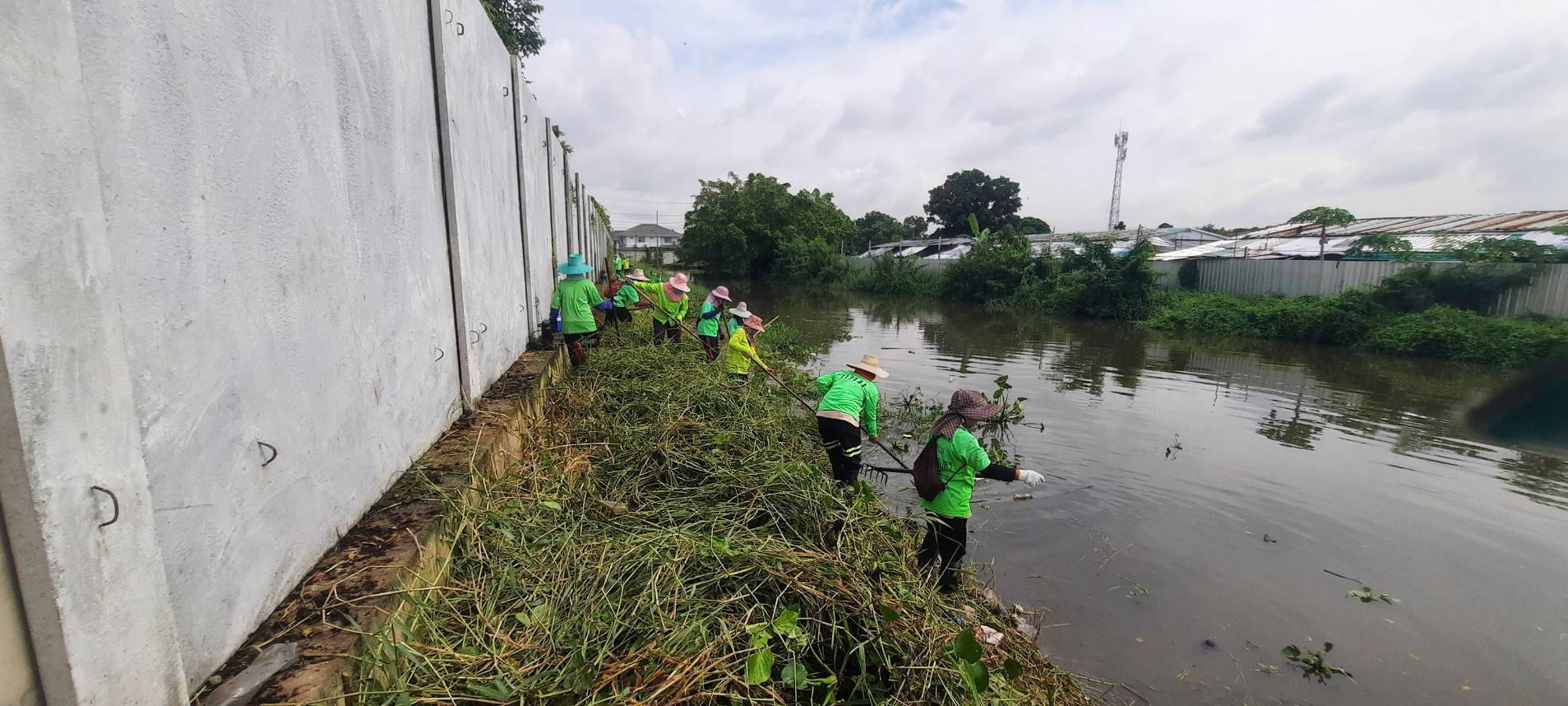 เจ้าหน้าที่ เก็บวัชพืชและขยะคลองแม่จัน ช่วงถนนศรีนครินทร์-ร่มเกล้า ตัดใหม่ เขตสะพานสูง