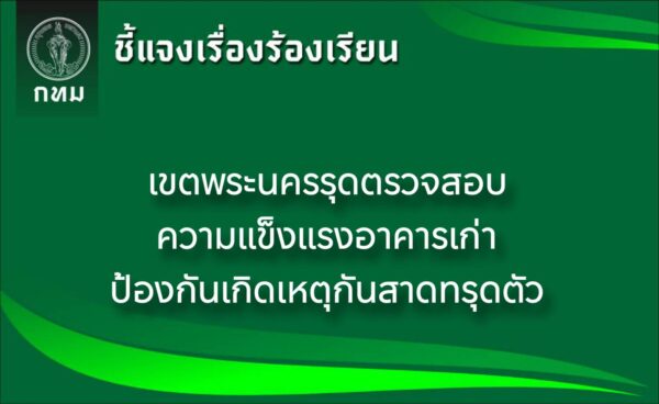 นอกจากนี้ สำนักงานเขตฯ ได้จัดเจ้าหน้าที่และวิศวกรตรวจสอบอาคารที่มีอายุการก่อสร้างมากกว่า 40 ปี หากโครงสร้างหลักของอาคารมีสภาพชำรุดจะประสานหน่วยงานวิศวกรรมสถานแห่งประเทศไทย (วสท.) เข้าตรวจสอบความมั่นคงแข็งแรงของโครงสร้างอาคารอีกครั้ง และขณะนี้อยู่ระหว่างตรวจสอบและจัดทำบัญชีกลุ่มอาคารที่มีอายุการก่อสร้างมาเป็นระยะเวลานาน พร้อมทั้งประสานเจ้าของอาคารให้เร่งรัดดำเนินการซ่อมแซม แต่หากอาคารมีสภาพชำรุดที่อาจเป็นภยันตรายต่อชีวิตและทรัพย์สินกับประชาชน จะออกคำสั่งทางกฎหมายว่าด้วยการควบคุมอาคารต่อไป ทั้งนี้ เบื้องต้นจากการตรวจสอบอาคารได้แนะนำเจ้าของอาคารคอยตรวจสอบ สังเกตอาคารหากเห็นว่าเกิดการชำรุด หรือคิดว่าอาคารเกิดการชำรุดสามารถแจ้งฝ่ายโยธา สำนักงานเขตฯ เพื่อจัดส่งเจ้าหน้าที่และวิศวกรเข้าตรวจสอบก่อนได้ เพื่อแนะนำการซ่อมแซมต่อไป