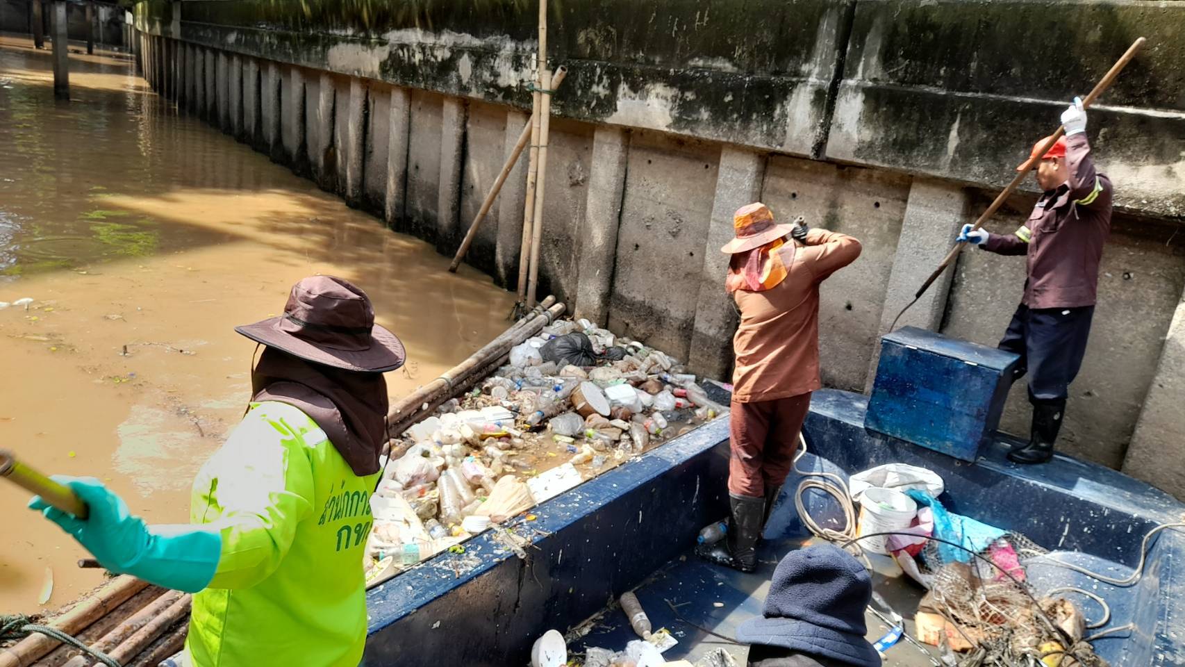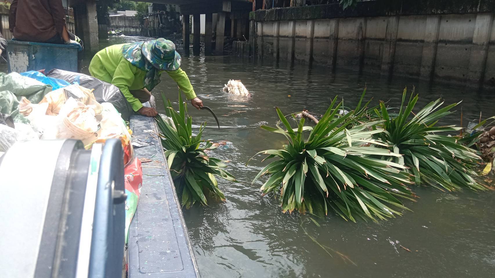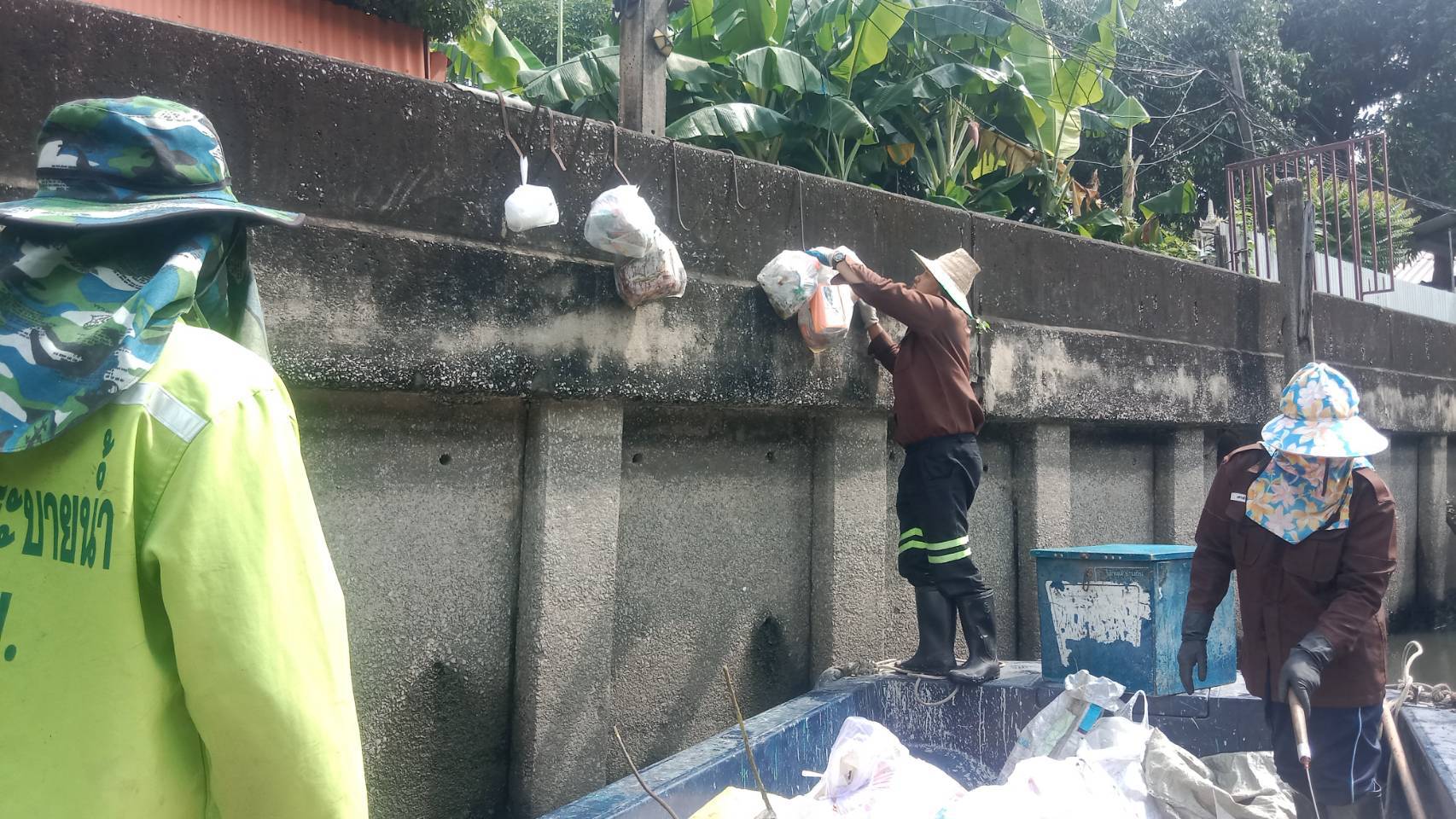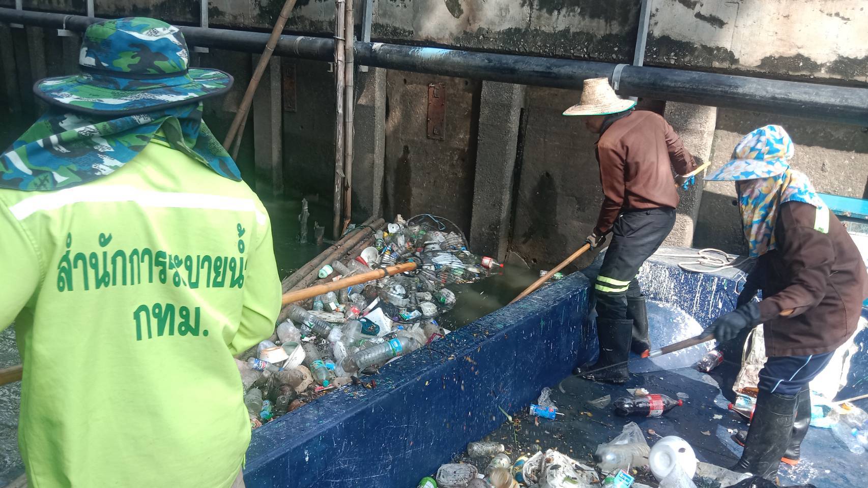 เจ้าหน้าที่ เก็บขยะทางน้ำแนวสันเขื่อนและตักขยะในคลองสามเสน เขตห้วยขวาง เขตดินแดงและเขตราชเทวี