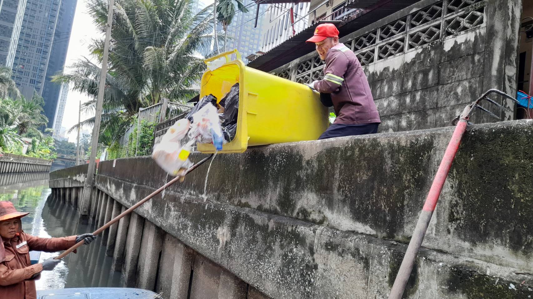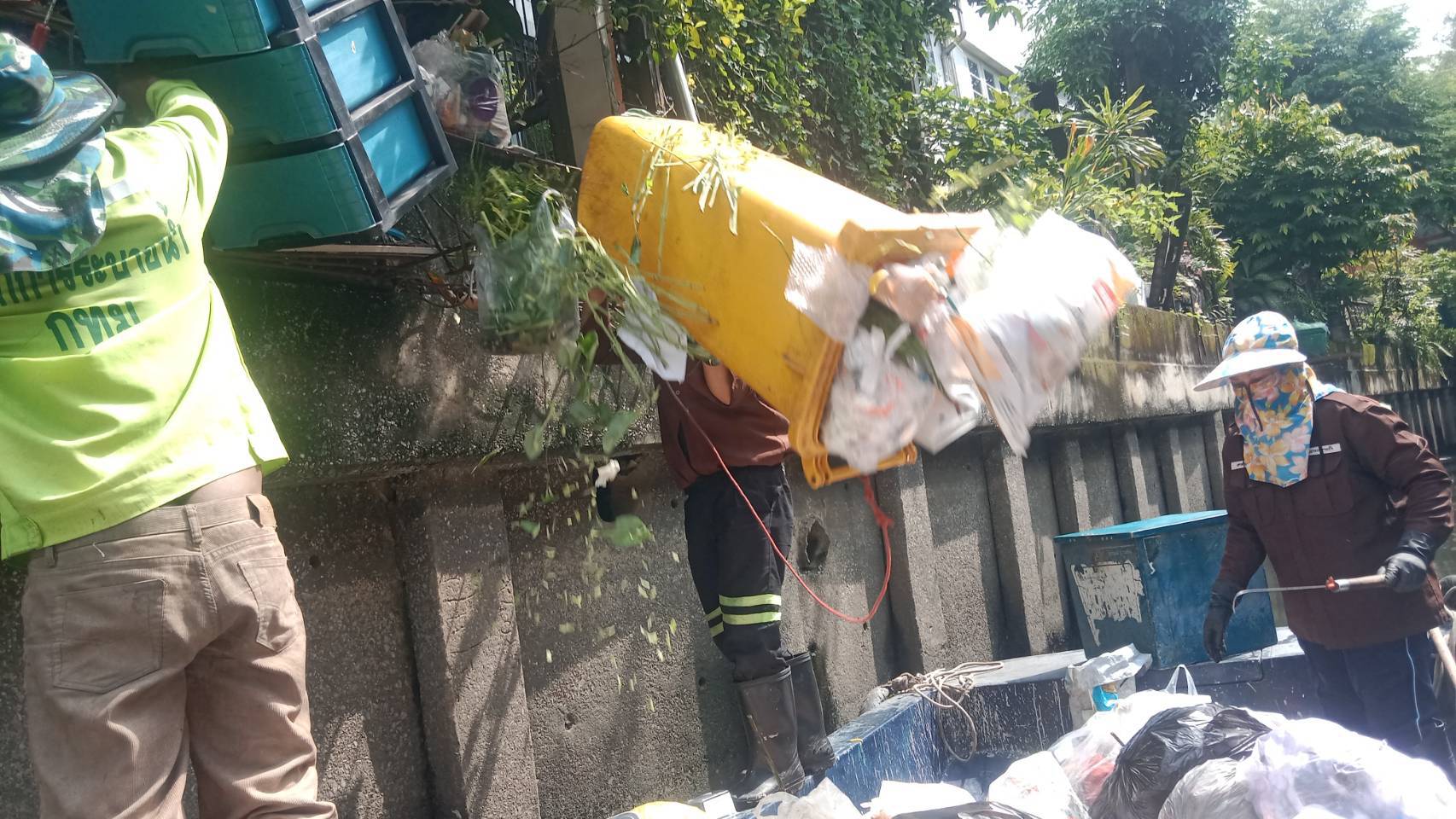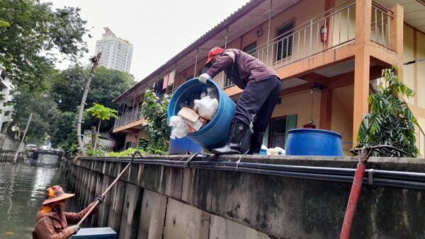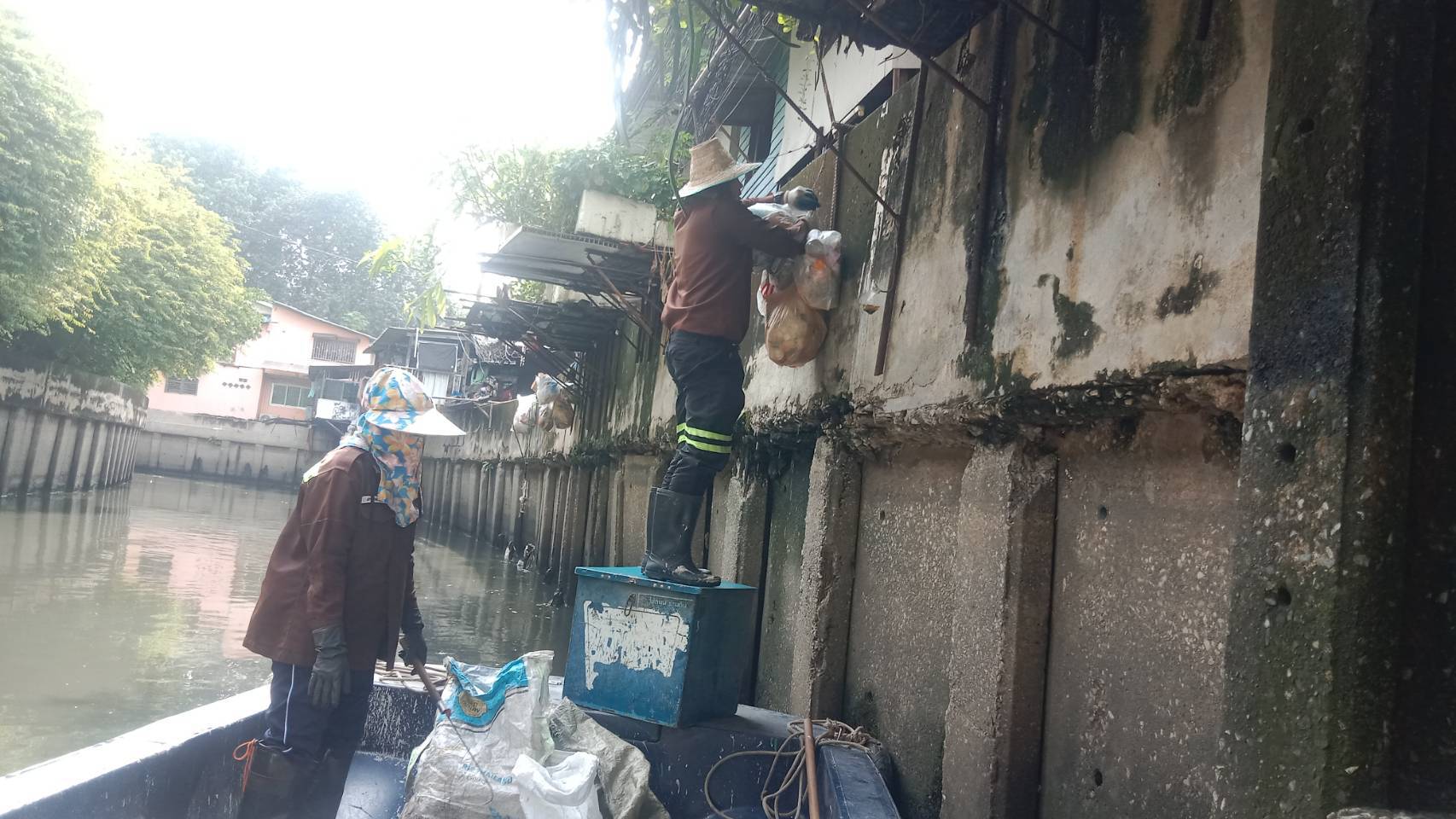 เจ้าหน้าที่ เก็บขยะทางน้ำแนวสันเขื่อนและตักขยะในคลองสามเสน เขตห้วยขวาง เขตดินแดงและเขตราชเทวี