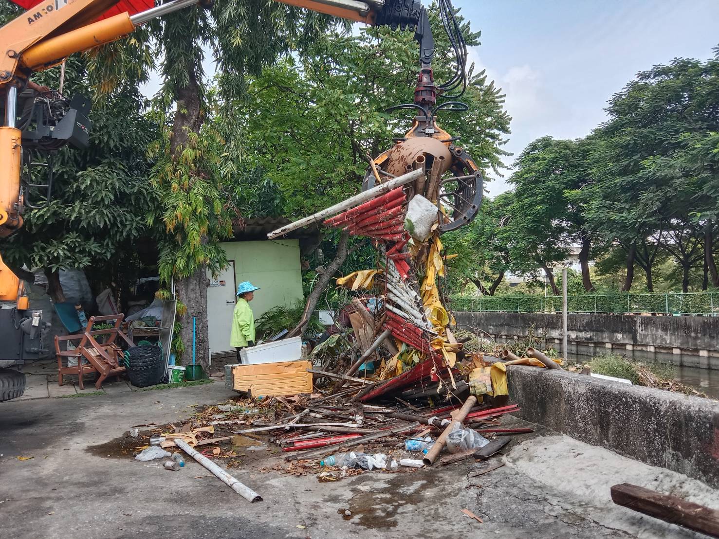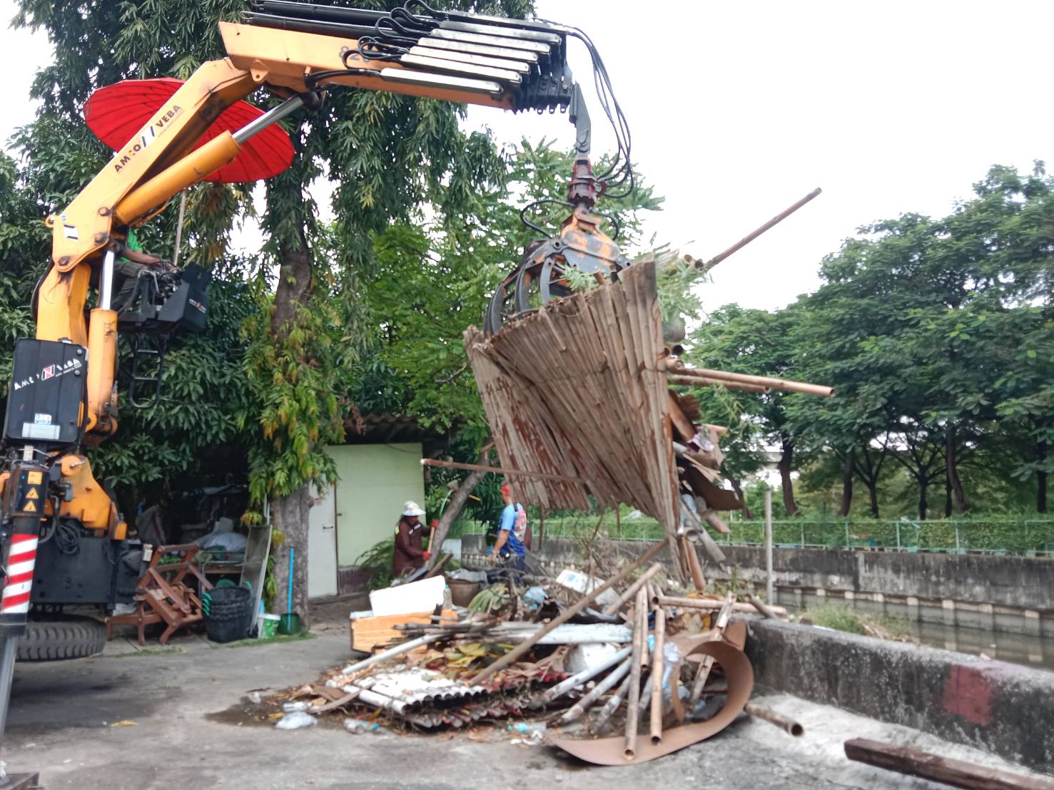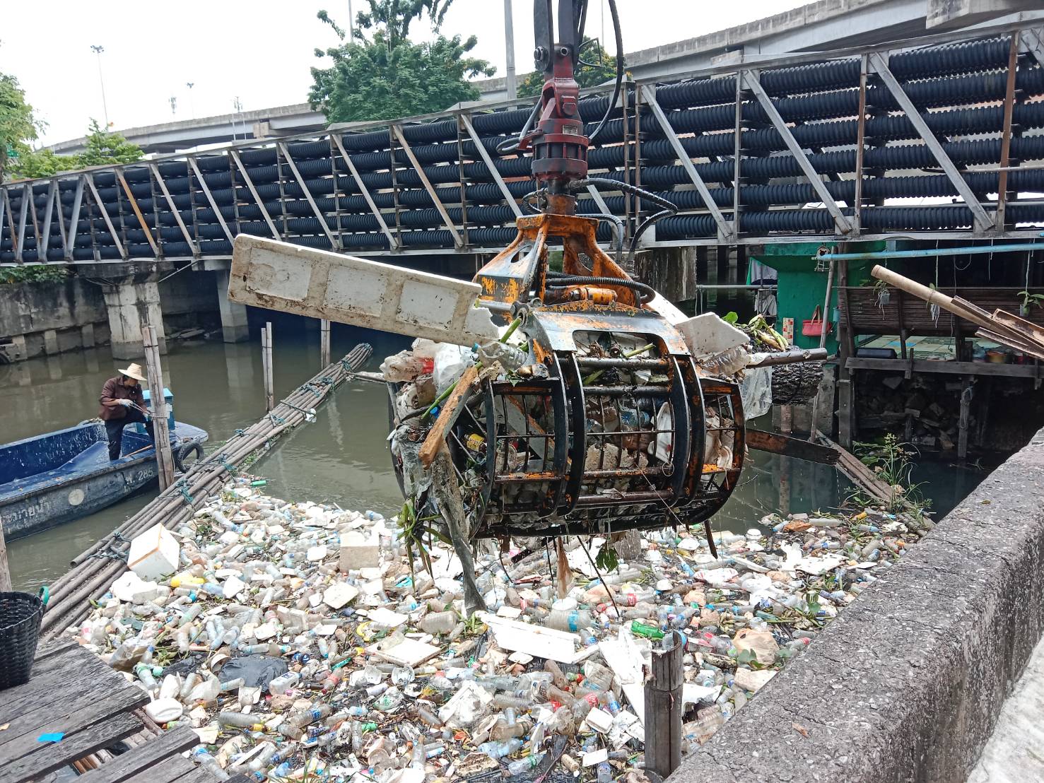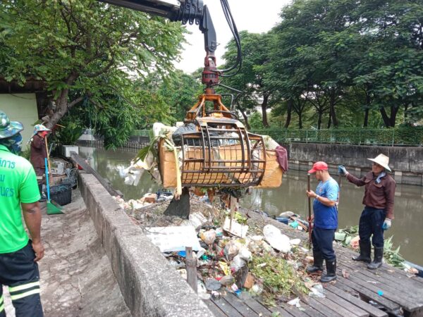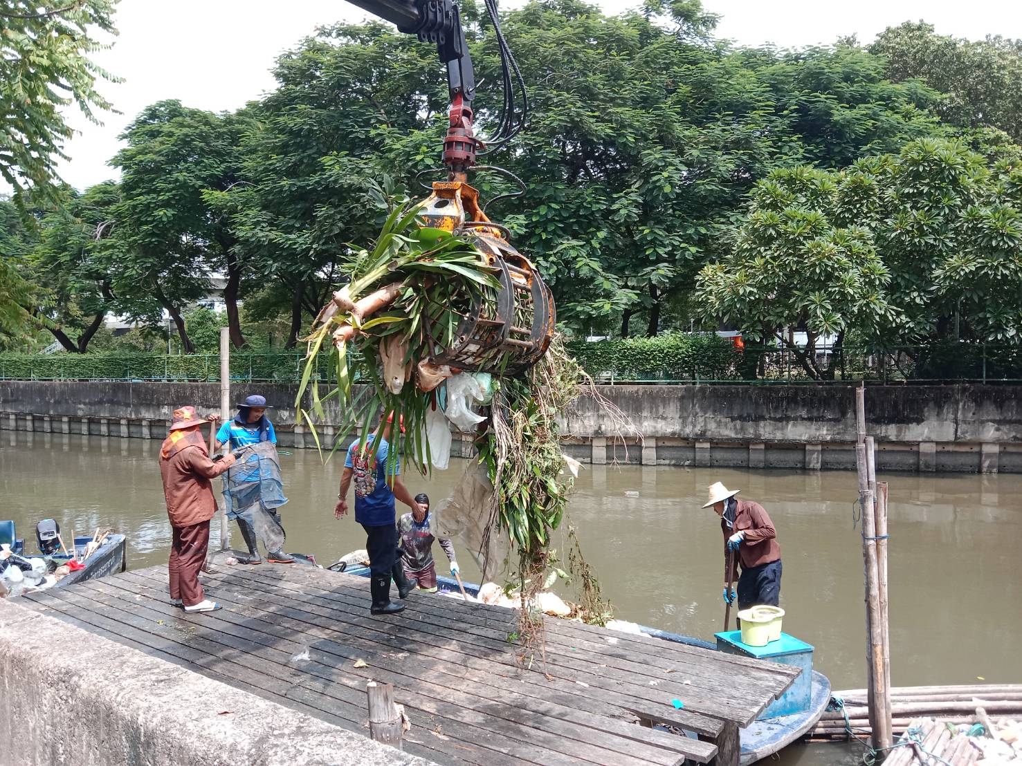 เจ้าหน้าที่ งับขยะและวัชพืชที่ท่าขยะหน่วยงานพระราม9 เขตห้วยขวาง