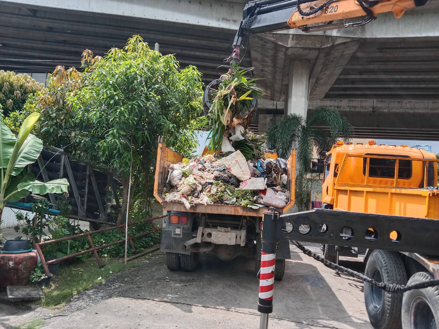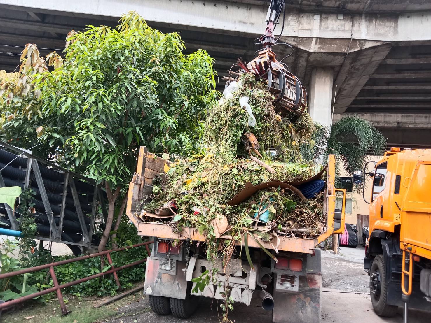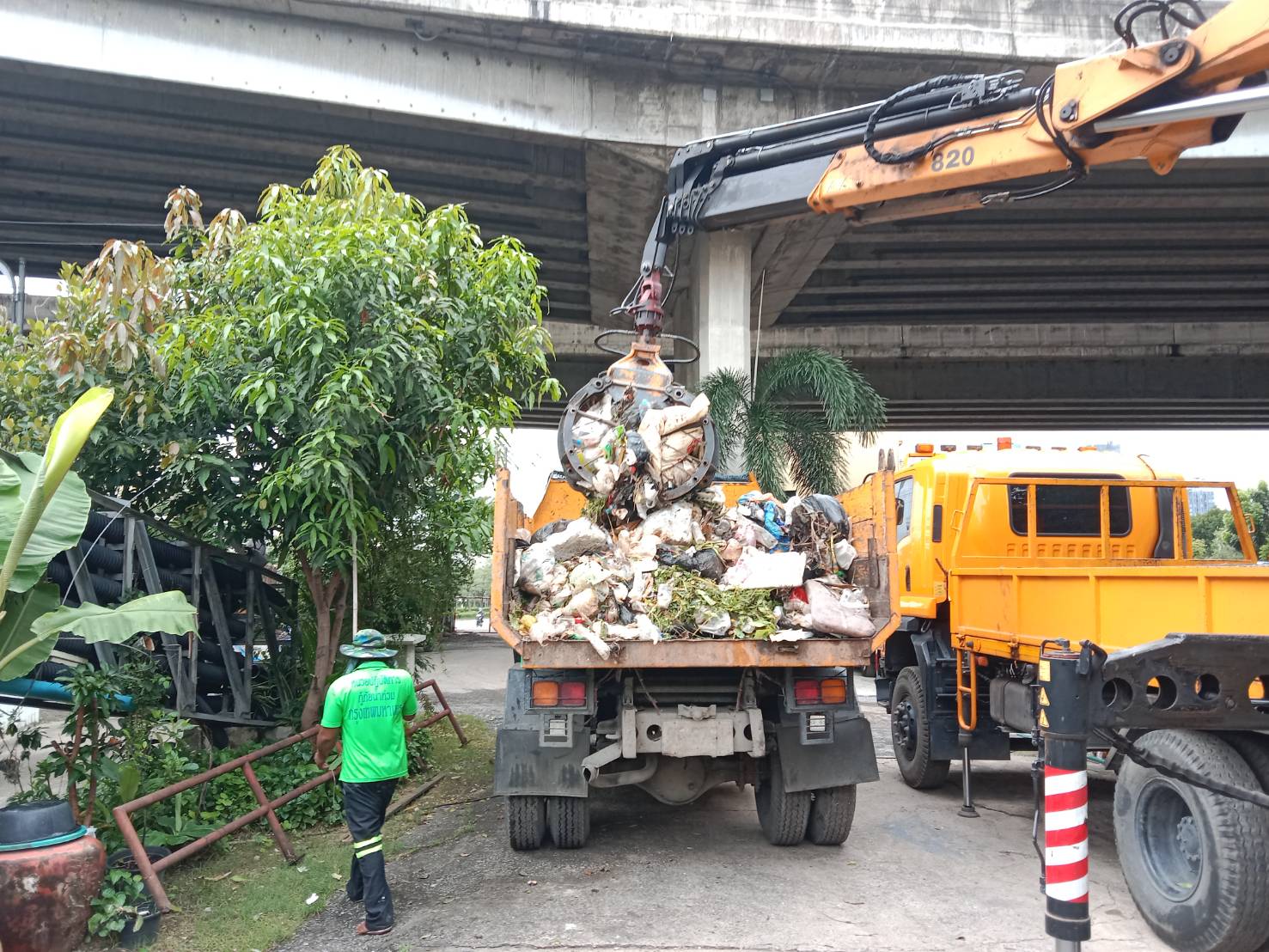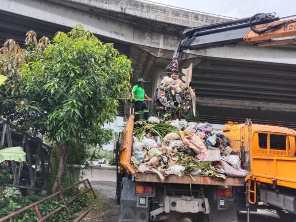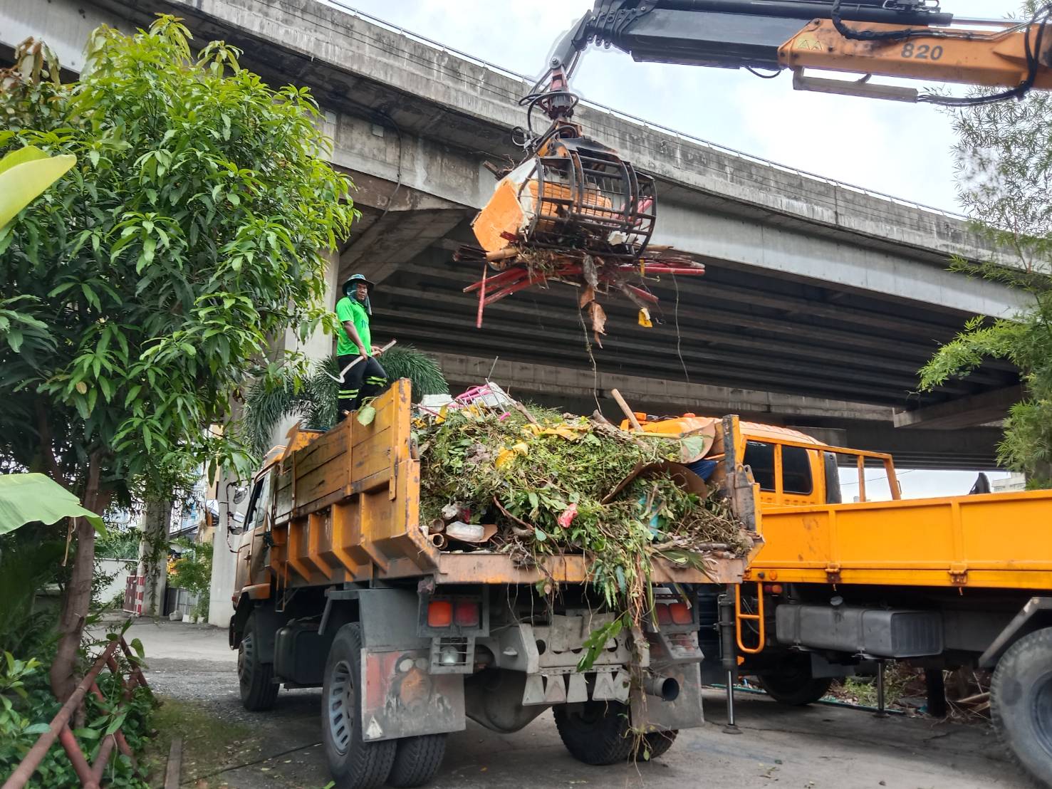 เจ้าหน้าที่ งับขยะและวัชพืชที่ท่าขยะหน่วยงานพระราม9 เขตห้วยขวาง