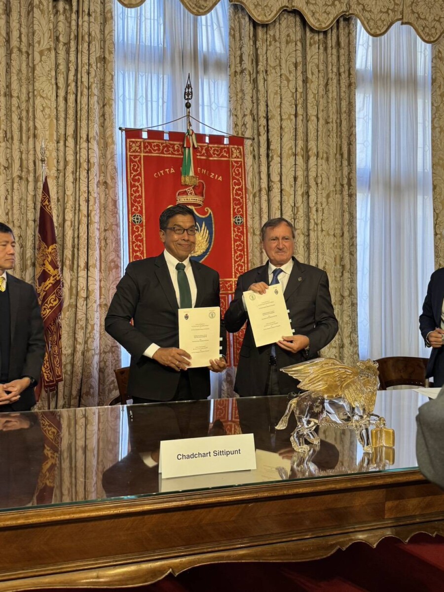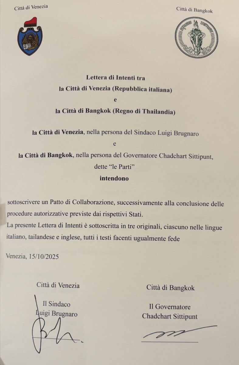วันที่ 15 ตุลาคม 2568 นายชัชชาติ สิทธิพันธุ์ ผู้ว่าราชการกรุงเทพมหานคร พร้อมด้วย นายภิมุข สิมะโรจน์ เลขานุการผู้ว่าราชการกรุงเทพมหานคร และเจ้าหน้าที่สำนักงานการต่างประเทศ เดินทางเยือนเมืองเวนิส สาธารณรัฐอิตาลี เพื่อเข้าเยี่ยมคารวะนายหลุยจี บรุญญาโร นายกเทศมนตรีเมืองเวนิส ณ ศาลาว่าการเมืองเวนิส