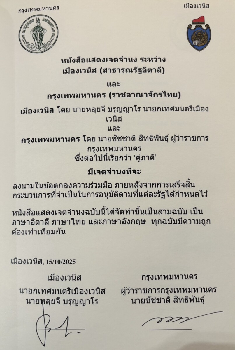 การลงนามในหนังสือแสดงเจตจำนงระหว่างเมืองเวนิสและกรุงเทพมหานคร นับเป็นก้าวแรกของการสถาปนาและส่งเสริมความสัมพันธ์ระหว่างกรุงเทพมหานครและเมืองเวนิส สาธารณรัฐอิตาลี ซึ่งจะช่วยเพิ่มพูนโอกาสในการแลกเปลี่ยนองค์ความรู้ ประสบการณ์ และแนวปฏิบัติที่ดีในด้านต่าง ๆ ของกรุงเทพมหานครในอนาคตต่อไป