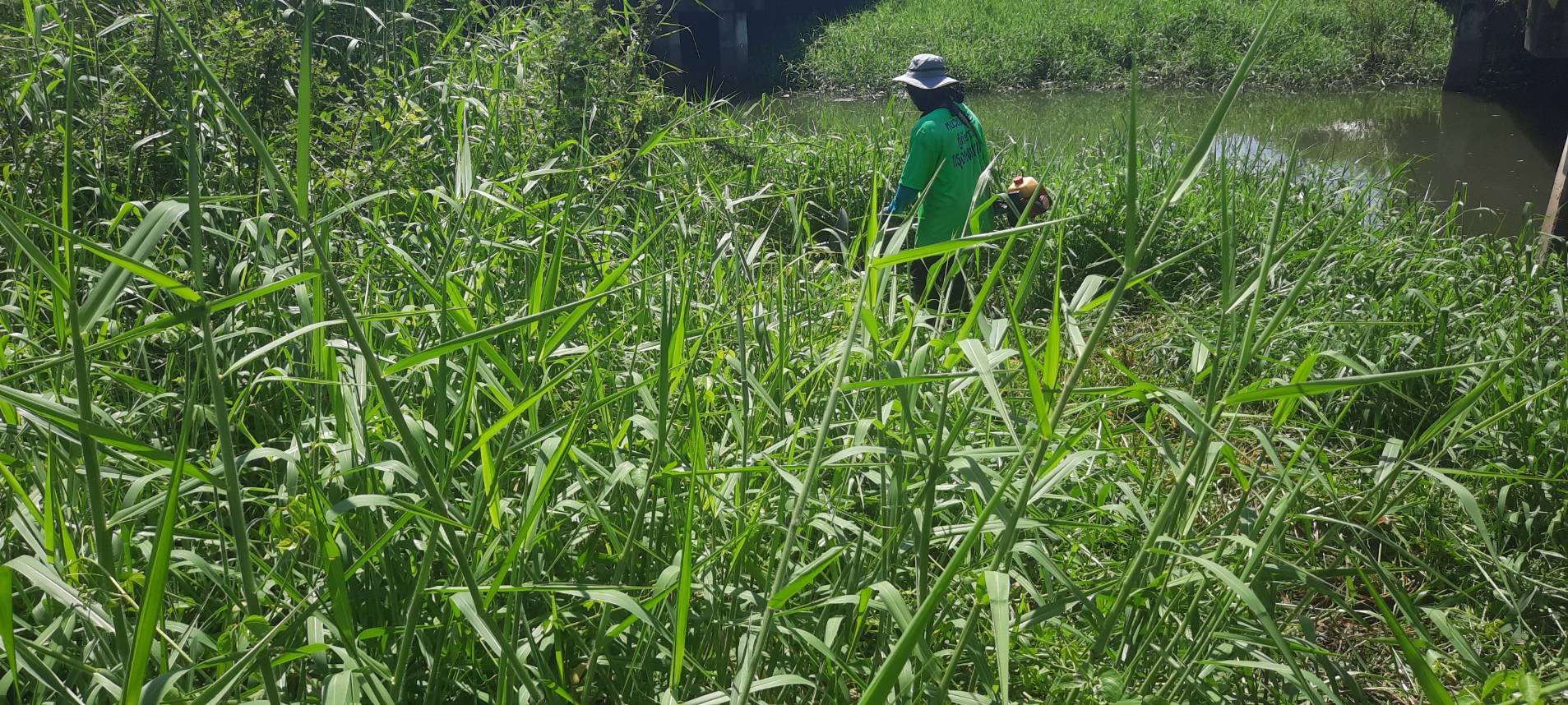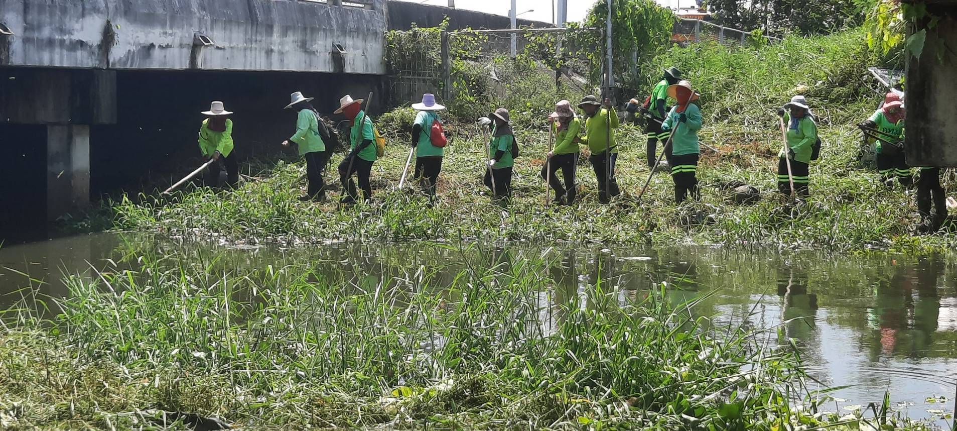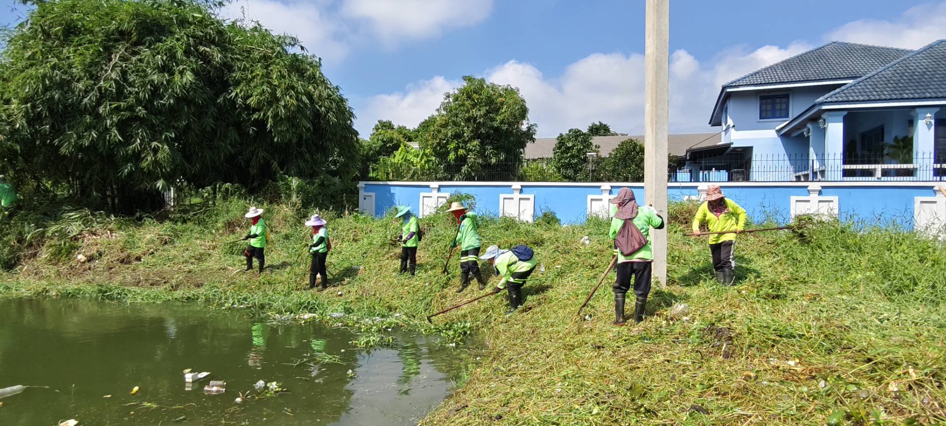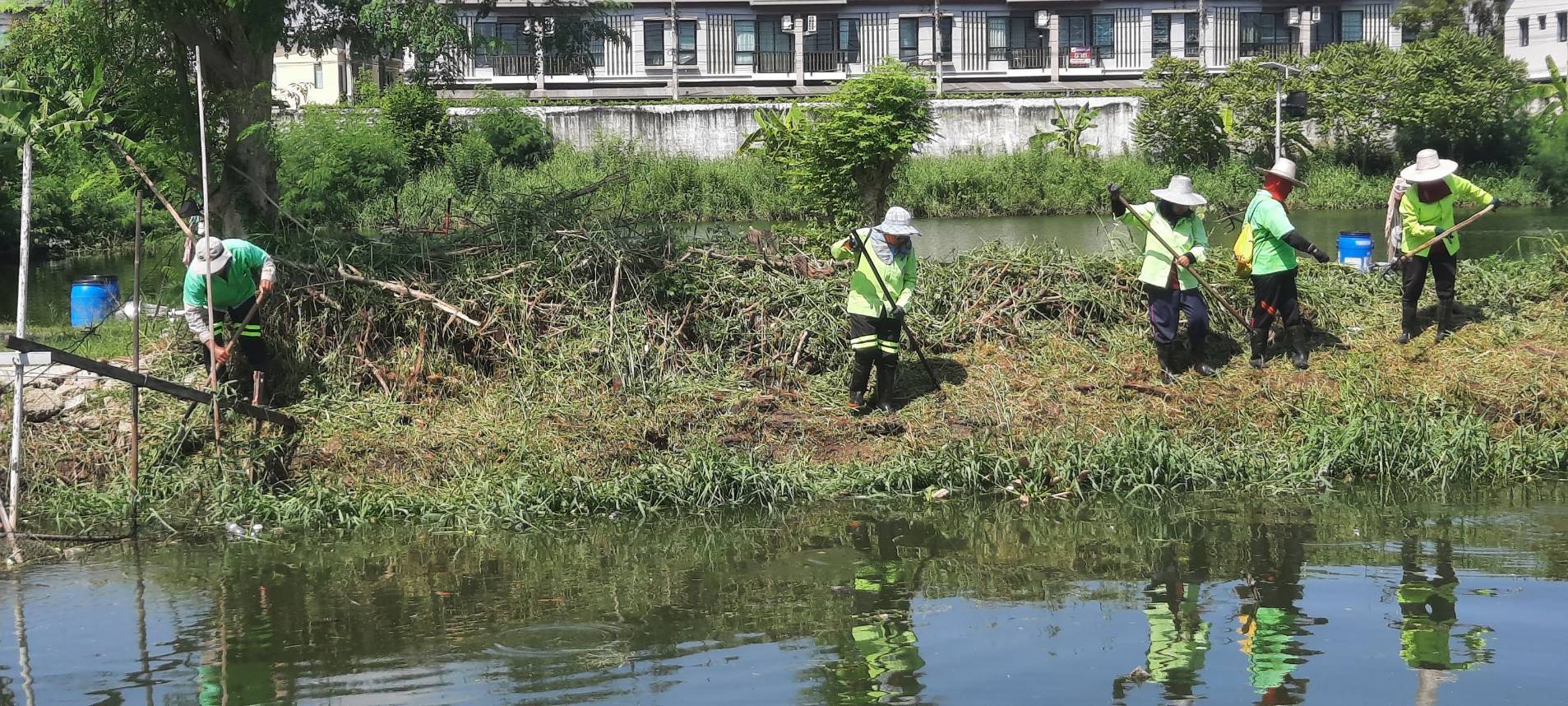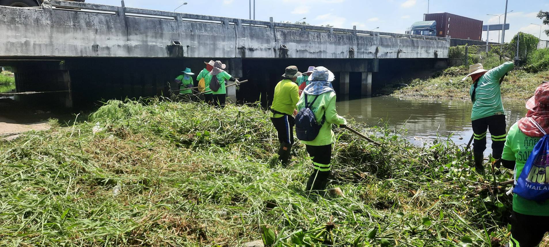 เจ้าหน้าที่ เก็บวัชพืชและขยะคลองปักหลัก ช่วงถนนกาญจนาภิเษก44 เขตประเวศ