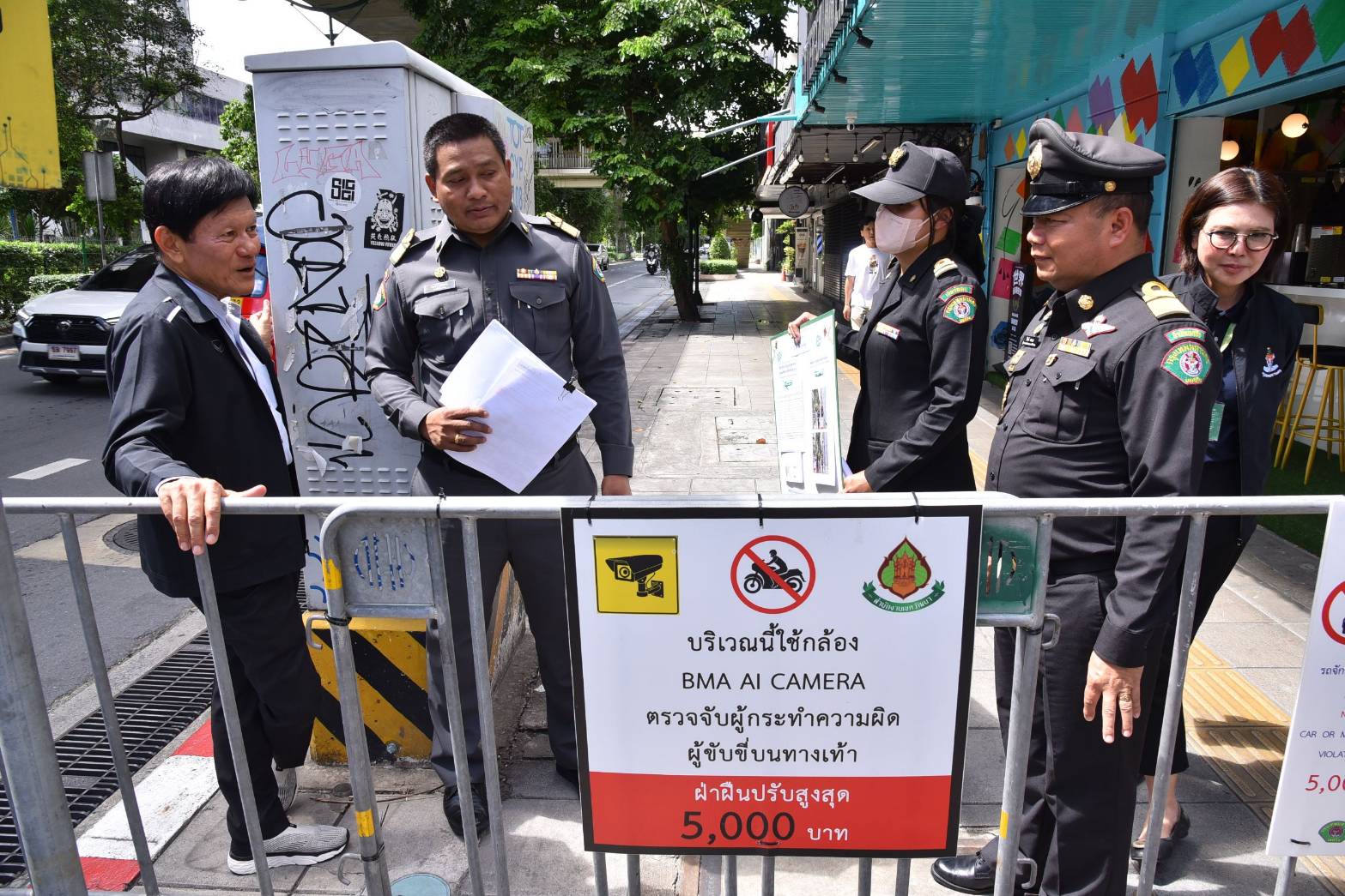 ตรวจจุดติดตั้งกล้อง CCTV จับภาพอัจฉริยะผ่านระบบ BMA AI บริเวณซอยสุขุมวิท 61 ซึ่งเขตฯ มีจุดติดตั้งกล้อง CCTV จำนวน 3 จุด ได้แก่ 1.ซอยสุขุมวิท 21 หน้าธนาคารไทยพาณิชย์ 2.ปากซอยสุขุมวิท 47 3.ปากซอยสุขุมวิท 61 เพื่อตรวจจับผู้กระทำความผิดขับขี่รถจักรยานยนต์บนทางเท้า กวดขันวินัยจราจรเปรียบเทียบปรับแก่ผู้ฝ่าฝืนนำรถยนต์ขึ้นมาจอดหรือผู้ขับขี่รถจักรยานยนต์บนทางเท้า บังคับการตามพระราชบัญญัติรักษาความสะอาดและความเป็นระเบียบเรียบร้อยของบ้านเมือง พ.ศ.2535 และที่แก้ไขเพิ่มเติม และพระราชบัญญัติว่าด้วยการปรับเป็นพินัย พ.ศ.2565 ผู้ฝ่าฝืนต้องระวางโทษปรับเป็นพินัยไม่เกิน 5,000 บาท ซึ่งเขตฯ ได้ติดป้ายประชาสัมพันธ์แจ้งเตือน ตั้งวางแผงเหล็กป้องกันรถจักรยานยนต์ขึ้นบนทางเท้า จัดเจ้าหน้าที่เทศกิจเฝ้าระวังในจุดดังกล่าว
