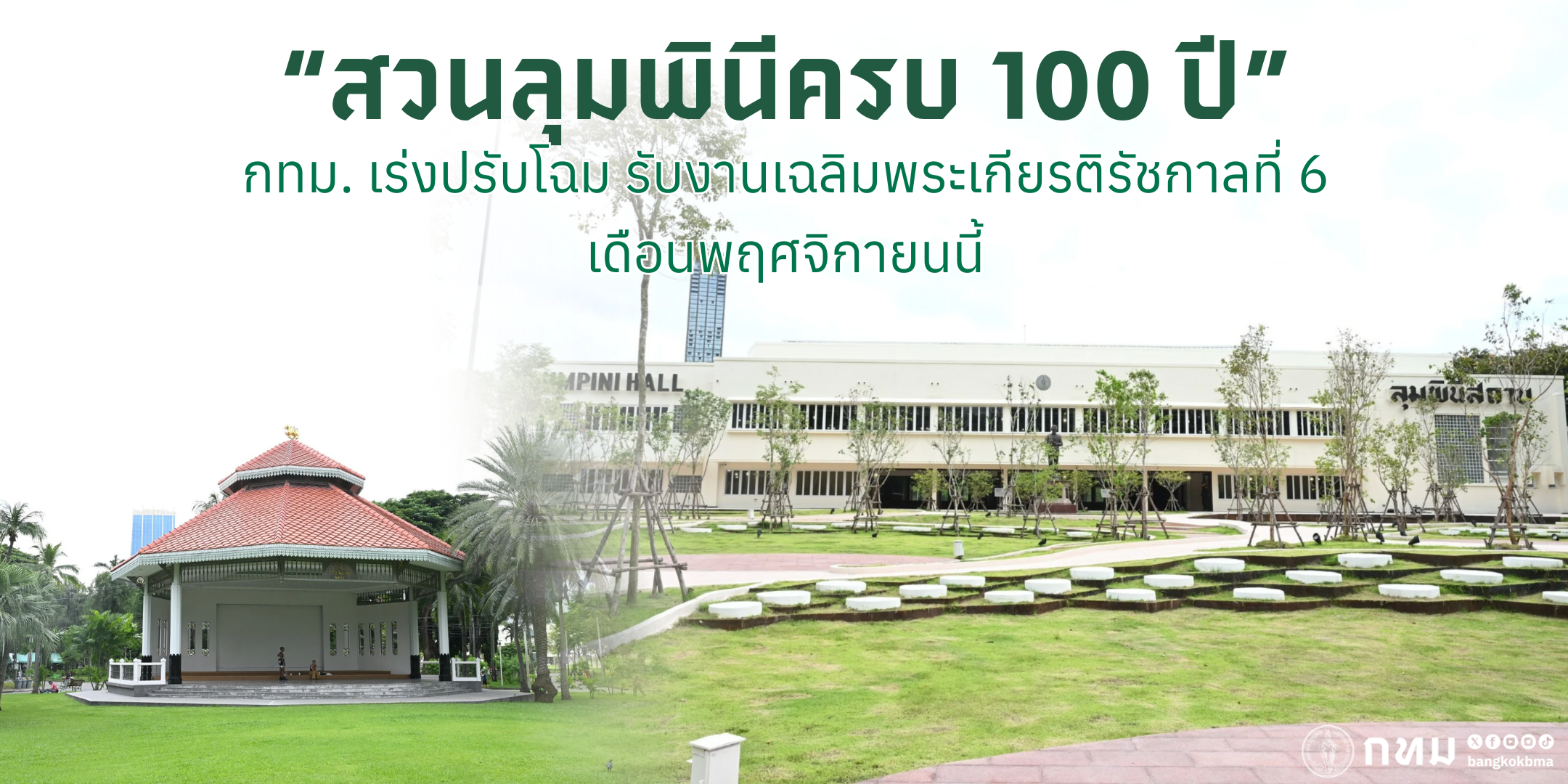 สำหรับ “สวนลุมพินี” เป็นสวนสาธารณะแห่งแรกของประเทศไทย ถือกำเนิดขึ้นเมื่อ พ.ศ. 2468 จากสยามรัฐพิพิธภัณฑ์ ตามพระราชประสงค์ของพระบาทสมเด็จพระมงกุฎเกล้าเจ้าอยู่หัว รัชกาลที่ 6 สู่วนะสาธารณ์ อันหมายถึงพื้นที่ป่าของสาธารณชน สวนลุมพินีจึงกลายเป็นสวนสาธารณะแห่งแรกของประเทศไทย โดยในปี 2568 นี้ เป็นโอกาสสำคัญที่สวนลุมพินีจะมีอายุครบ 100 ปี ซึ่งตลอดระยะเวลาได้ผ่านการสั่งสมความทรงจำของผู้คน ความทรงคุณค่าทางประวัติศาสตร์ วัฒนธรรม สิ่งแวดล้อม รวมถึงยังเป็นประจักษ์พยานในเหตุการณ์สำคัญต่าง ๆ นับครั้งไม่ถ้วน กรุงเทพมหานครจึงได้จัดทำโครงการปรับปรุงสวนลุมพินี เพื่อให้เป็นพื้นที่สีเขียวสาธารณะที่มีความร่มรื่น สวยงาม ทันสมัย สามารถตอบสนองกับวิถีชีวิตของประชาชนยุคใหม่ และสอดคล้องกับการพัฒนาของเมือง