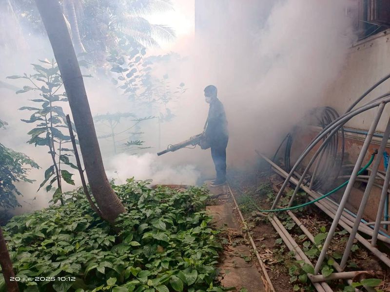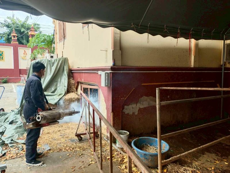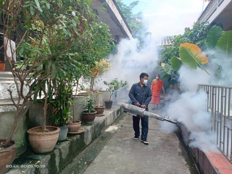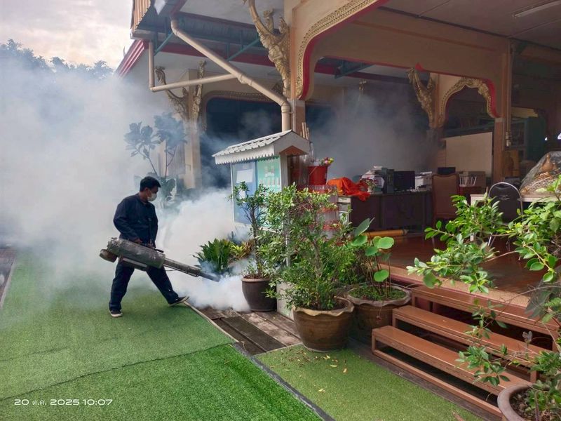 ดำเนินการฉีดพ่นหมอกควันสารเคมีกำจัดยุงตัวแก่ เพื่อป้องกันการระบาดของโรคติดต่อที่นำโดยยุงลาย เช่น โรคไข้เลือดออกและโรคชิคุนกุนยา ณ วัดดอกไม้ ถนนพระราม3