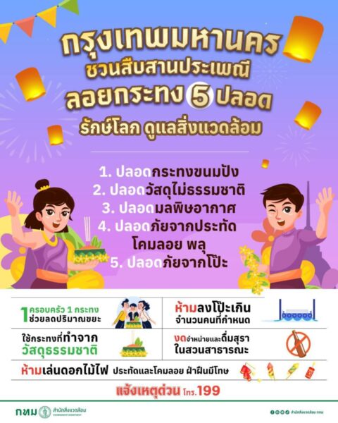 (21 ต.ค. 68) นายพรพรหม วิกิตเศรษฐ์ ที่ปรึกษาของผู้ว่าราชการกรุงเทพมหานคร และผู้บริหารด้านความยั่งยืนของกรุงเทพมหานคร เปิดเผยว่า วันลอยกระทงปีนี้ ตรงกับวันที่ 5 พฤศจิกายน 2568 กรุงเทพมหานคร ขอเชิญชวนประชาชนร่วมสืบสานประเพณีลอยกระทงแบบรักษ์โลก ลดขยะ ร่วมดูแล และลดผลกระทบสิ่งแวดล้อม โดย กทม. ขอร่วมมือประชาชนลอยกระทง ภายใต้แนวคิด 5 ปลอด ประกอบด้วย “3 ปลอดมลพิษ” และ “2 ปลอดภัย” ได้แก่ 1. ปลอดกระทงขนมปัง (ห้ามลอยกระทงขนมปังในสระ หรือบ่อน้ำภายในสวนสาธารณะของ กทม.) 2. ปลอดวัสดุไม่ธรรมชาติ (เลือกใช้วัสดุธรรมชาติที่ย่อยสลายได้ ไม่ใช้โฟม เข็มหมุด ตะปู ลวดเย็บกระดาษ) 3. ปลอดมลพิษอากาศ – ลดการใช้พลังงาน (ลดการเดินทาง ลอยกระทงในสวนสาธารณะใกล้บ้าน ลดการจุดธูป) และ 2 ปลอดภัย ได้แก่ 1. ปลอดภัยจากประทัด โคมลอย พลุ (ห้ามจุดพลุ บั้งไฟ ตะไล โคมลอย) 2. ปลอดภัยจากโป๊ะ – ท่าเรือ