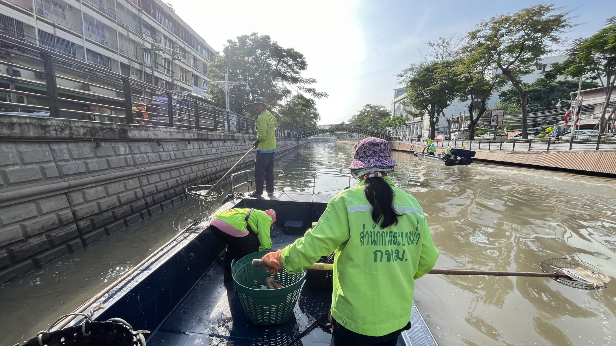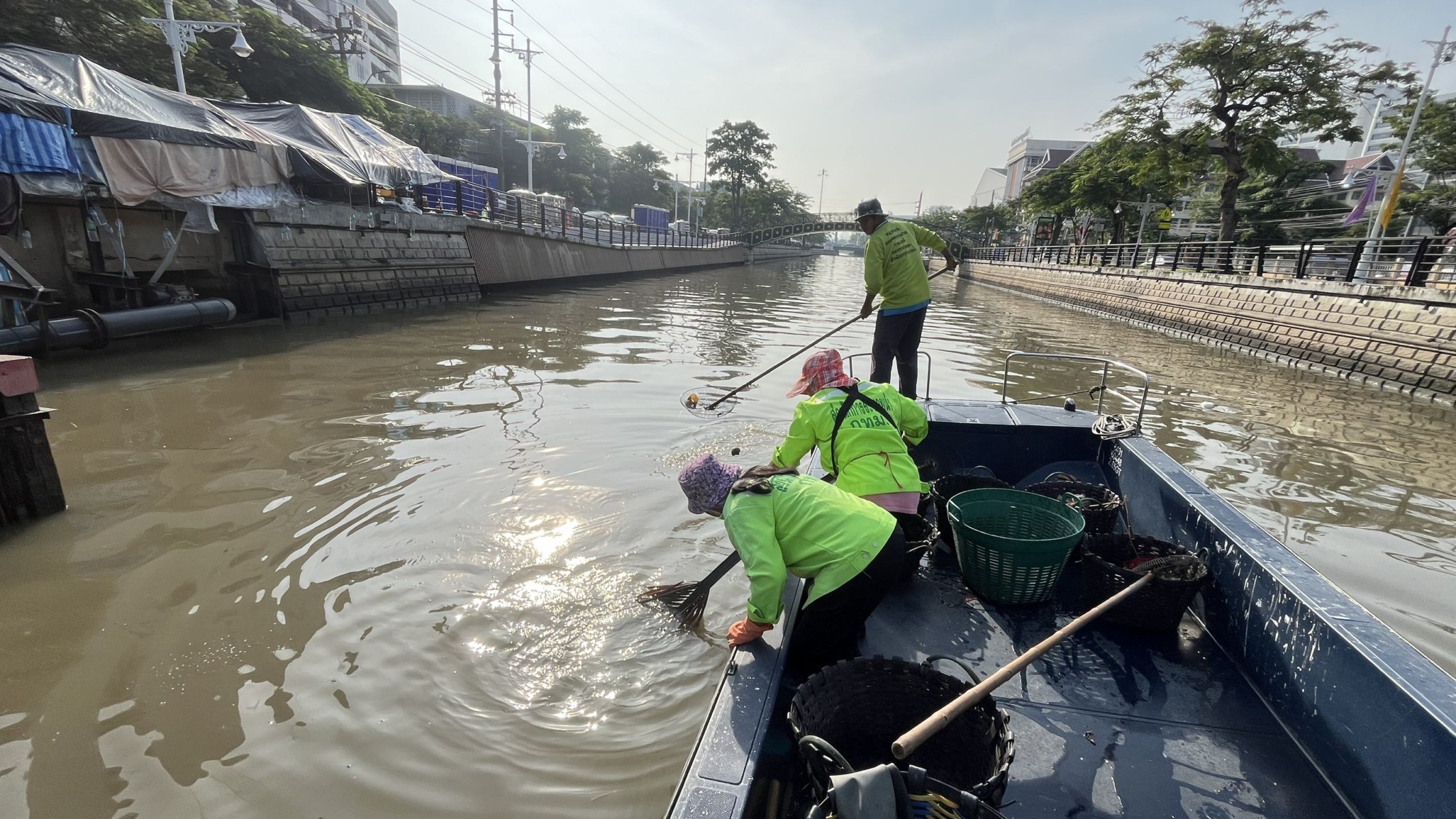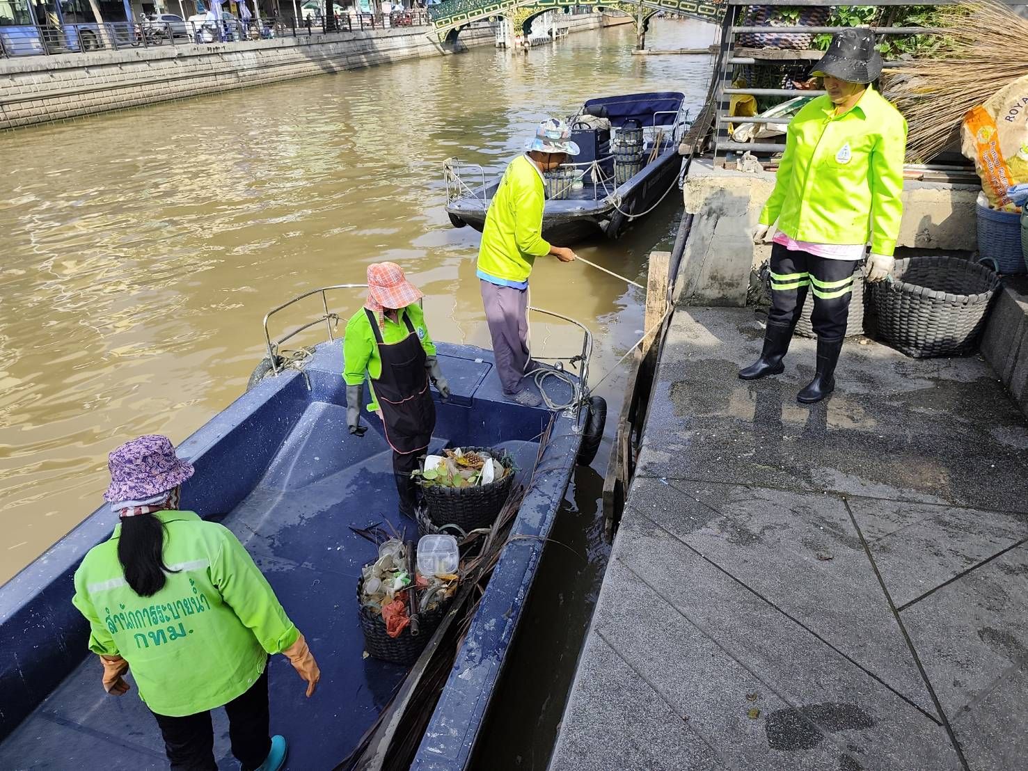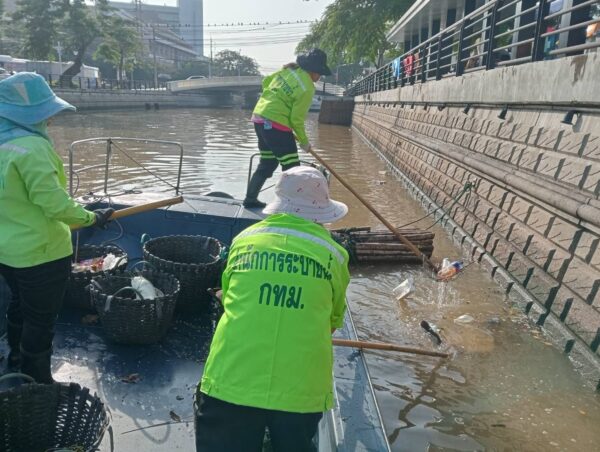 เจ้าหน้าที่ เก็บขยะและวัชพืชเก็บจาก ปตร.เทเวศร์ตลอดช่วงสะพานมัฆวานถึงสี่แยกมหานาค เขตดุสิต เขตพระนคร เขตป้อมปราบศัตรูพ่าย