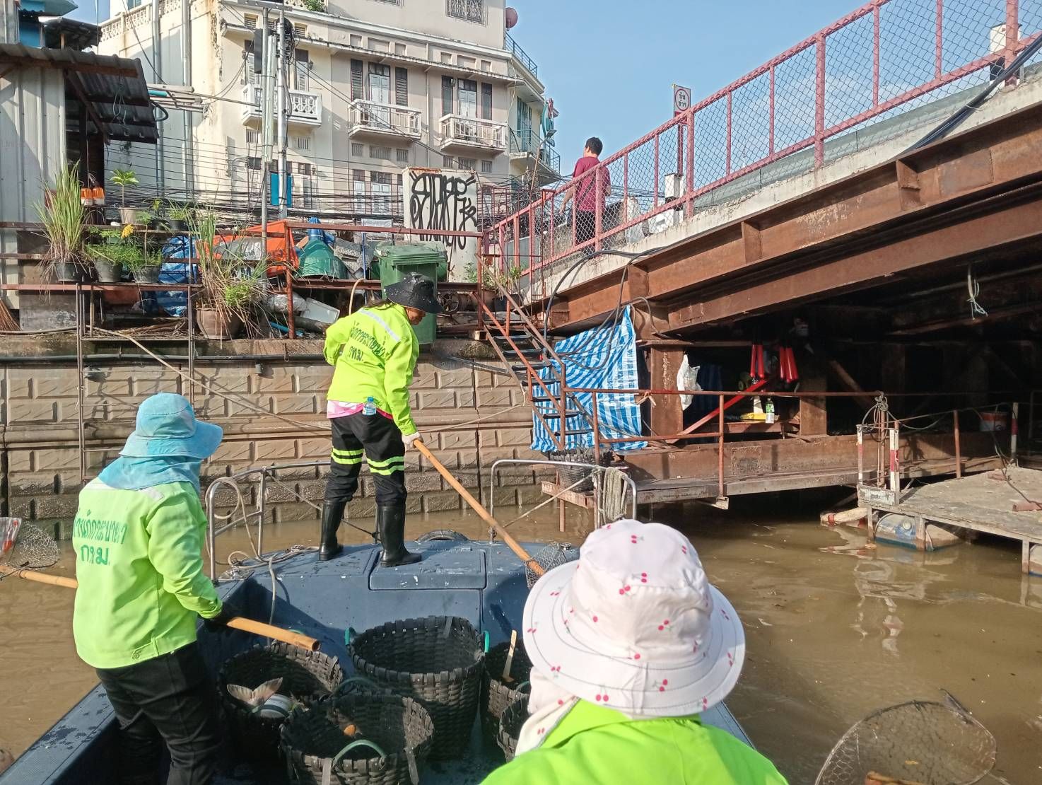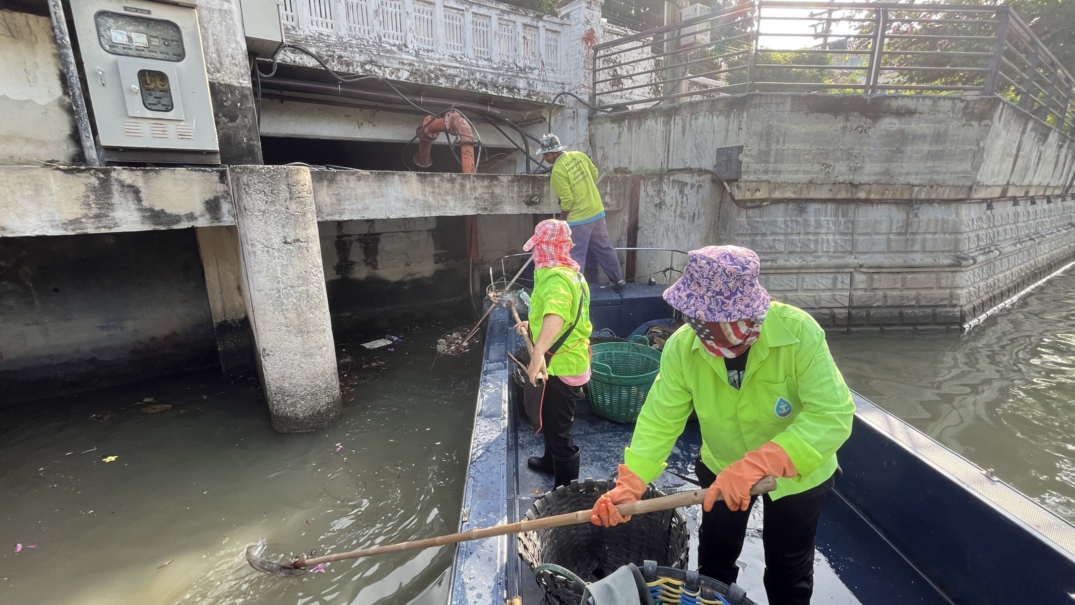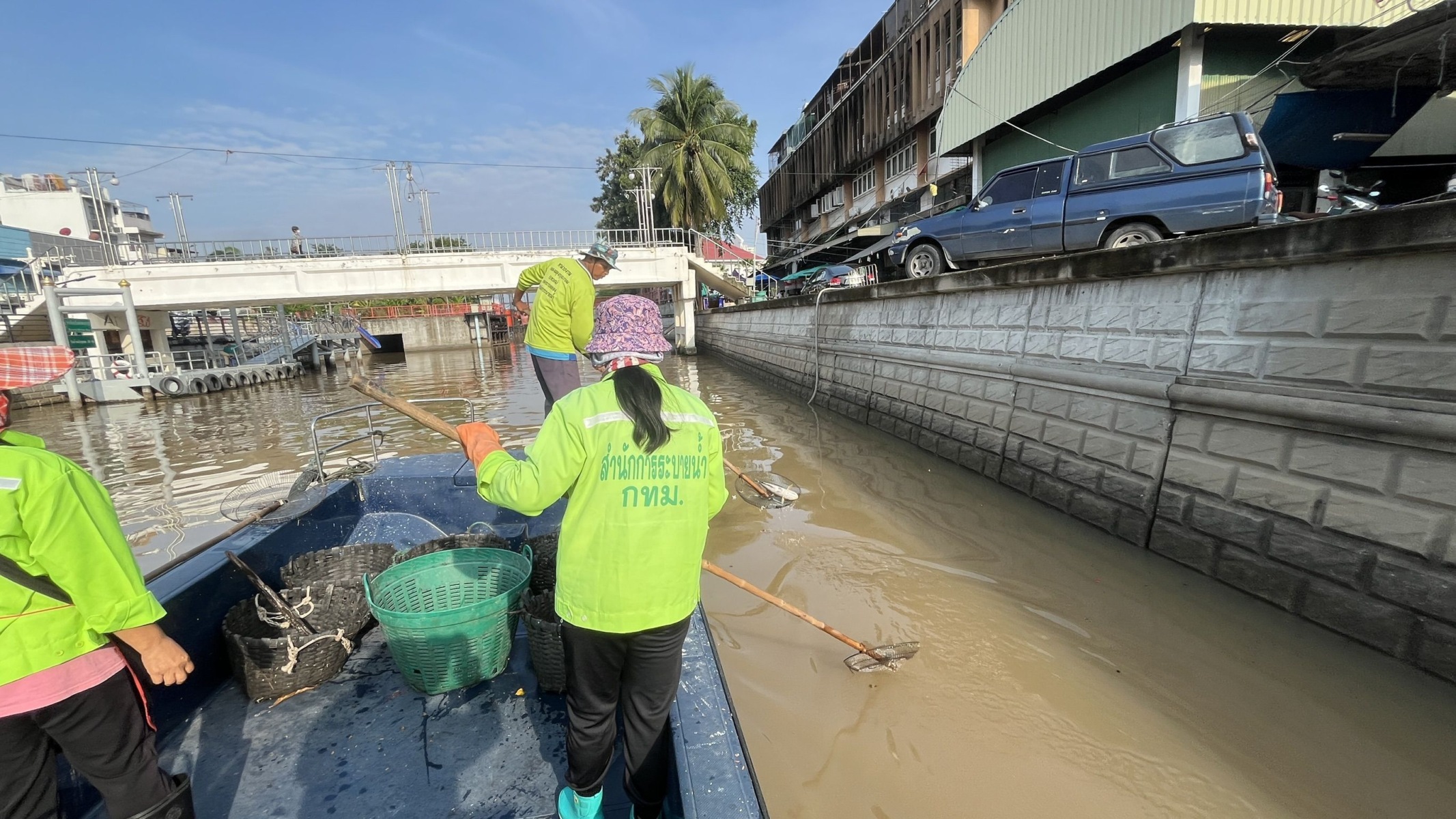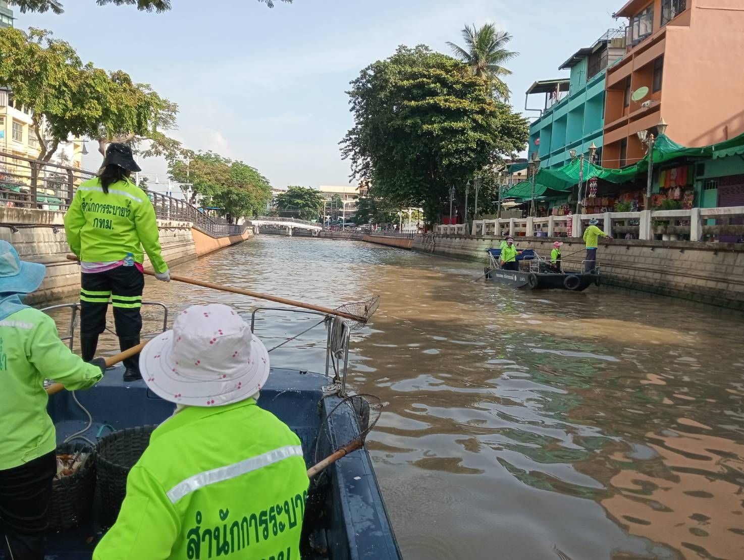 เจ้าหน้าที่ เก็บขยะและวัชพืชเก็บจาก ปตร.เทเวศร์ตลอดช่วงสะพานมัฆวานถึงสี่แยกมหานาค เขตดุสิต เขตพระนคร เขตป้อมปราบศัตรูพ่าย