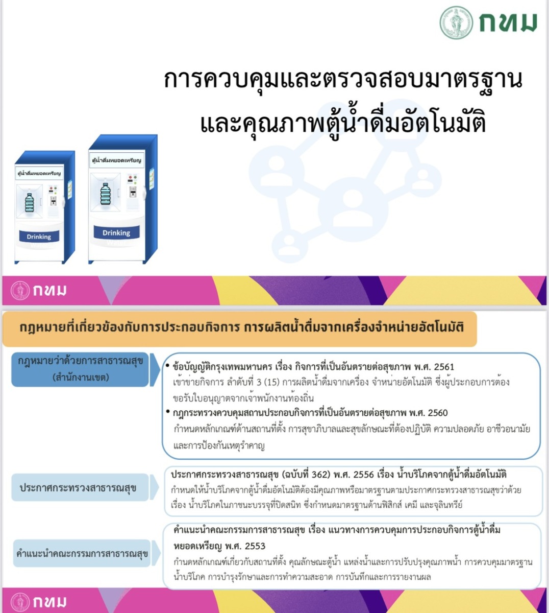 นอกจากนี้ จากการประชุมสภา กทม. สมัยประชุมสามัญ สมัยที่สี่ (ครั้งที่ 3) ประจำปี 2568 มีมติให้ตั้งคณะกรรมการวิสามัญพิจารณา (ร่าง) ข้อบัญญัติ กทม. เรื่อง ควบคุมกิจการผลิตน้ำดื่มจากเครื่องจำหน่ายน้ำดื่มอัตโนมัติ พ.ศ. …. ประกอบด้วยสมาชิกสภา กทม. 9 ท่าน ข้าราชการ กทม. (เจ้าหน้าที่ สนอ. และเจ้าหน้าที่สำนักงานเลขานุการสภา กทม.) 5 ท่าน กำหนดการพิจารณาให้แล้วเสร็จภายใน 90 วัน โดย (ร่าง) ข้อบัญญัติ กทม. เรื่อง ควบคุมกิจการผลิตน้ำดื่มจากเครื่องจำหน่ายน้ำดื่มอัตโนมัติ พ.ศ. …. มีหลักเกณฑ์ทั้งหมด 21 ข้อ ได้กำหนดหลักเกณฑ์การควบคุมตู้น้ำดื่มหยอดเหรียญไว้เป็นการเฉพาะ เพิ่มเติมจากกฎกระทรวงควบคุมสถานประกอบกิจการที่เป็นอันตรายต่อสุขภาพ พ.ศ. 2560 และข้อบัญญัติ กทม. เรื่อง กิจการที่เป็นอันตรายต่อสุขภาพ พ.ศ. 2561 โดย กทม. จะสนับสนุนข้อมูลด้านวิชาการในการจัดทำ (ร่าง) ข้อบัญญัติ กทม. ดังกล่าว ทั้งนี้ กระทรวงสาธารณสุข (สธ.) อยู่ระหว่างการจัดทำ (ร่าง) ประกาศ สธ. เรื่อง หลักเกณฑ์ มาตรการควบคุมการประกอบกิจการผลิตน้ำดื่มจากเครื่องจำหน่าย อัตโนมัติ พ.ศ. …. ซึ่งจะได้นำเรียนให้คณะกรรมการวิสามัญฯ พิจารณาร่วมกับ (ร่าง) ข้อบัญญัติ กทม. ดังกล่าวด้วย เพื่อให้ (ร่าง) ข้อบัญญัติมีความครอบคลุมสามารถใช้ควบคุม กำกับดูแล กิจการผลิตน้ำดื่มจากเครื่องจำหน่ายน้ำดื่มอัตโนมัติได้อย่างมีประสิทธิภาพ เพื่อความปลอดภัยของผู้บริโภค
