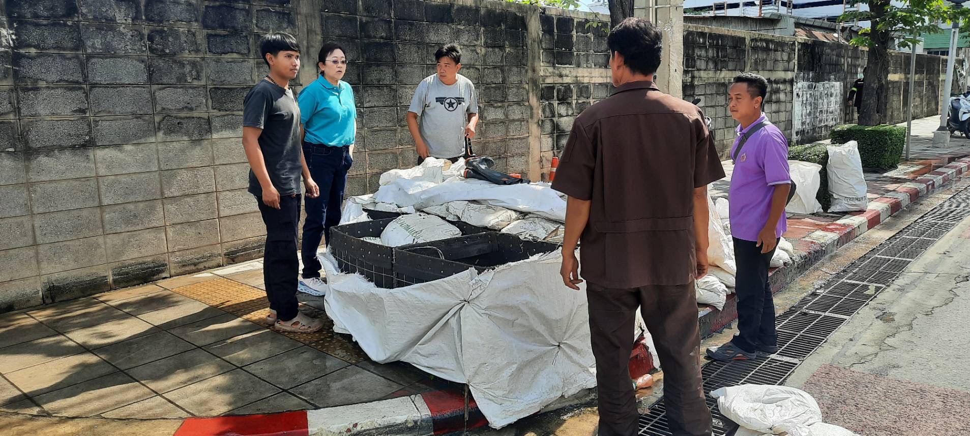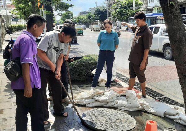 พบเจ้าหน้าที่สำนักการระบาย น้ำ กทม. ร่วมกับฝ่ายโยธา สำนักงานเขตราษฎร์บูรณะ ที่ปฏิบัติงานตั้งแต่เวลา 06.00 น. ดำเนินการวางแนวกระสอบทราย ป้องกันน้ำเอ่อล้นจากท่อระบายน้ำ เข้าท่วมผิวจราจร จาก
