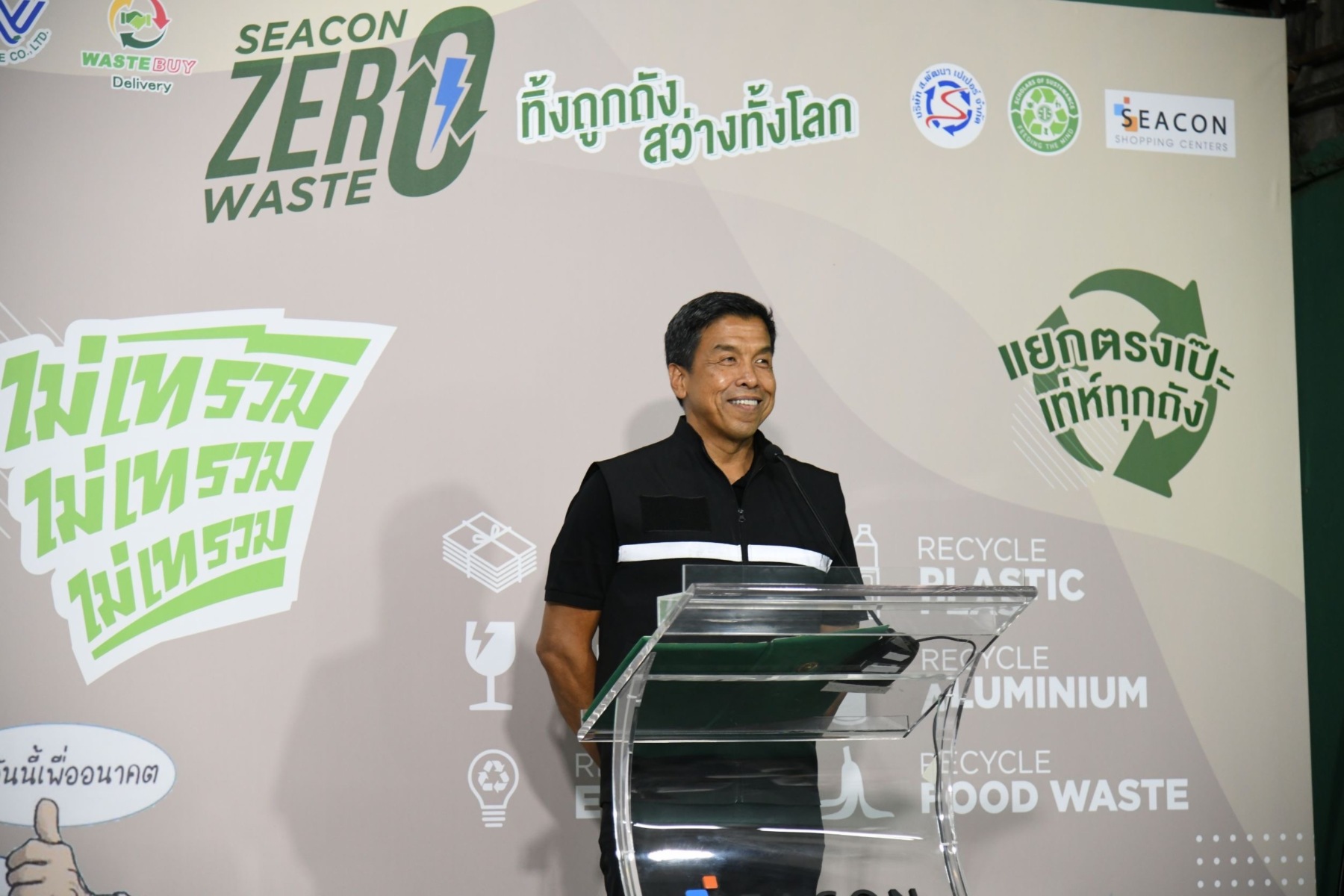 ผู้ว่าราชการกรุงเทพมหานคร ได้กล่าวขอบคุณซีคอนฯ และภาคีเครือข่าย ที่ได้ร่วมกันทำกิจกรรมดังกล่าว ซึ่งห้างซีคอนฯ เป็นห้างที่มาบ่อยเพื่อดูโครงการต่าง ๆ เพื่อสังคม เช่น เรื่องถังฟ้า ป้ายรถเมล์ติดแอร์ โซลาร์เซลล์ที่ใช้พลังงานได้ถึง 40% รวมถึงซีคอน บางแค ได้ไปดูเรื่องการตรวจสุขภาพ ป้ายรถเมล์ และกิจกรรมต่าง ๆ หลายครั้งเหมือนเป็นกิจกรรมแค่สร้างภาพหรือสโลแกน แต่หัวใจของความสำเร็จคือ Action Plan หรือแผนปฏิบัติการ ซึ่งซีคอนสแควร์ได้แสดงให้เห็นแล้วว่า ถ้ามีแผนปฏิบัติการที่ชัดเจน มีความร่วมมือจากภาคีเครือข่าย เราสามารถทำ Zero Waste ให้เป็นจริงได้ และถ้าทำที่ซีคอนสแควร์ได้ ทำทุกห้างได้ เราทำทั้งกรุงเทพฯ ได้ เมื่อก่อนซีคอนฯ จ่ายค่าขยะเยอะ แต่ตอนนี้จ่ายน้อยลง จริง ๆ แล้ว ไม่ได้อยากได้เงิน เพราะกรุงเทพมหานครใช้งบประมาณในการกำจัดขยะประมาณ 7,000 ล้านบาท แต่เก็บได้แค่ 600 ล้าน เป็นกิจการที่ขาดทุนมหาศาล อันนี้เป็นตัวอย่างที่ดีมาก ๆ เพราะกรุงเทพมหานครไม่ได้ทำคนเดียว แต่หมายถึงภาคีเครือข่าย หมายถึงการปลูกฝังนิสัยที่ดีให้กับลูกค้า ให้เด็กที่มาที่ห้าง ถ้ามีนิสัยที่ดี รู้จักวิธีแยกขยะ เราสนับสนุน แล้วเขากลับไปทำต่อที่บ้าน ที่ชุมชน สุดท้ายจะเกิดได้อย่างรวดเร็ว ขอให้ซีคอนสแควร์เป็นต้นแบบให้คนมาดูงานที่นี่ จะได้เห็นว่าการทำ Zero Waste ไม่ได้ยาก แต่ขึ้นอยู่กับฝ่ายบริหารและความร่วมมือของทุกคนในองค์กรทำให้สำเร็จได้