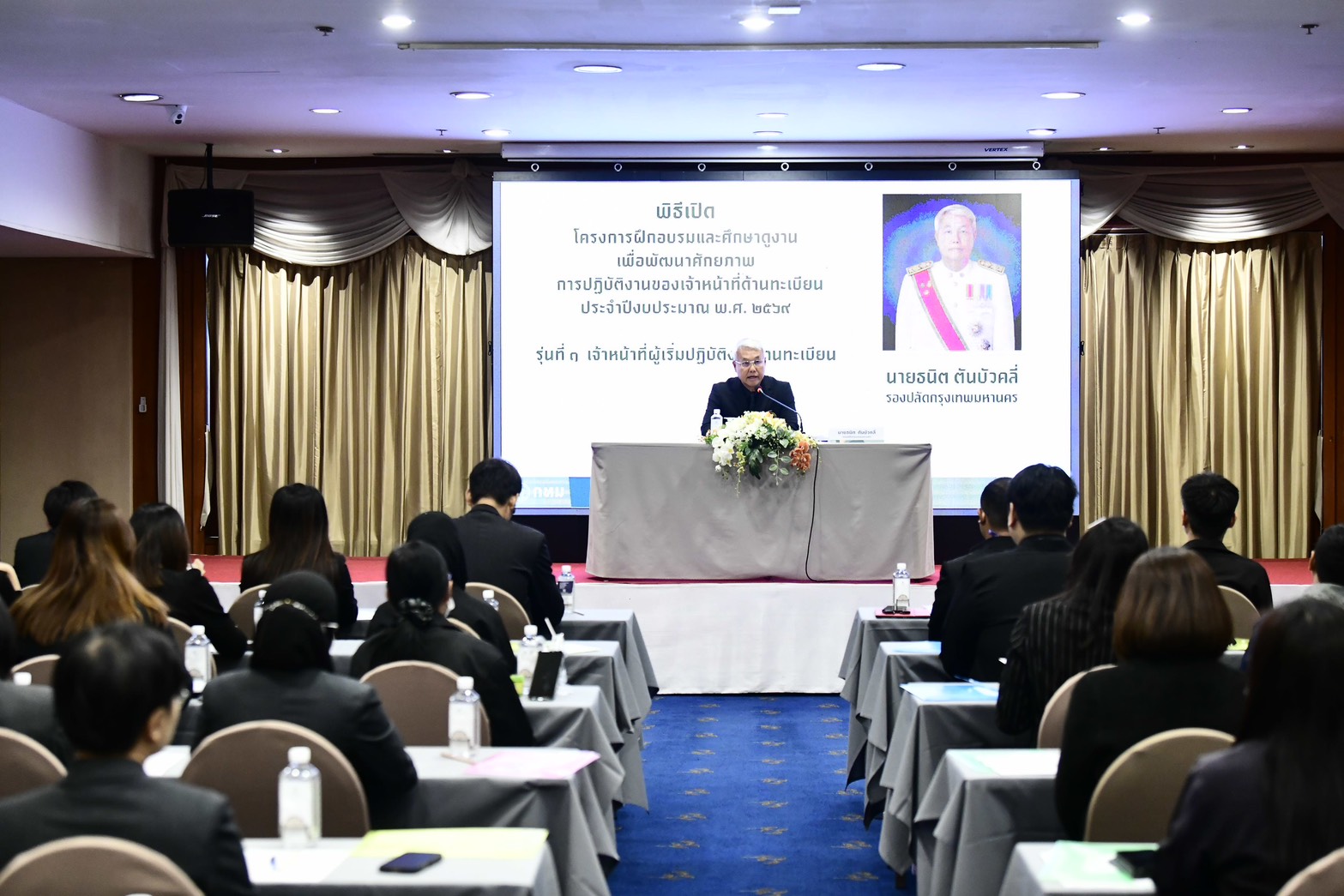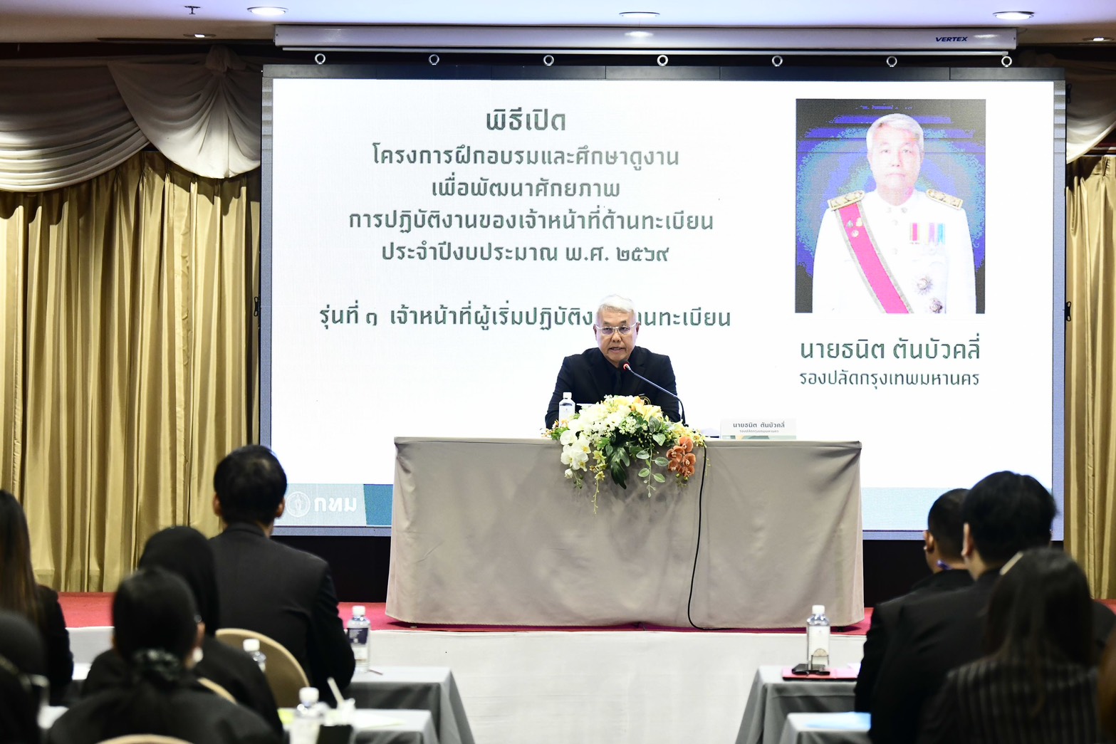 (28 ต.ค. 68) นายธนิต ตันบัวคลี่ รองปลัดกรุงเทพมหานคร เป็นประธานพิธีเปิดโครงการฝึกอบรมและศึกษาดูงานเพื่อพัฒนาศักยภาพการปฏิบัติงานของเจ้าหน้าที่ด้านทะเบียน รุ่นที่ 1 ประจำปีงบประมาณ พ.ศ. 2569 โดยกล่าวว่า การปฏิบัติงานของฝ่ายทะเบียน เป็นงานบริการที่ต้องพบปะประชาชนที่หลากหลาย ประกอบกับปัจจุบันกฎหมาย ระเบียบทางทะเบียนมีการเปลี่ยนแปลงไป จึงต้องศึกษากฎหมาย ระเบียบ ขั้นตอน วิธีปฏิบัติให้ละเอียด ถูกต้อง และชัดเจน รวมถึงต้องมีใจให้บริการอย่างเต็มที่ และที่สำคัญ ต้องไม่ใช้อำนาจหน้าที่ไปในทางที่ไม่ถูกต้อง หรือทุจริตต่อหน้าที่ การพัฒนาศักยภาพบุคลากรให้มีความรู้ ความสามามารถ และ สมรรถนะในการปฏิบัติงาน จึงเป็นเรื่องสำคัญ เนื่องจากบุคลากรเป็นผู้นำนโยบายไปสู่การปฏิบัติ เพื่อให้เกิดผลดีต่อประเทศชาติและประชาชน รวมทั้งสร้างภาพลักษณ์ที่ดีให้กับกรุงเทพมหานคร
