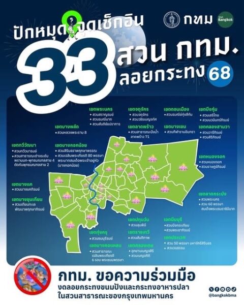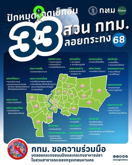พร้อมกันนี้ กรุงเทพมหานครได้เปิดพื้นที่สวนสาธารณะของกรุงเทพมหานคร จำนวน 33 แห่ง ในพื้นที่เขต 21 เขต ให้ลอยกระทงจนถึงเวลา 24.00 น. หากใครไม่สะดวกออกไปร่วมลอยกระทงในจุดต่าง ๆ ยังสามารถลอยกระทงออนไลน์ผ่านเว็บไซต์ greener.bangkok.go.th โดยสามารถเลือกสวนสาธารณะที่ต้องการ หรือไอคอนสยาม พร้อมเลือกกระทงตามสไตล์ที่ชอบ แล้วลอยกระทงได้ตั้งแต่บัดนี้ไปจนถึงเวลา 24.00 น. ของวันนี้ (5 พ.ย. 68) รวมถึงมีการจัดงานลอยกระทงอีก 110 แห่ง (ครอบคุลมพื้นที่ 36 เขต)