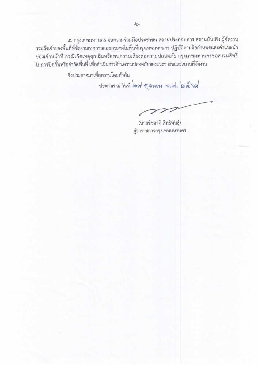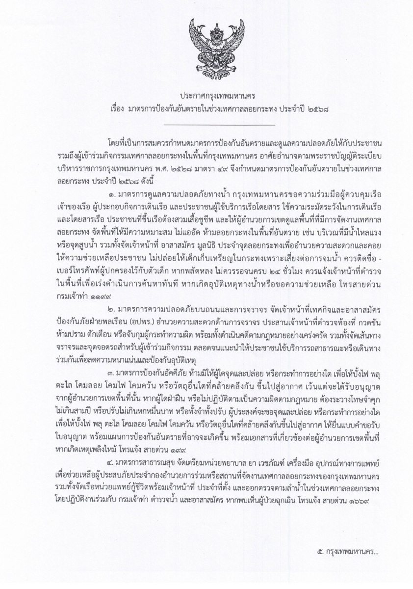 โฆษกของกรุงเทพมหานคร กล่าวในตอนท้ายว่า กรุงเทพมหานครขอความร่วมมือทุกภาคส่วนจัดงานเทศกาลลอยกระทง ตามแนวคิด “ลอยกระทงวิถีไทย ปลอดภัย ใส่ใจสิ่งแวดล้อม” ภายใต้มาตรการ 5 ปลอด ประกอบด้วย 3 ปลอดมลพิษ ได้แก่ ปลอดกระทงขนมปัง ปลอดวัสดุไม่ธรรมชาติ 100% ปลอดมลพิษทางอากาศ ลดการใช้พลังงาน อาทิ ลดการเดินทาง ลอยกระทงในสวนสาธารณะใกล้บ้าน ลดการจุดธูป งดการสูบบุหรี่และบุหรี่ไฟฟ้า และ 2 ปลอดภัย ได้แก่ ปลอดภัยจากประทัด โคมลอย พลุ และปลอดภัยจากอุบัติเหตุ รวมถึงงดจำหน่ายอาหารและเครื่องดื่มที่มีแอลกอฮอล์ภายในสวนสาธารณะอย่างเด็ดขาด หากฝ่าฝืนจะถูกดำเนินคดีตามกฎหมาย ที่สำคัญงดใช้กระทงโฟม และกระทงที่ทำจากขนมปัง อาหารปลา และอาหารสัตว์ ในสวนสาธารณะซึ่งเป็นบึงน้ำแบบปิด เพราะจะส่งผลกระทบต่อระบบนิเวศของบึงน้ำภายในสวน อีกทั้งลอยกระทงในรูปแบบ 1 ครอบครัว 1 กระทง เพื่อลดปริมาญขยะกระทง ซึ่งจะมีส่วนช่วยให้กรุงเทพมหานครสามารถดำเนินการจัดเก็บ และคัดแยกกระทงได้อย่างเป็นระบบ รวดเร็วที่สุด