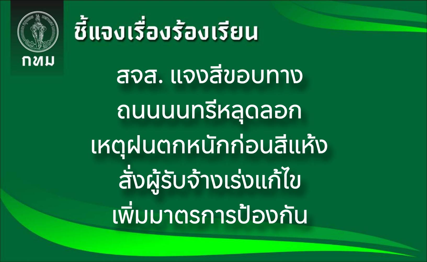 ทั้งนี้ งานดังกล่าวอยู่ภายใต้ความรับผิดชอบของผู้รับจ้างตามสัญญา สจส. ได้สั่งการให้ผู้รับจ้างแก้ไขให้เป็นไปตามมาตรฐานของสัญญา พร้อมปรับแผนการทำงานโดยเพิ่มการตรวจสอบและเฝ้าระวังสภาพอากาศอย่างใกล้ชิดและจัดหาอุปกรณ์ป้องกันที่เหมาะสม เพื่อป้องกันไม่ให้เกิดปัญหาลักษณะนี้ซ้ำอีก
