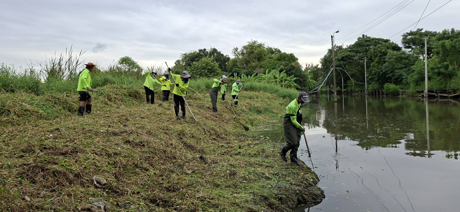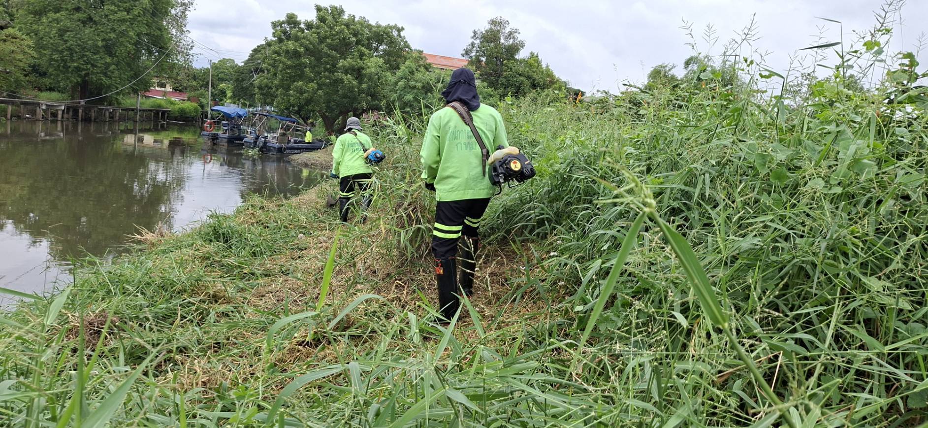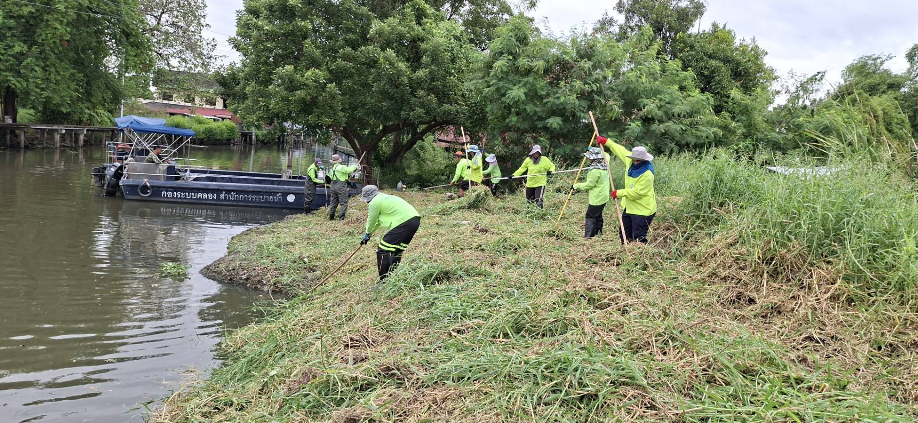 เจ้าหน้าที่ เก็บวัชพืชตัดหญ้าริมคลองหนึ่ง ช่วงโรงเรียนแดงเป้า (สิงสุขบูรณะ) เขตลาดกระบัง