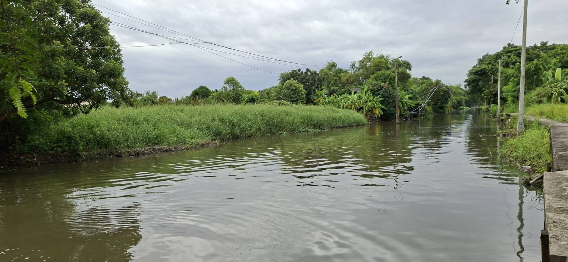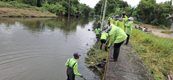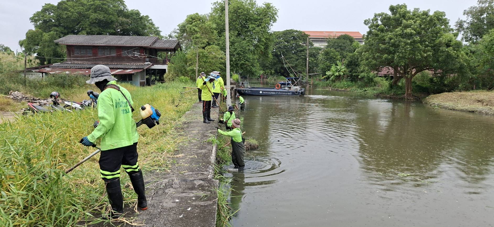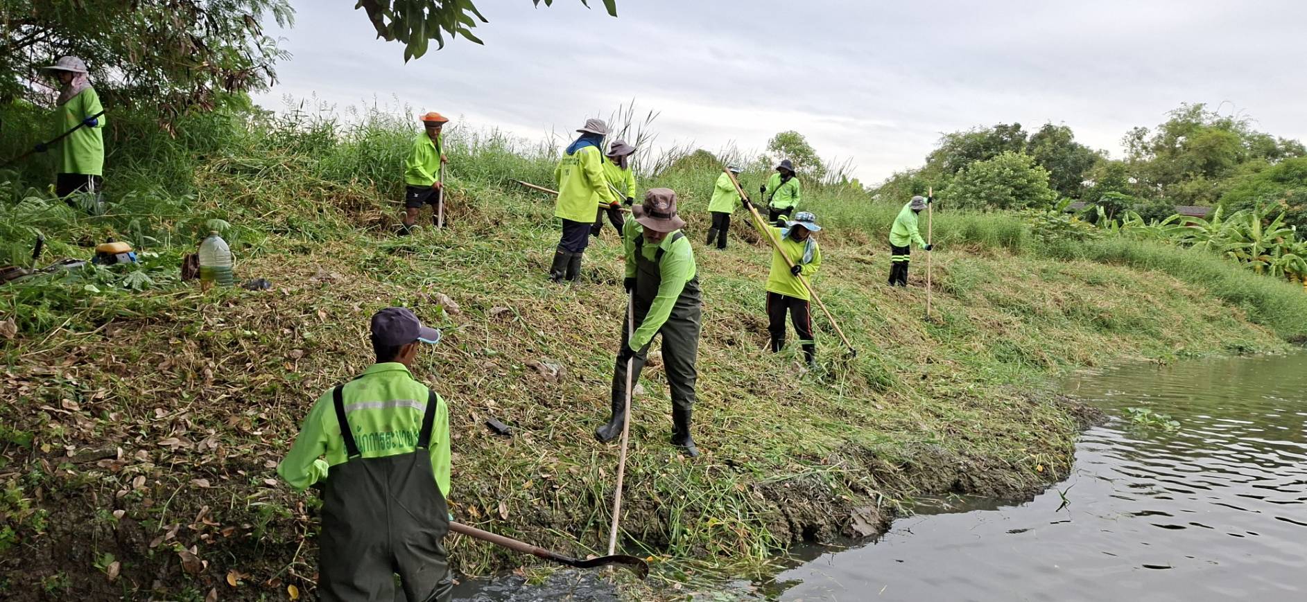 เจ้าหน้าที่ เก็บวัชพืชตัดหญ้าริมคลองหนึ่ง ช่วงโรงเรียนแดงเป้า (สิงสุขบูรณะ) เขตลาดกระบัง