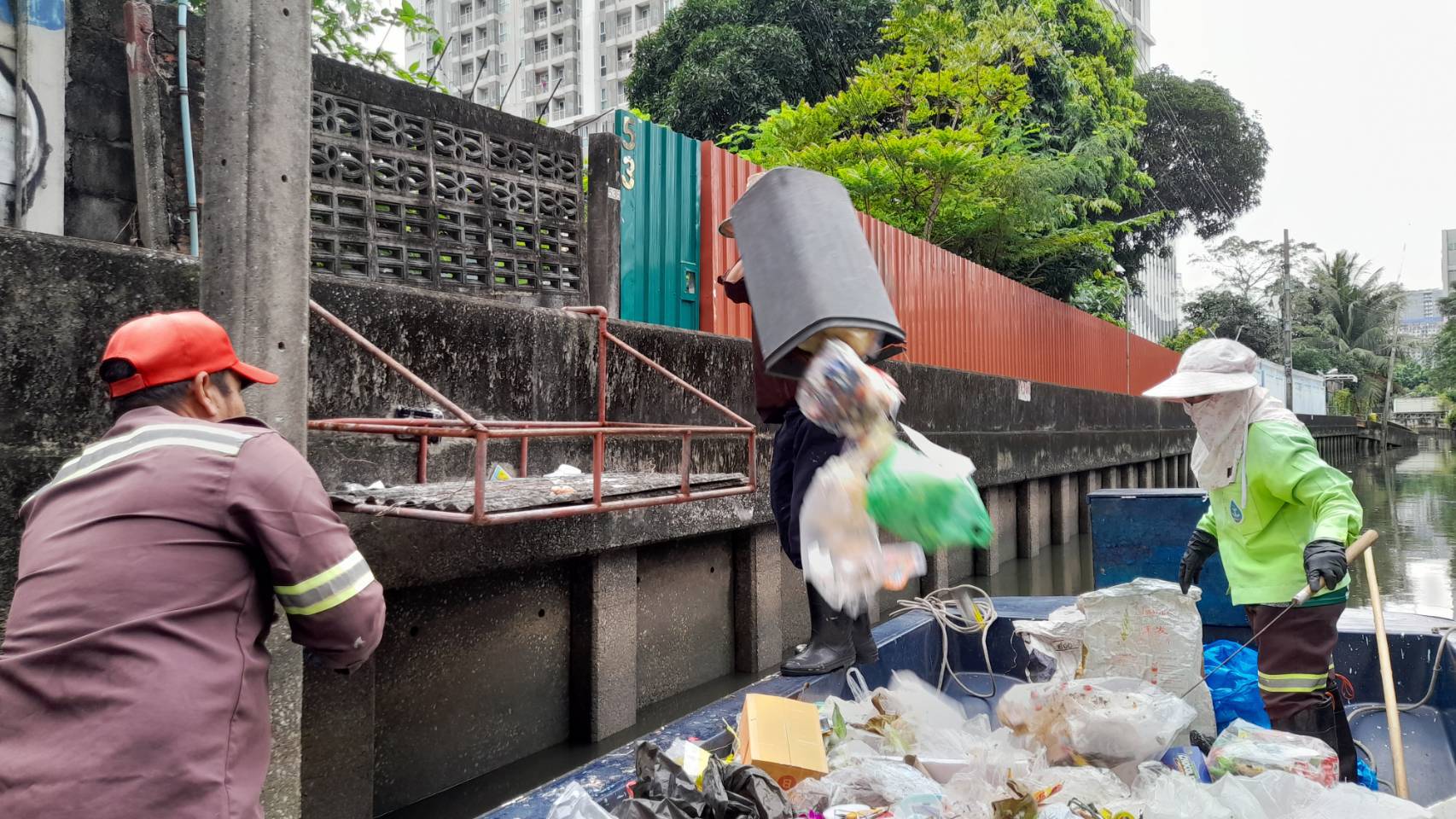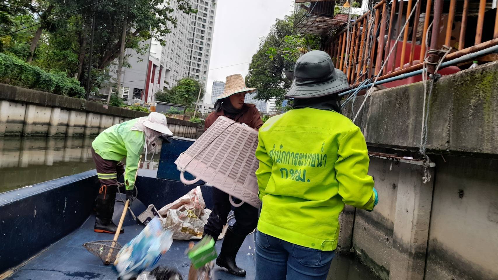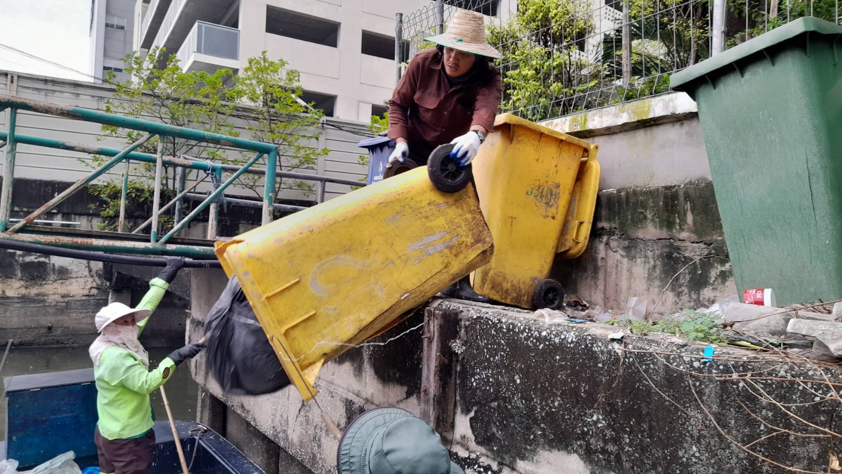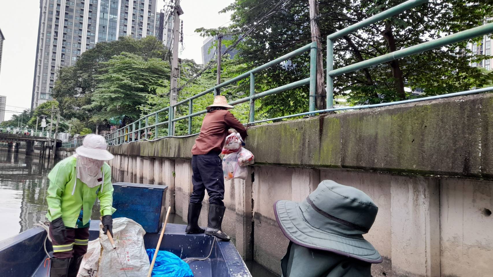 เจ้าหน้าที่ เก็บขยะแนวสันเขื่อนและตักขยะในคลองสามเสน เขตห้วยขวาง เขตดินแดงและเขตราชเทวี