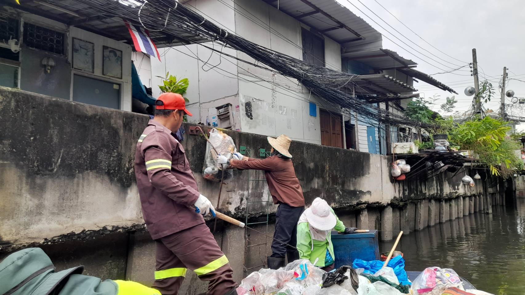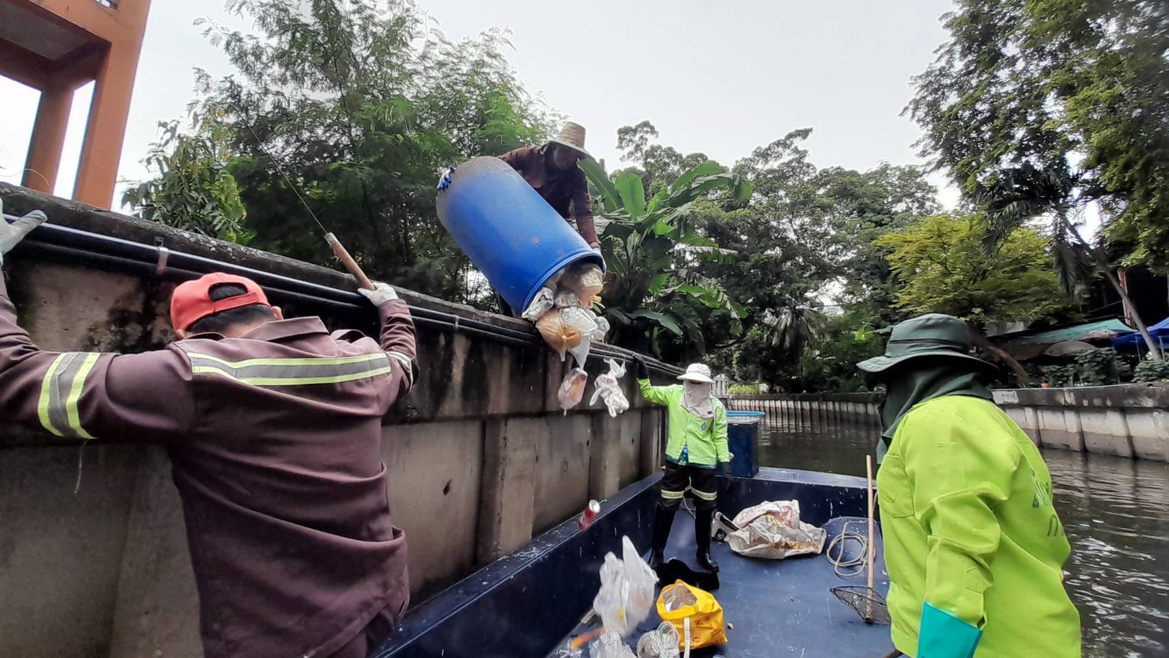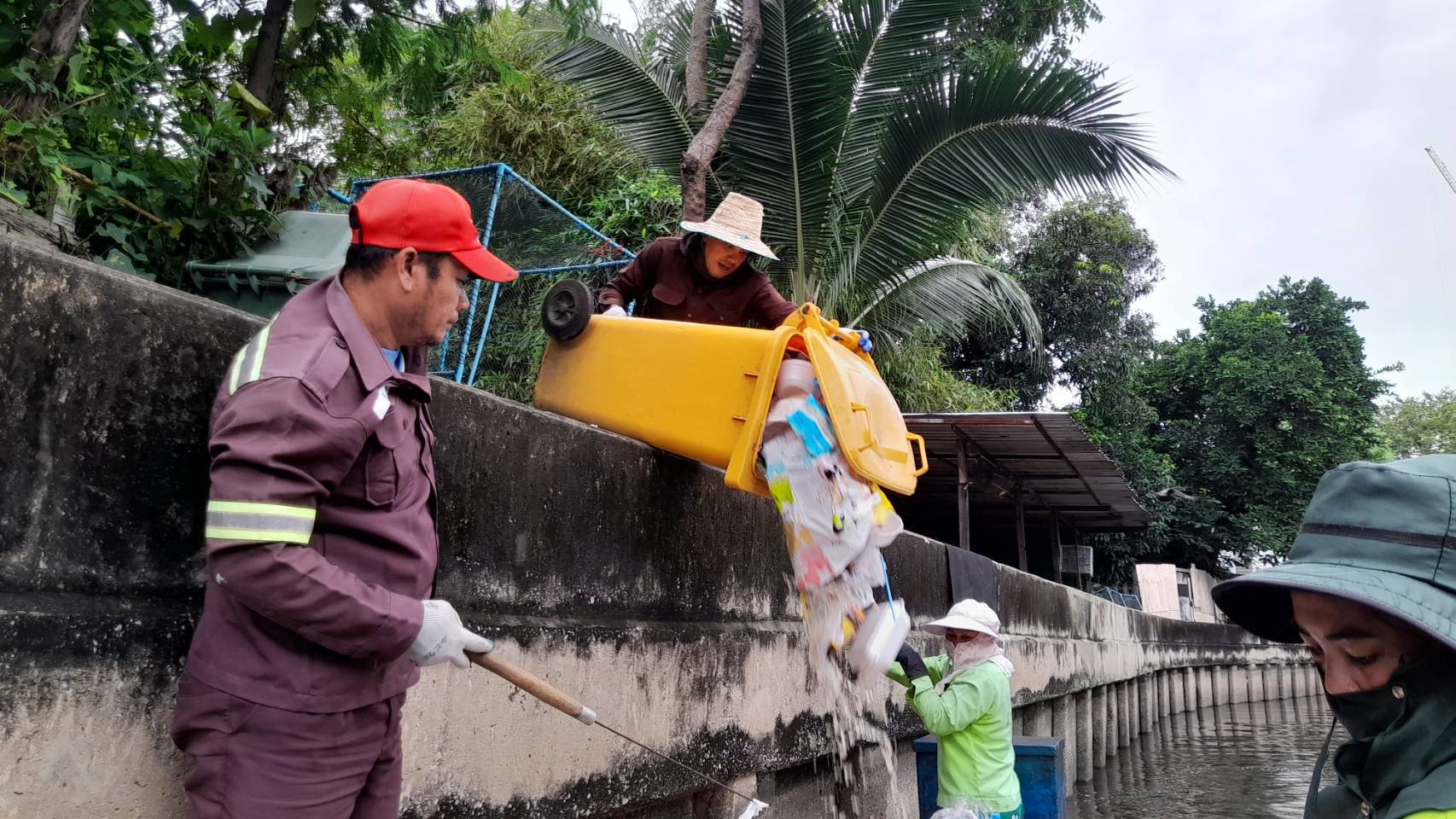 เจ้าหน้าที่ เก็บขยะแนวสันเขื่อนและตักขยะในคลองสามเสน เขตห้วยขวาง เขตดินแดงและเขตราชเทวี
