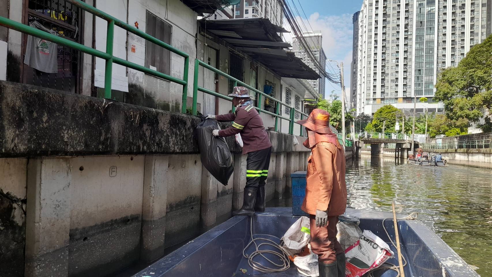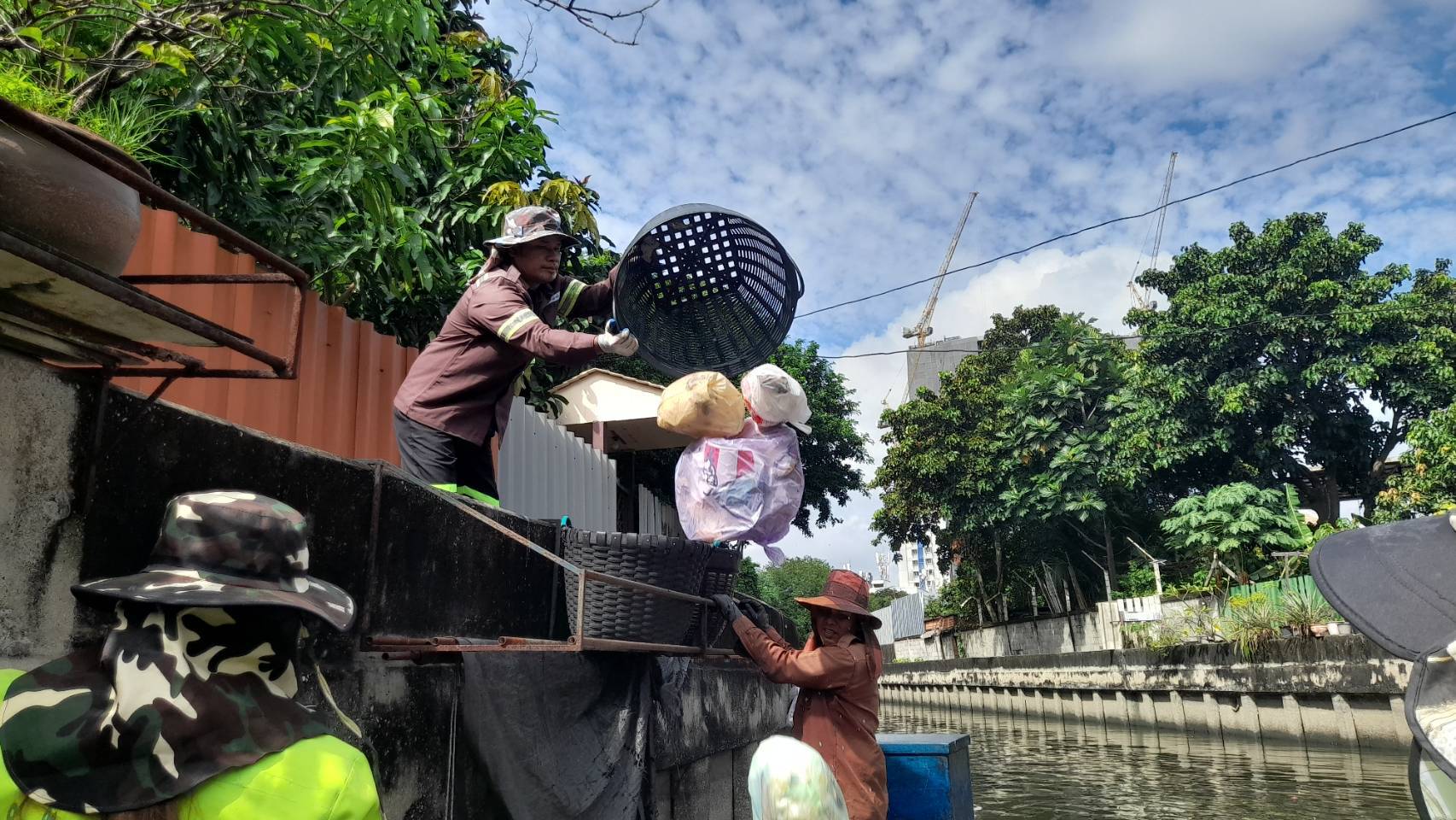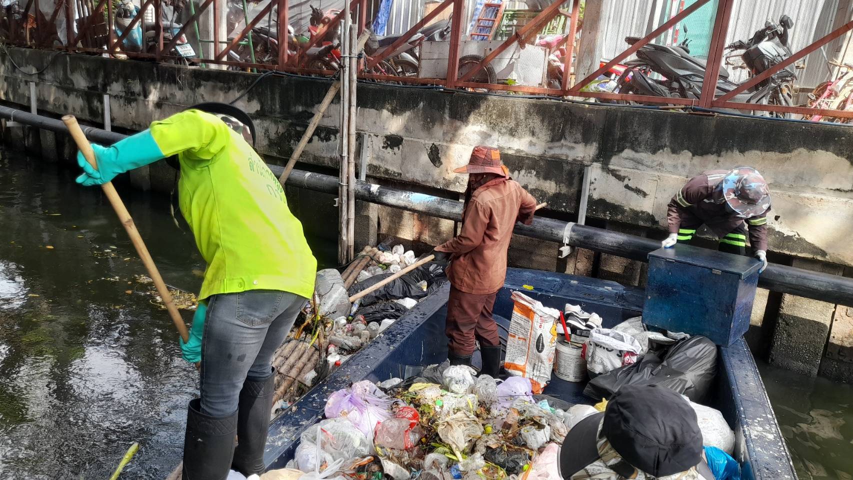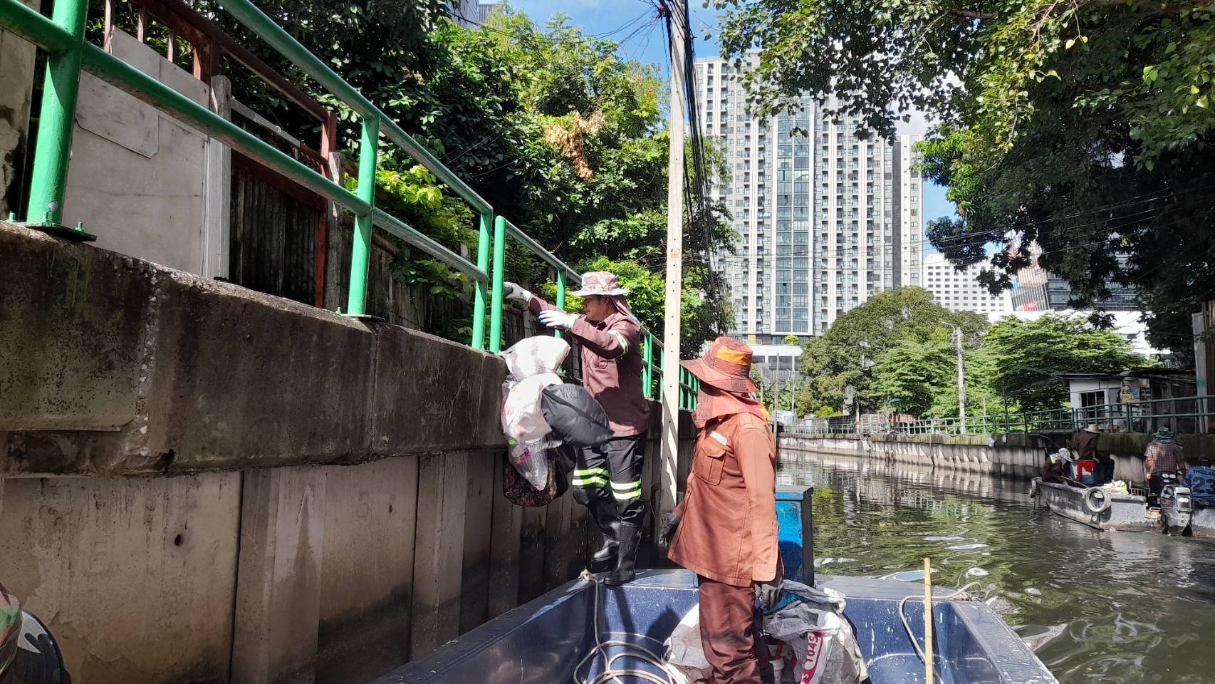เจ้าหน้าที่ เก็บขยะแนวสันเขื่อนและตักขยะในคลองสามเสน เขตห้วยขวาง เขตดินแดงและเขตราชเทวี